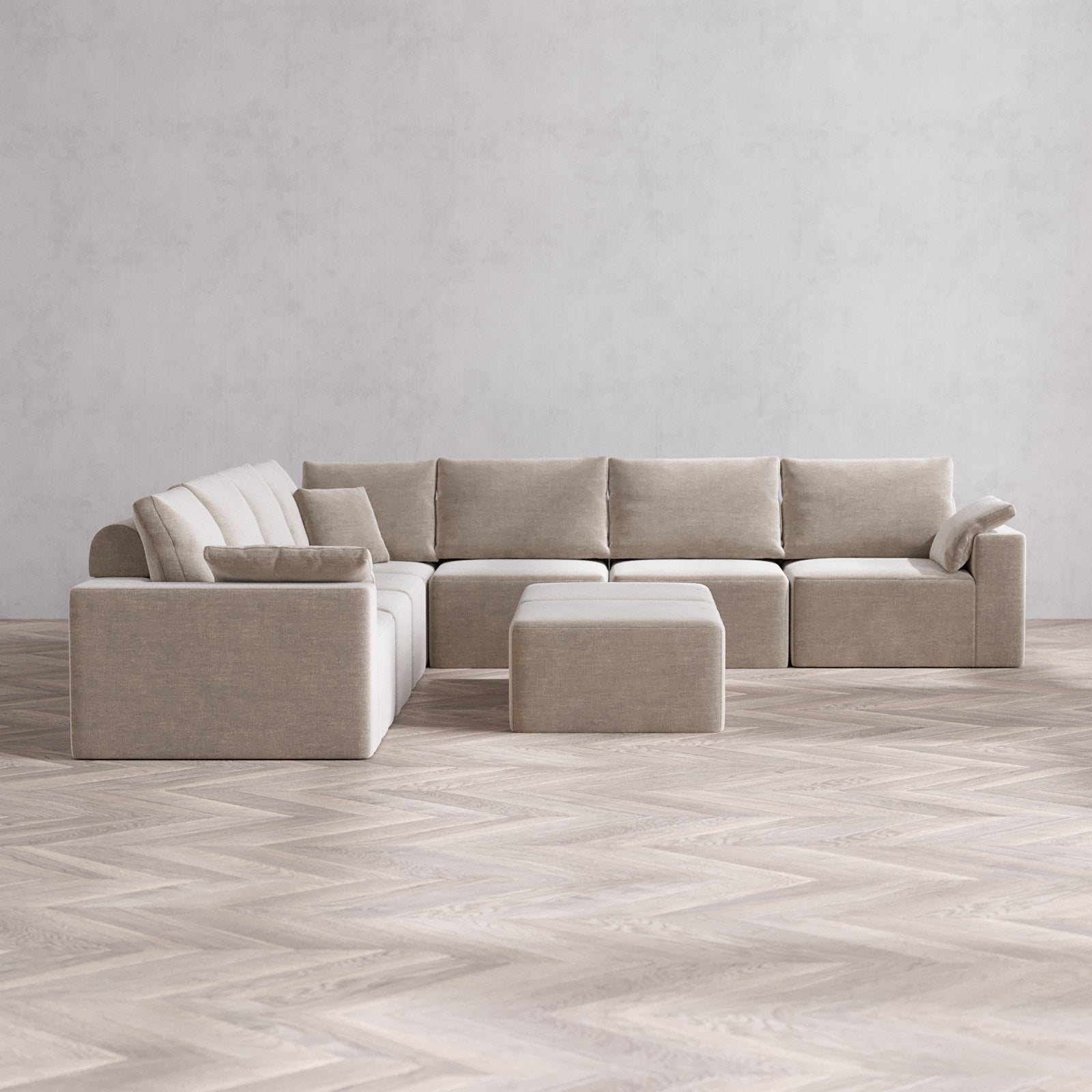 Modular Washable 7-Seater Corner Sectional + Ottoman Bench Cloud + Bolster Sofa | Satin Velvet in Caraway
