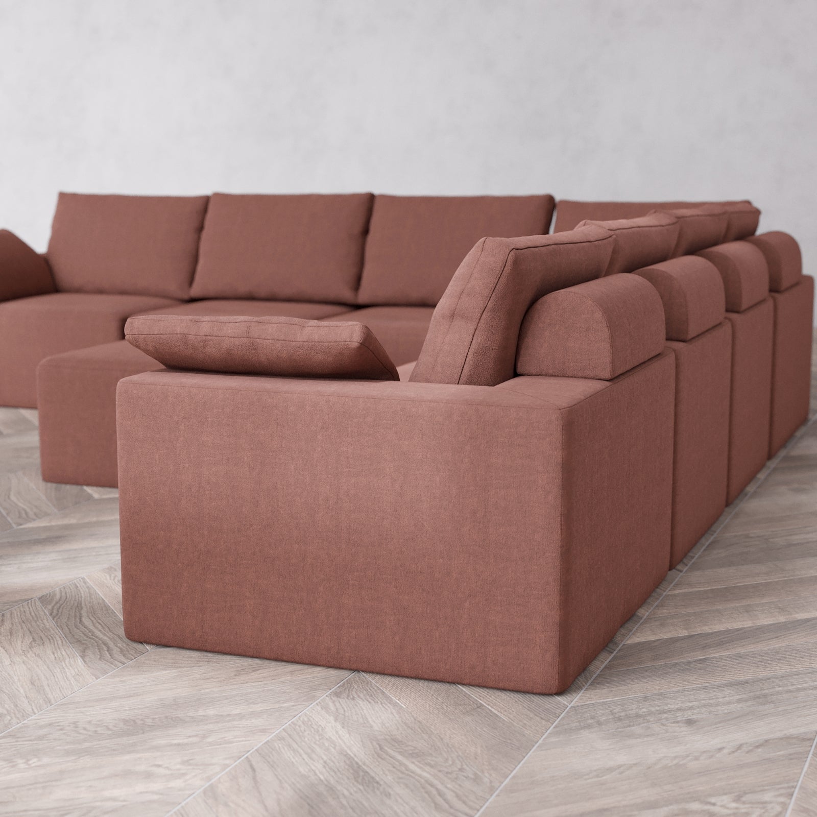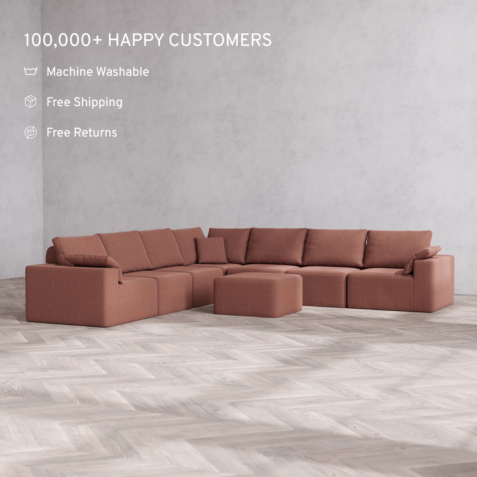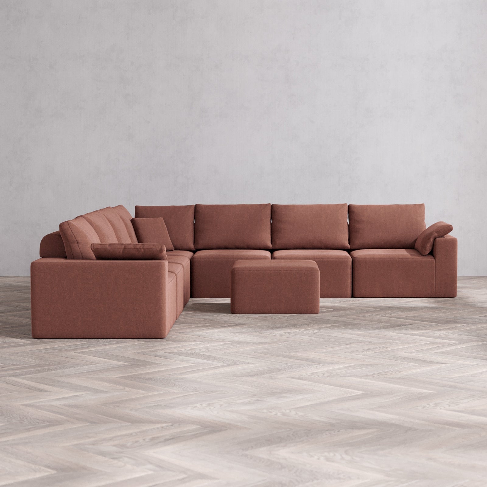 Modular Washable 7-Seater Corner Sectional + Ottoman Cloud + Bolster Sofa | Heirloom Velvet in Sumac
