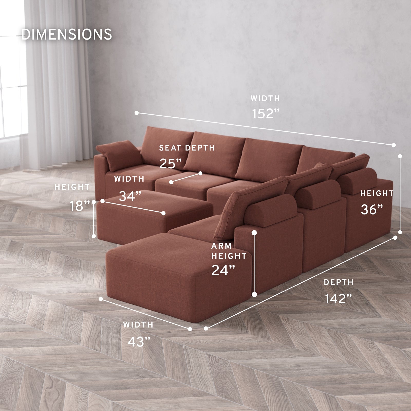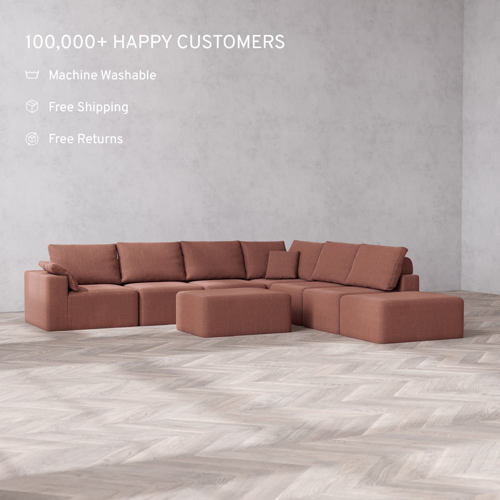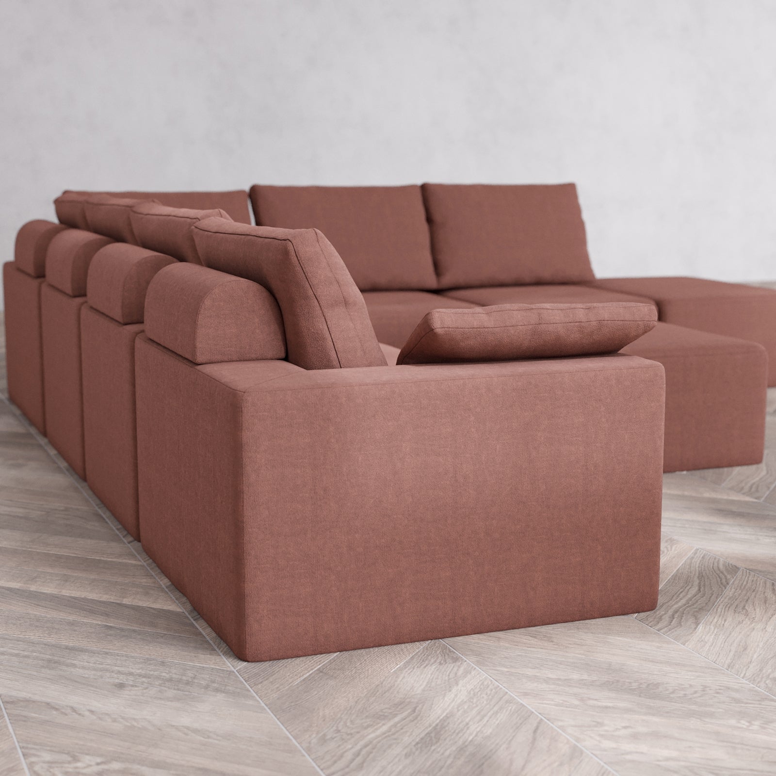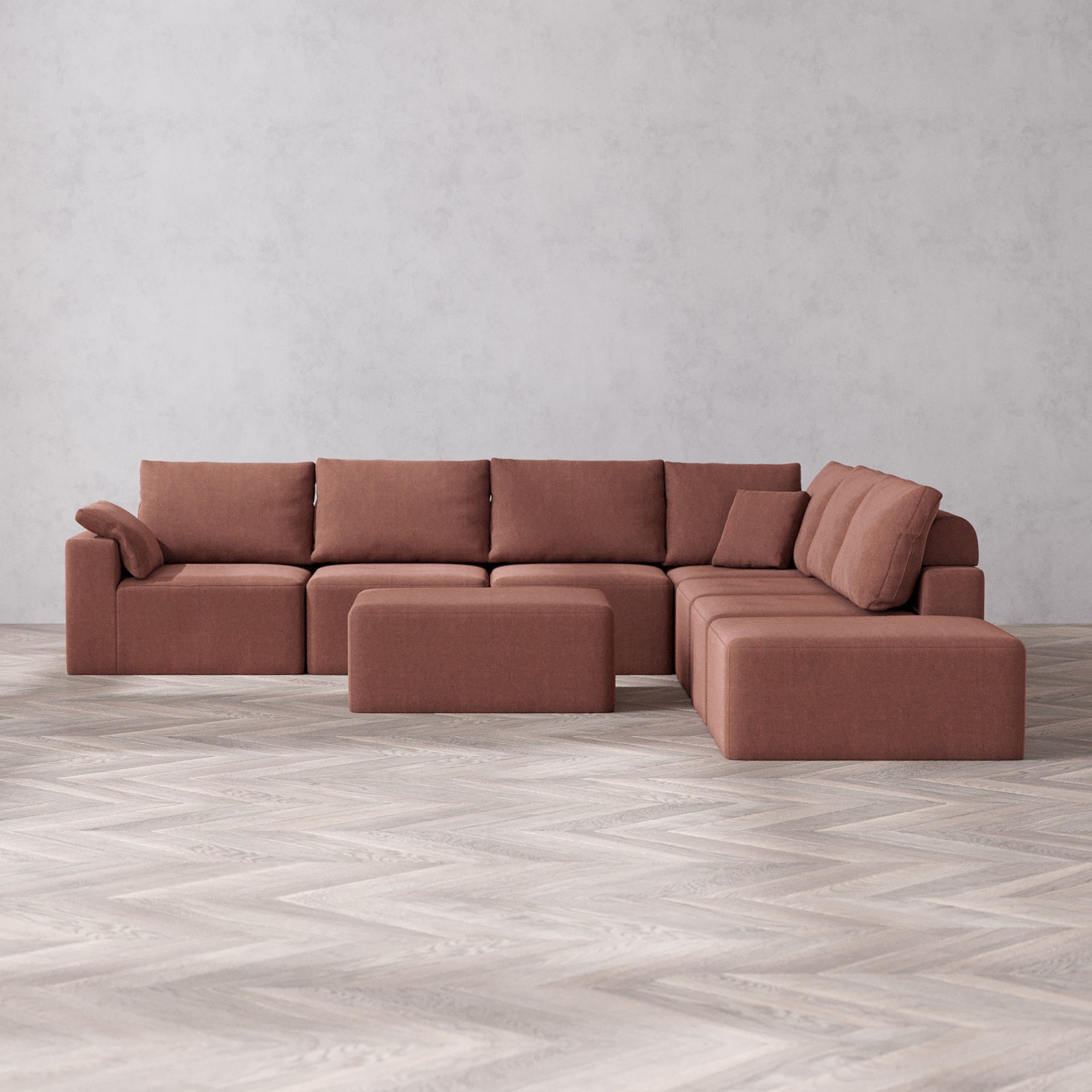 Modular Washable 7-Seater Open End Corner Sectional + Chaise Ottoman Cloud + Bolster Sofa | Left-Facing Arm | Heirloom Velvet in Sumac