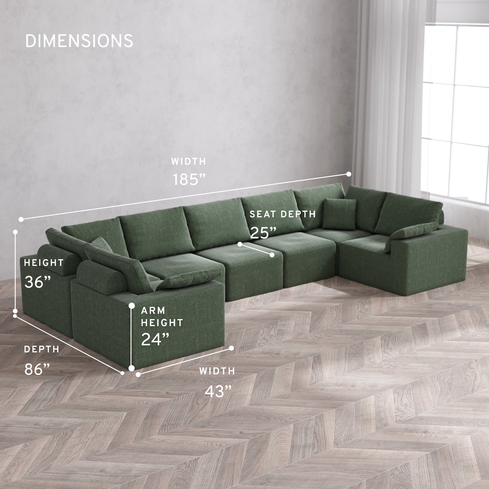 185” Wide, 86” Deep, 36” Tall