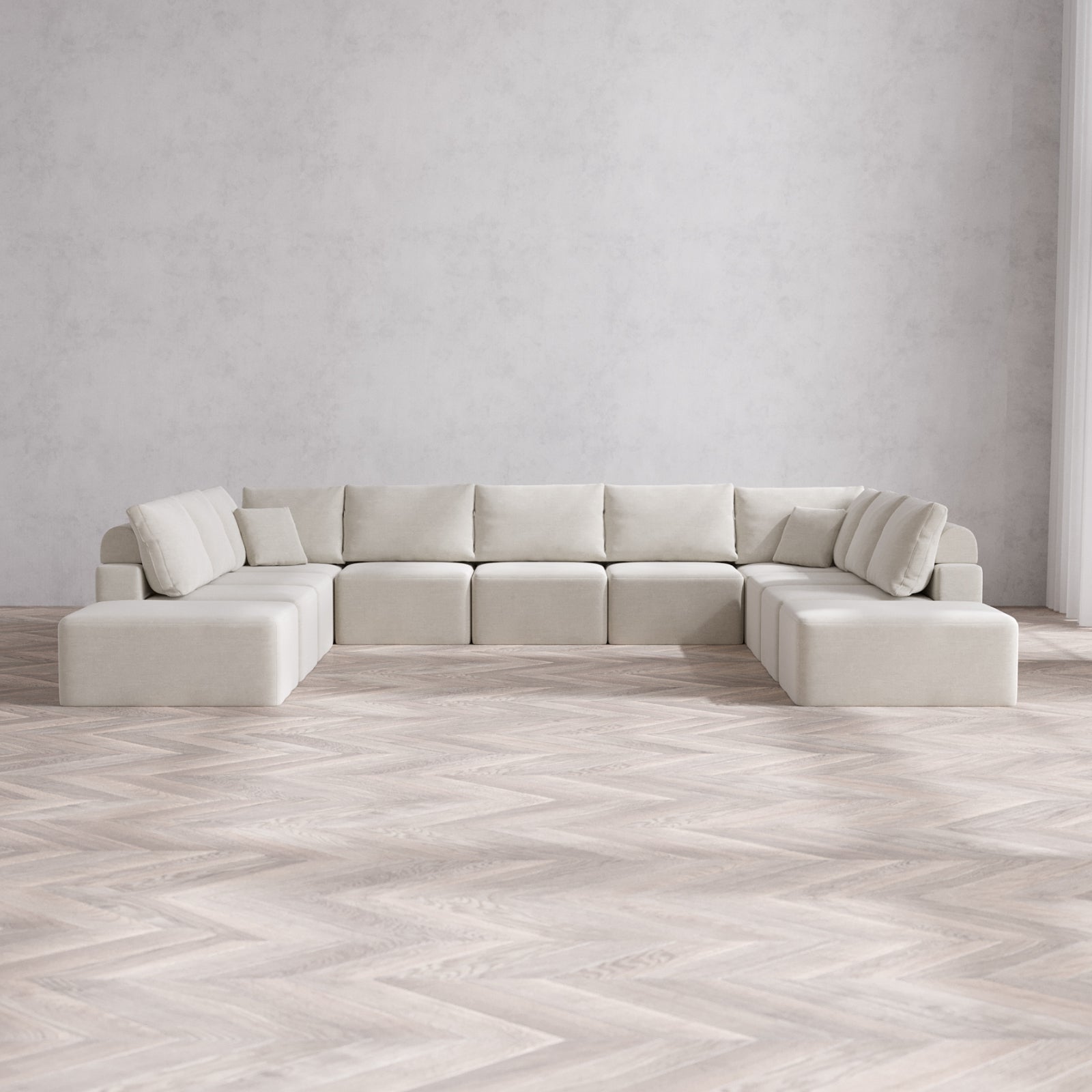 Modular Washable 11-Seater Open-Ends U Sectional Cloud + Bolster Sofa | Satin Velvet in Cashew