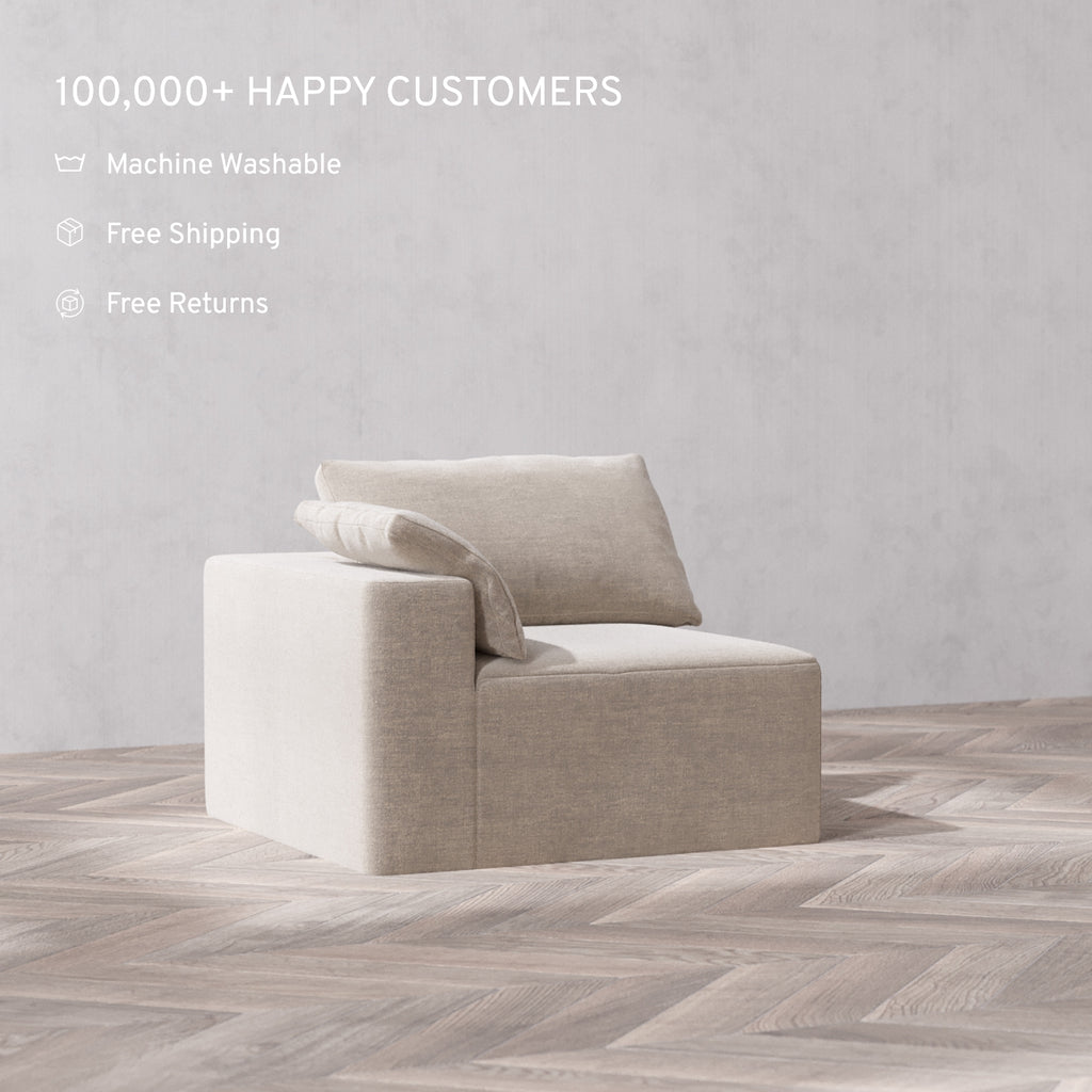 The Only Washable Cloud Sofa: With a waterproof frame and fabrics that resist pets, stains, and spills, this sofa is made to handle everyday messes. Our patent-pending covers are machine washable and fully interchangeable—buy extra sets to change up your look anytime.