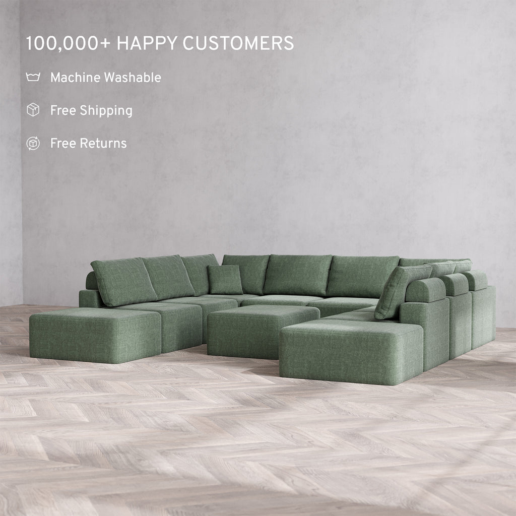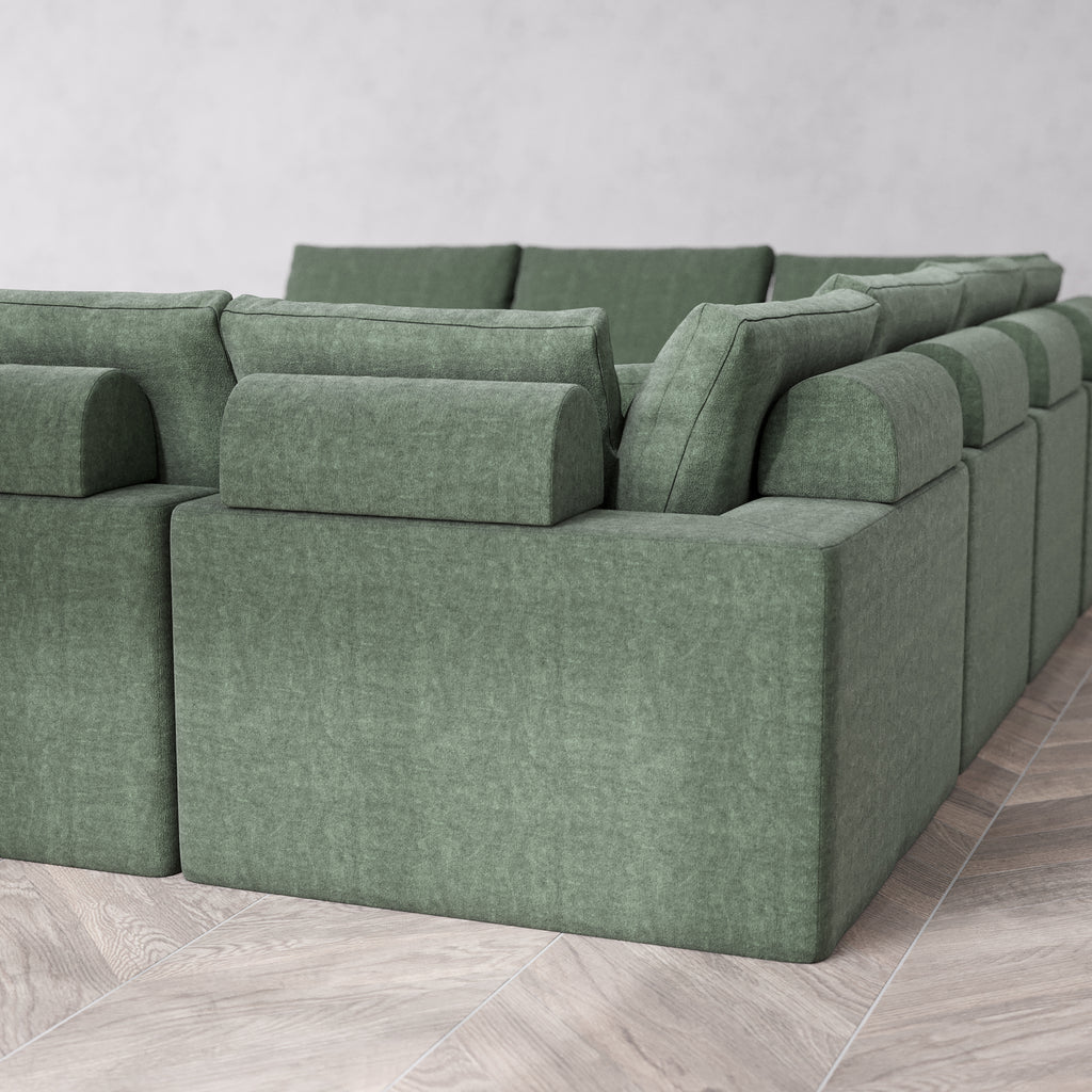 Slipcover Only - Modular Washable 10-Seater Open-Ends U Sectional + Chaise Ottoman Cloud + Bolster Sofa in Sage