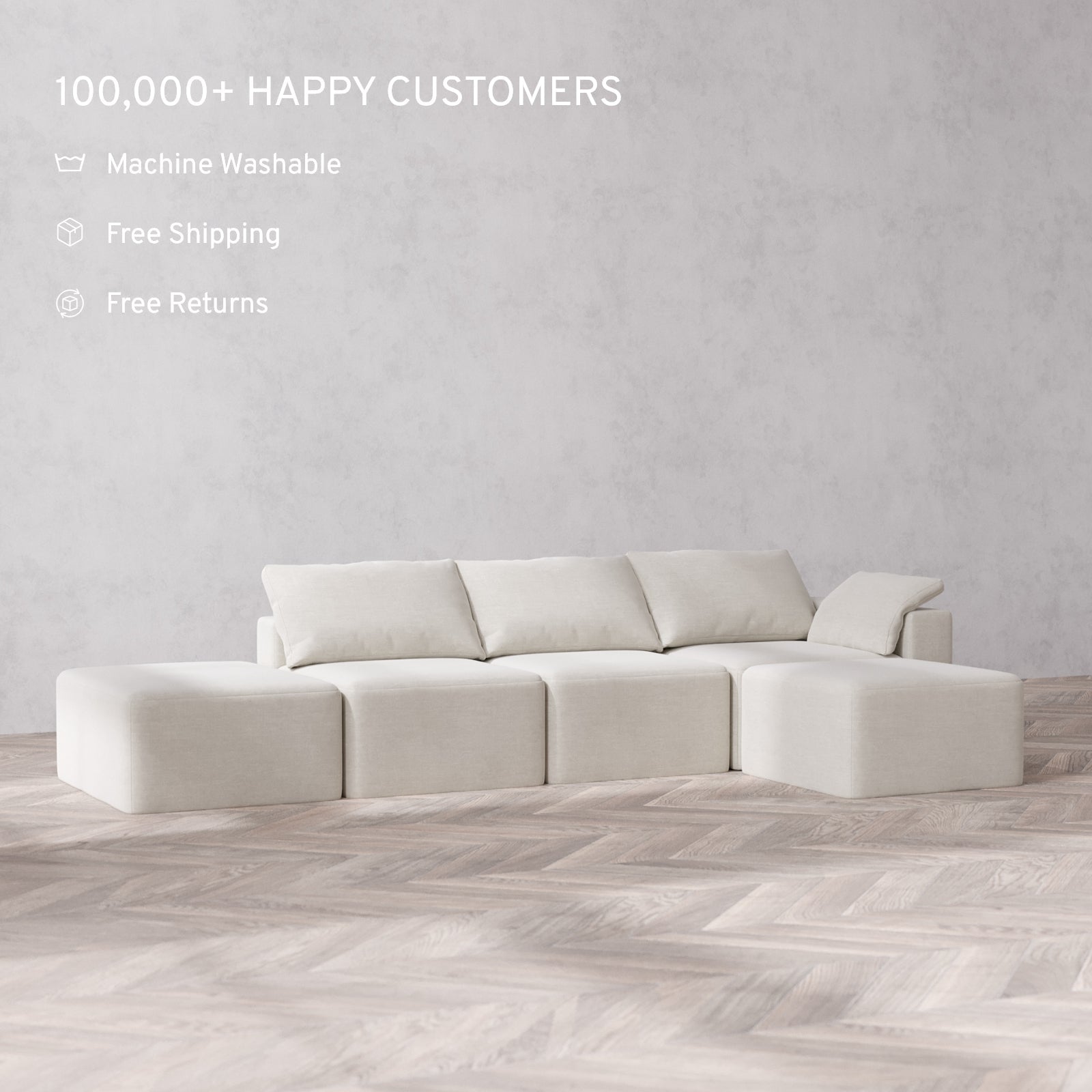 The Only Washable Cloud Sofa: With a waterproof frame and fabrics that resist pets, stains, and spills, this sofa is made to handle everyday messes. Our patent-pending covers are machine washable and fully interchangeable—buy extra sets to change up your look anytime.