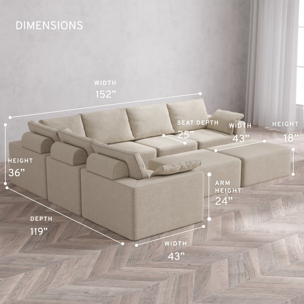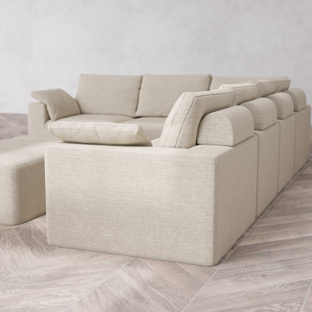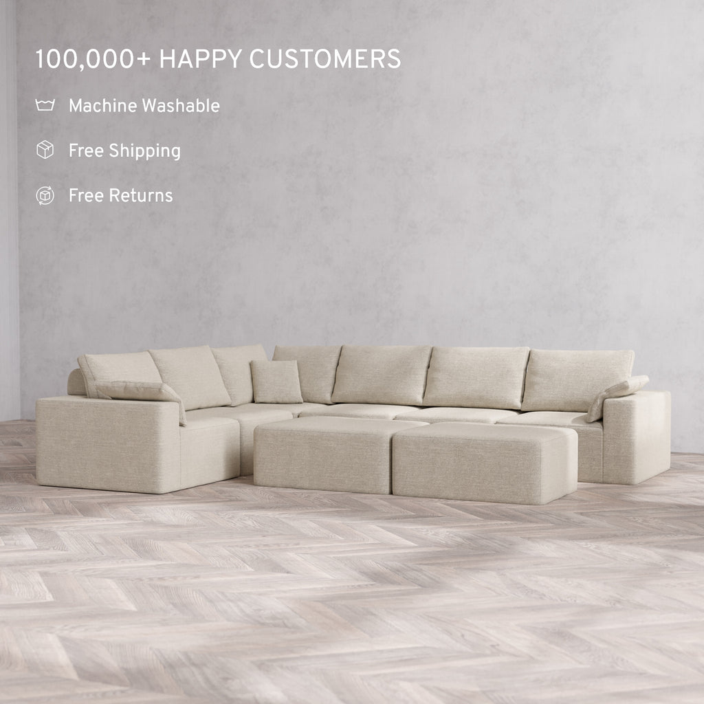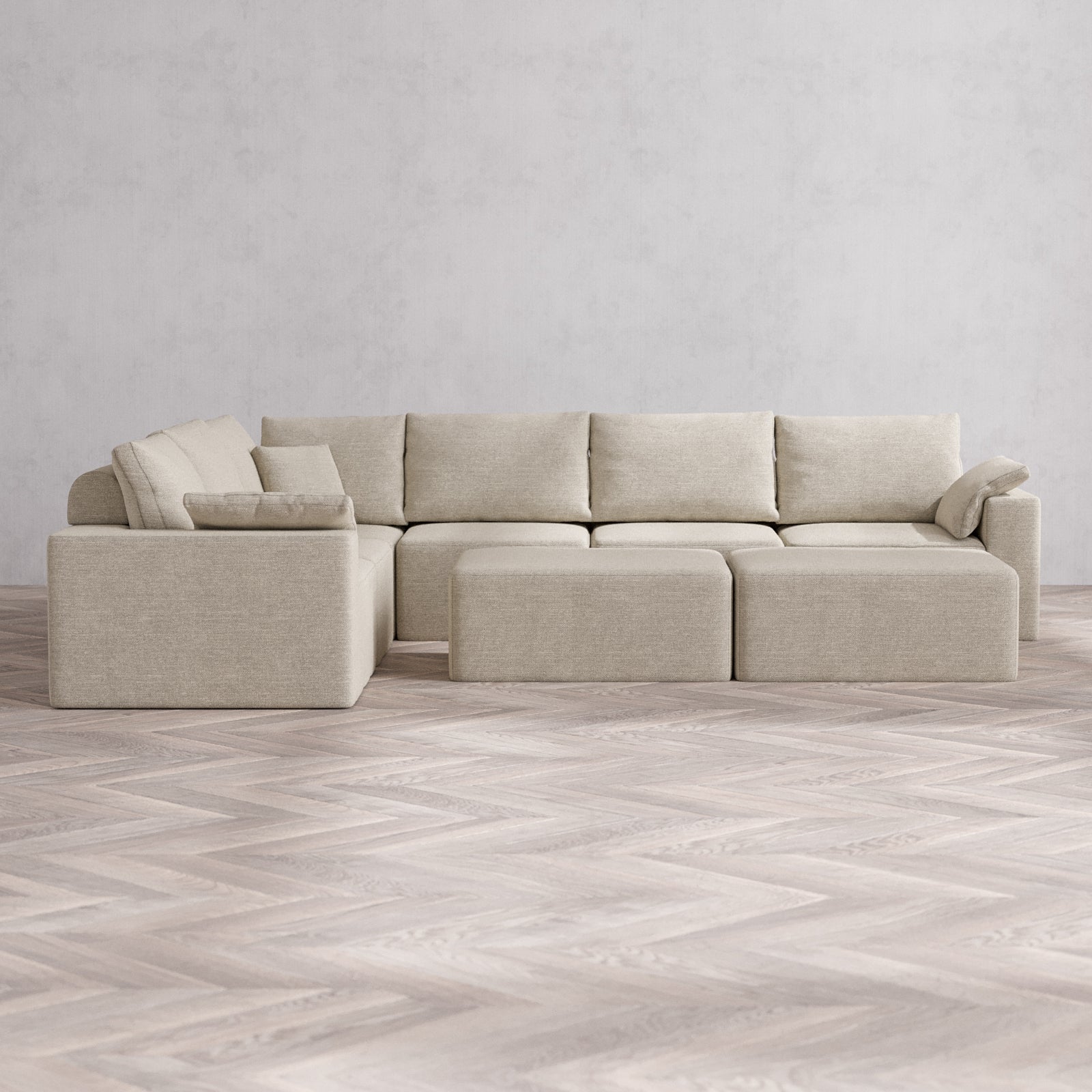 Modular Washable 6-Seater Corner Sectional + Chaise Ottoman Bench Cloud + Bolster Sofa | Plush Twill in Sandstone