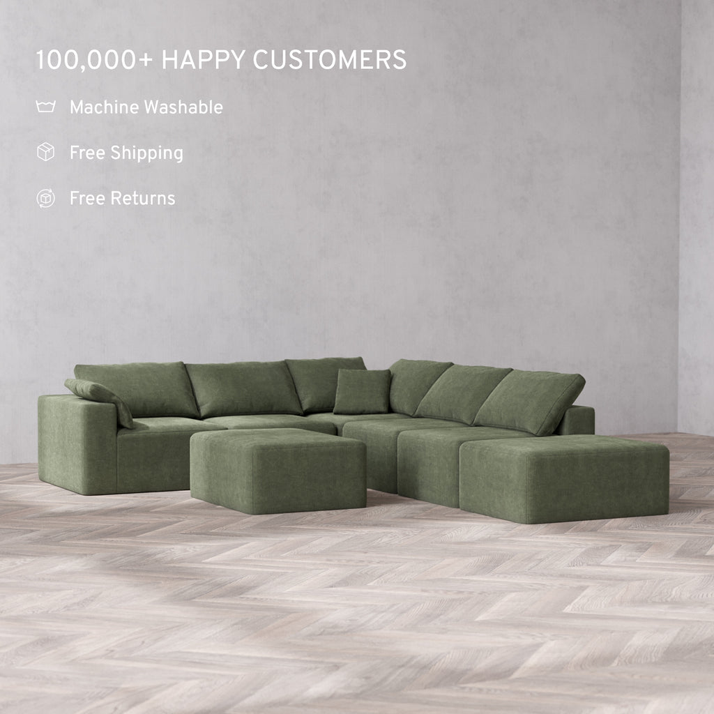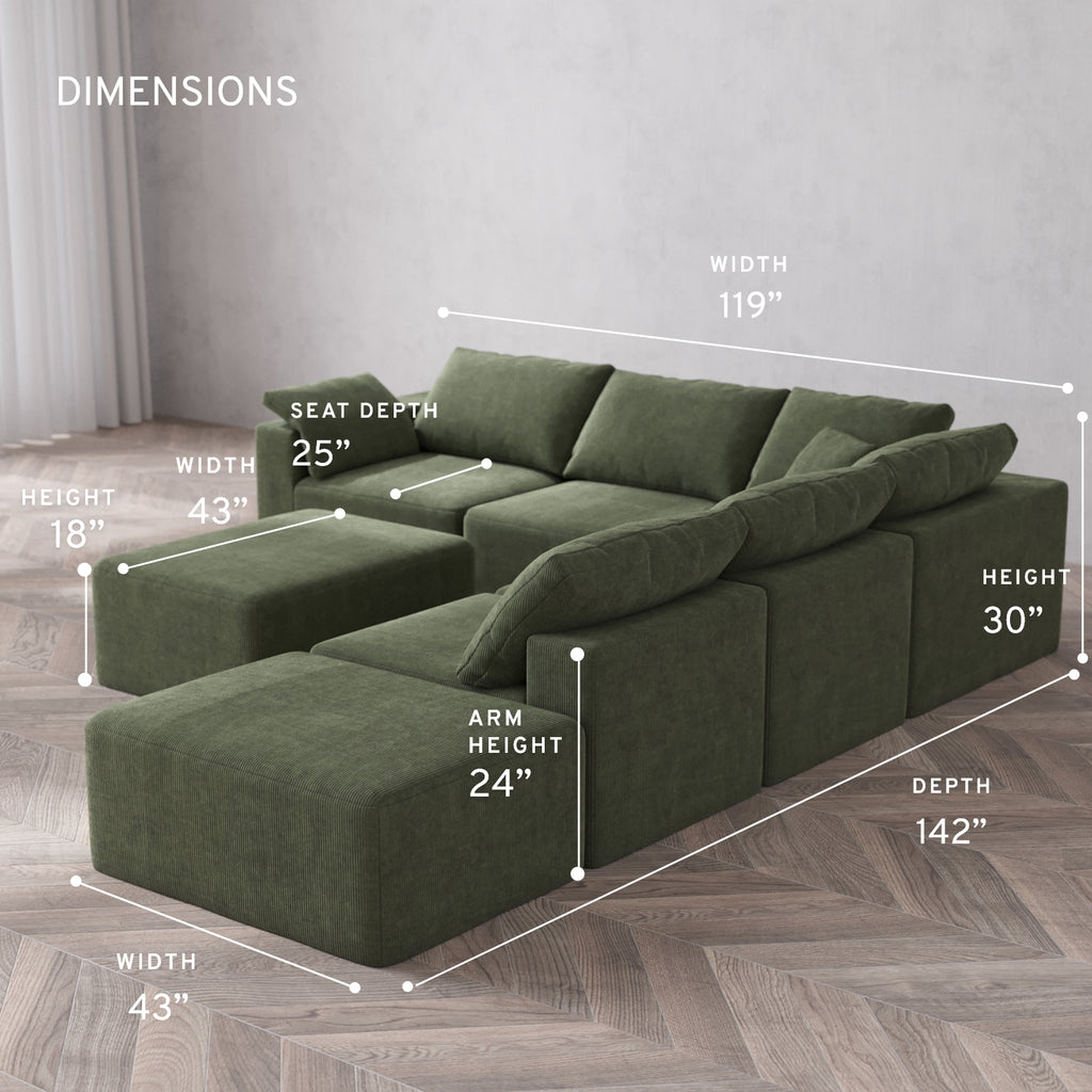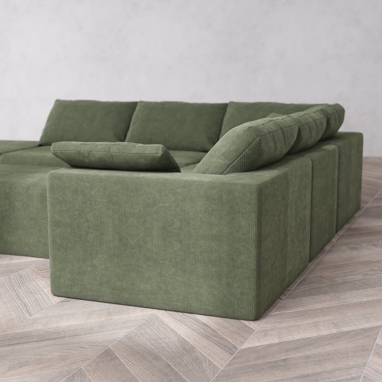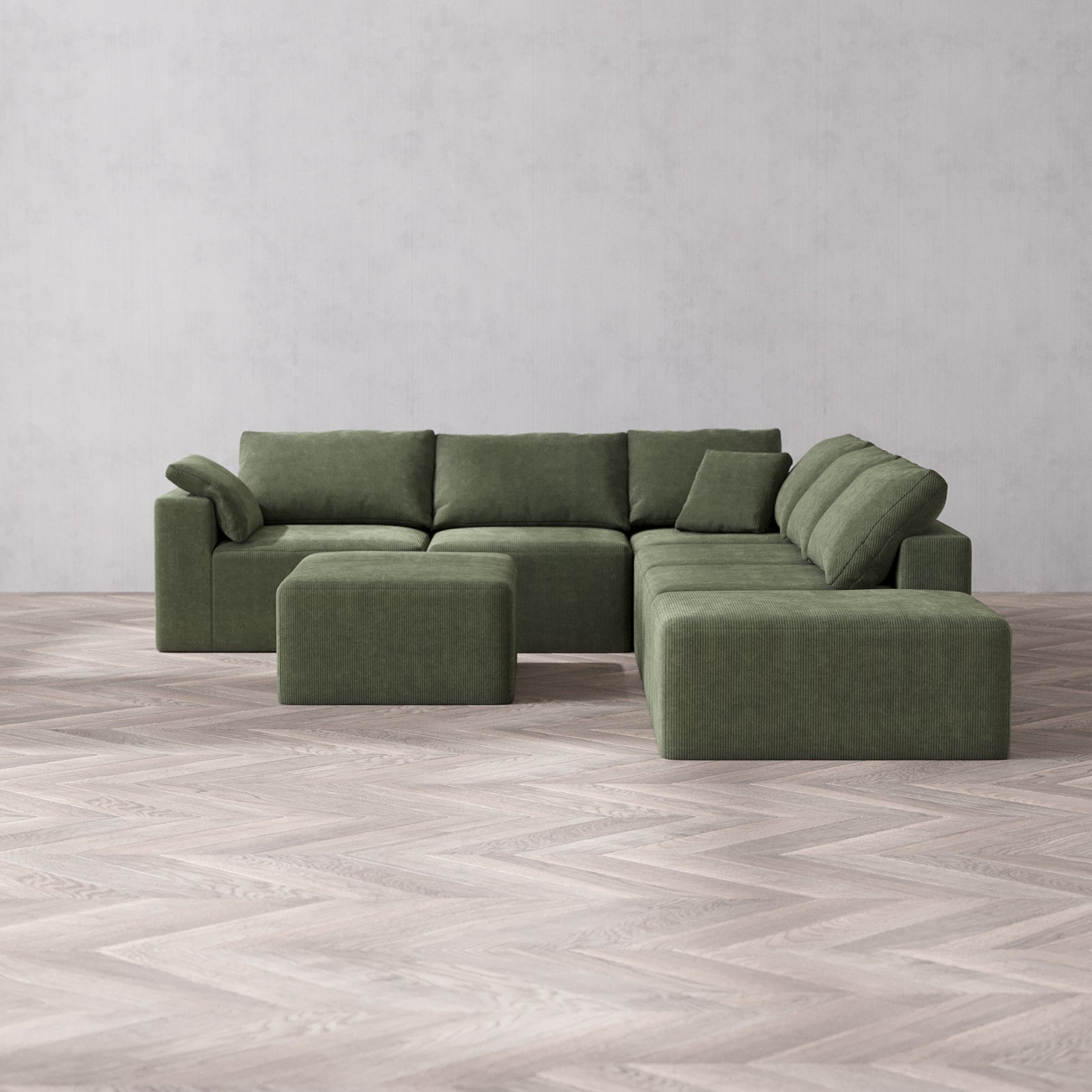 Modular Washable 6-Seater Open End Corner Sectional + Chaise Ottoman Cloud Sofa | Left-Facing Arm | Luxe Corduroy in Juniper