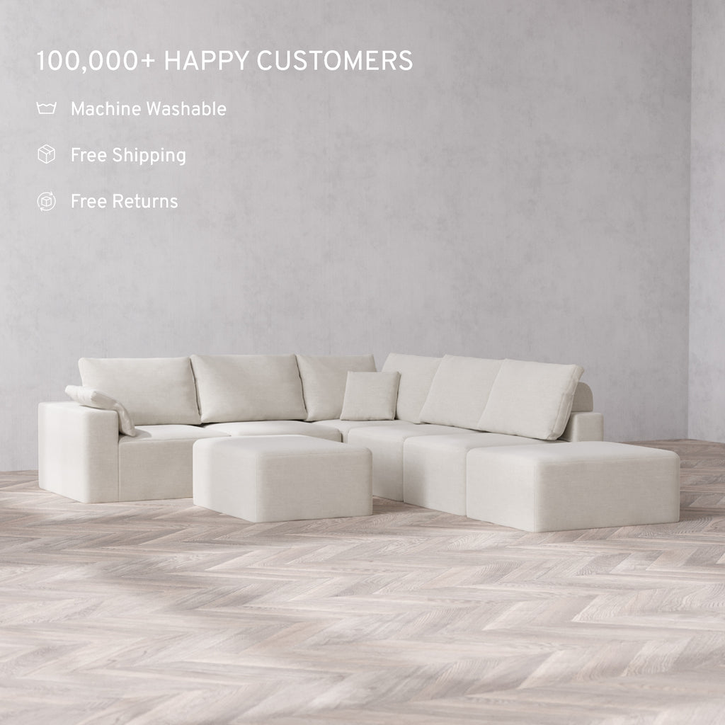 The Only Washable Cloud Sofa: With a waterproof frame and fabrics that resist pets, stains, and spills, this sofa is made to handle everyday messes. Our patent-pending covers are machine washable and fully interchangeable—buy extra sets to change up your look anytime.