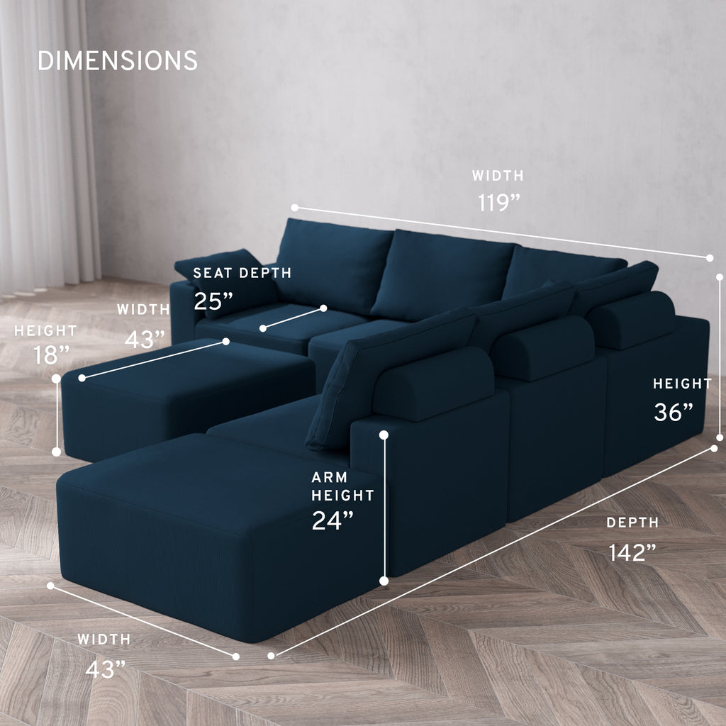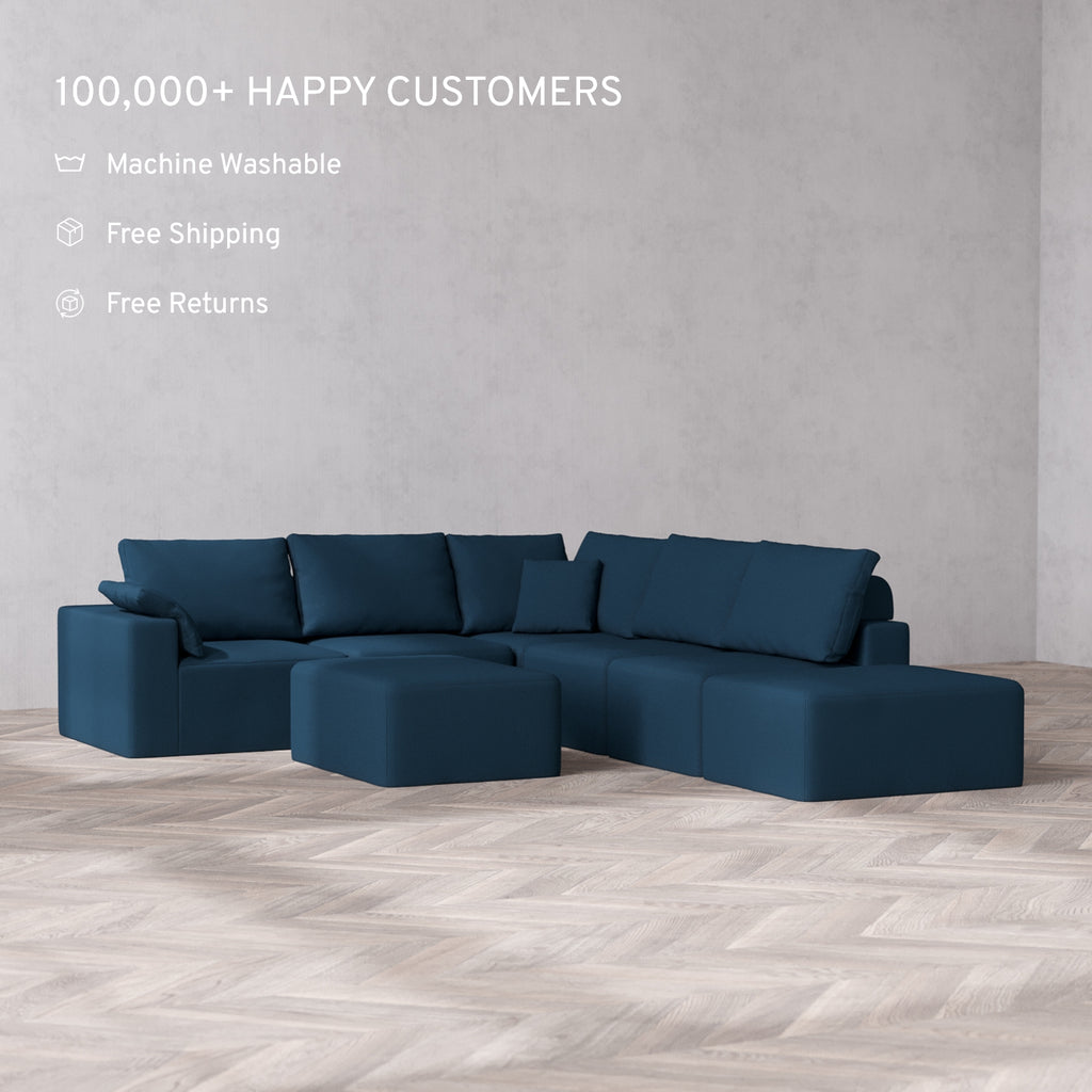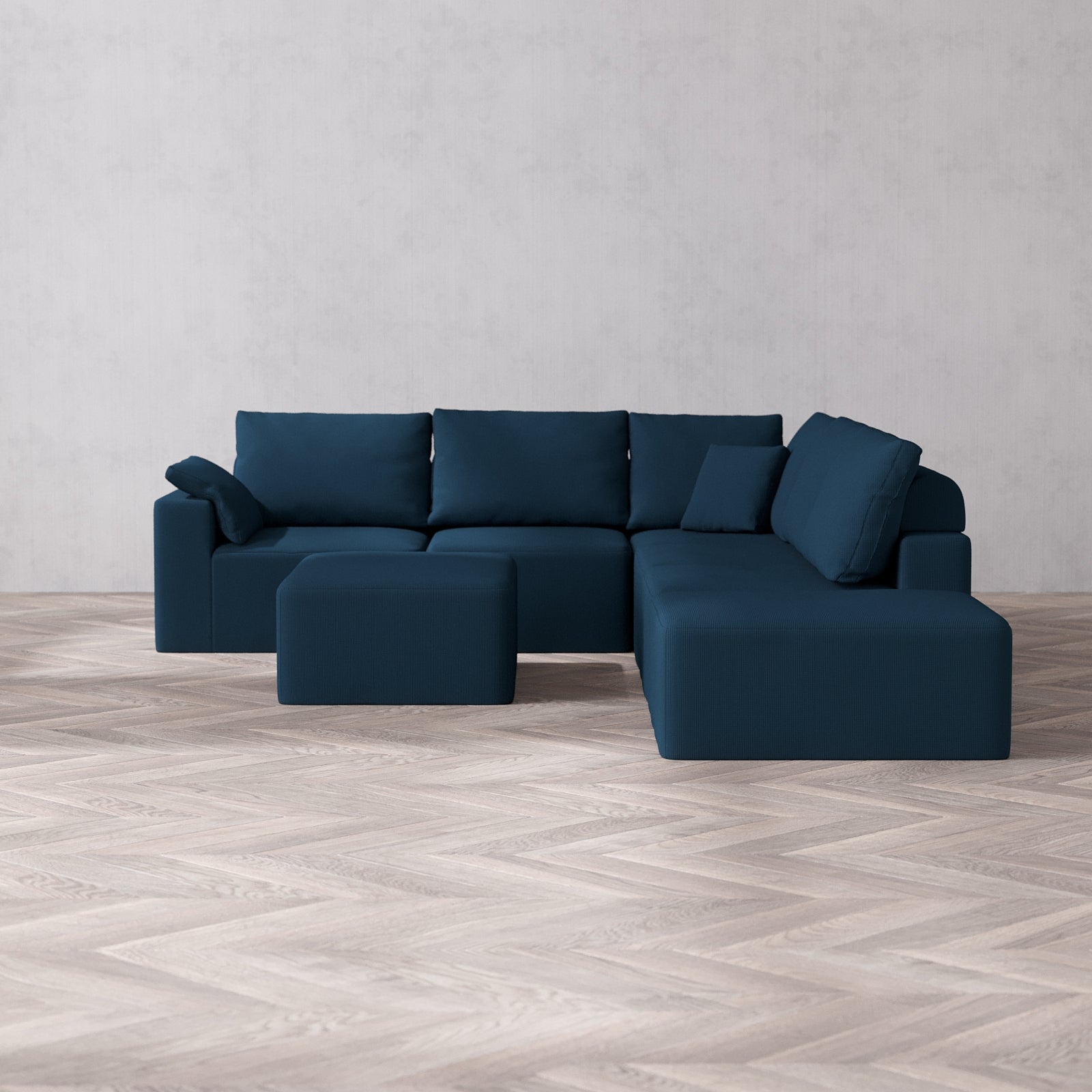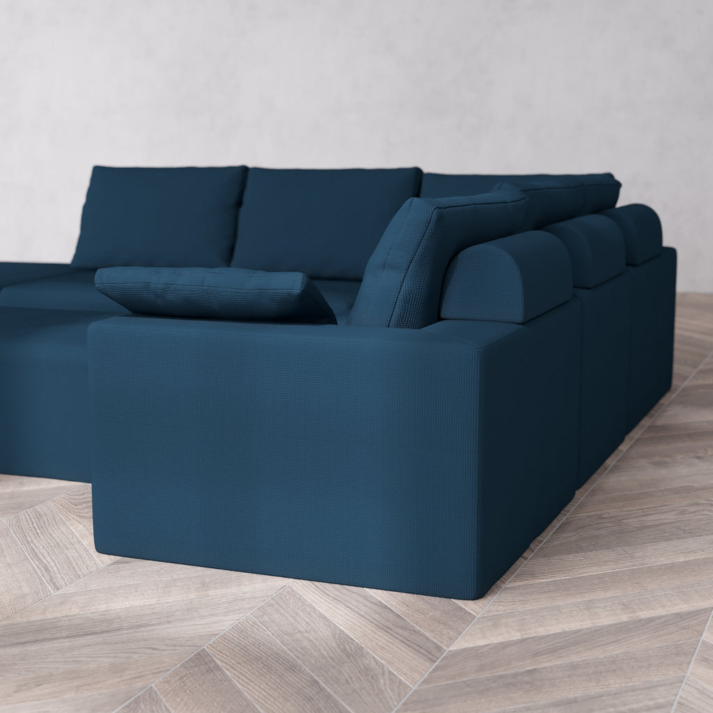 Modular Washable 6-Seater Open End Corner Sectional + Chaise Ottoman Cloud + Bolster Sofa | Left-Facing Arm | Arden Weave in Lazuli