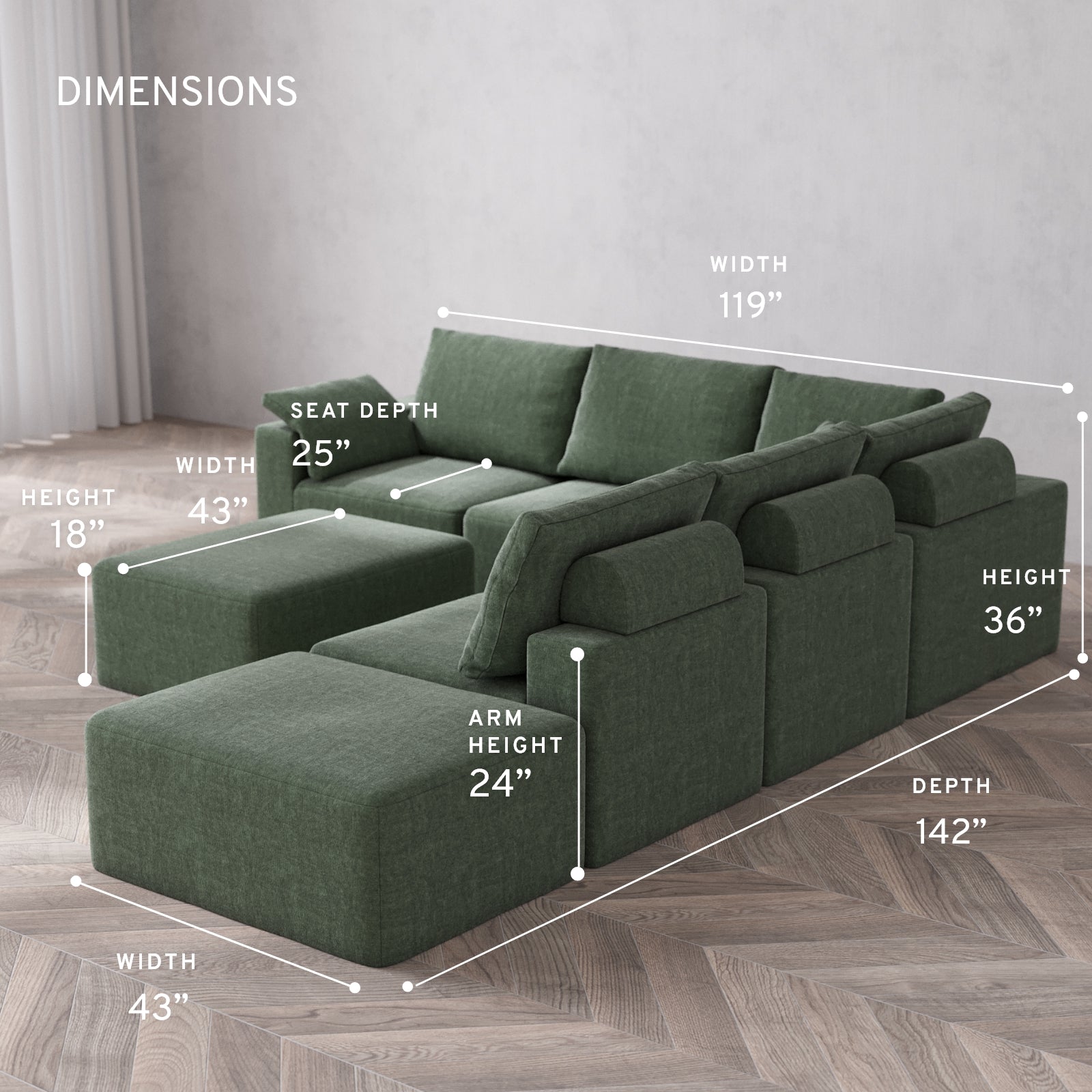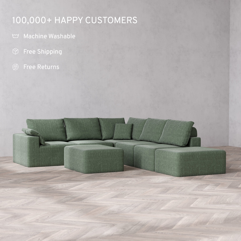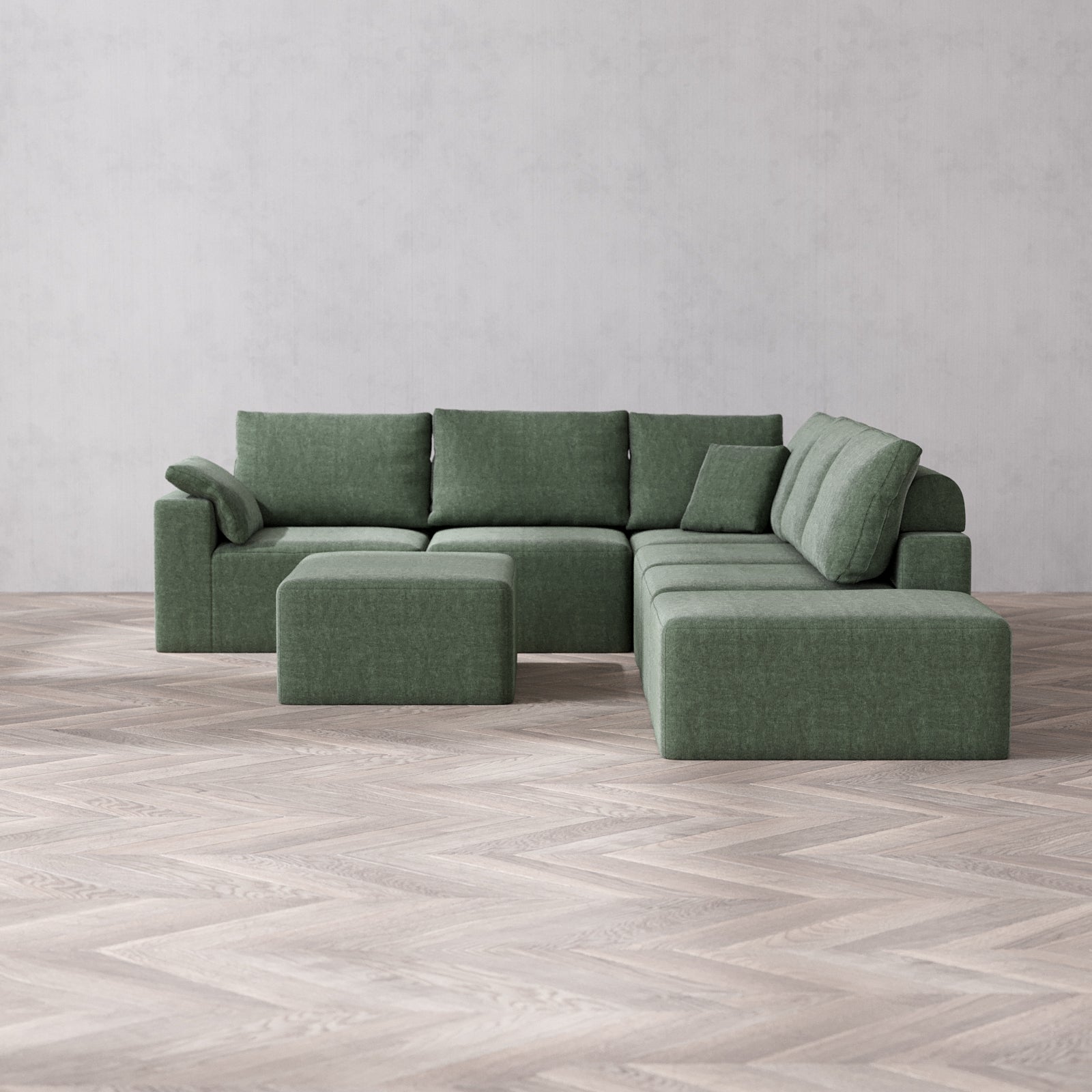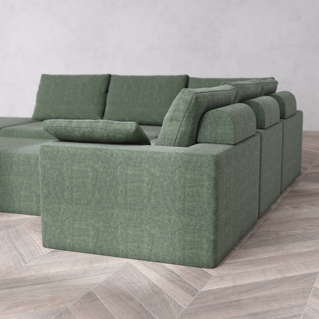 Modular Washable 6-Seater Open End Corner Sectional + Chaise Ottoman Cloud + Bolster Sofa | Left-Facing Arm | Heirloom Velvet in Sage