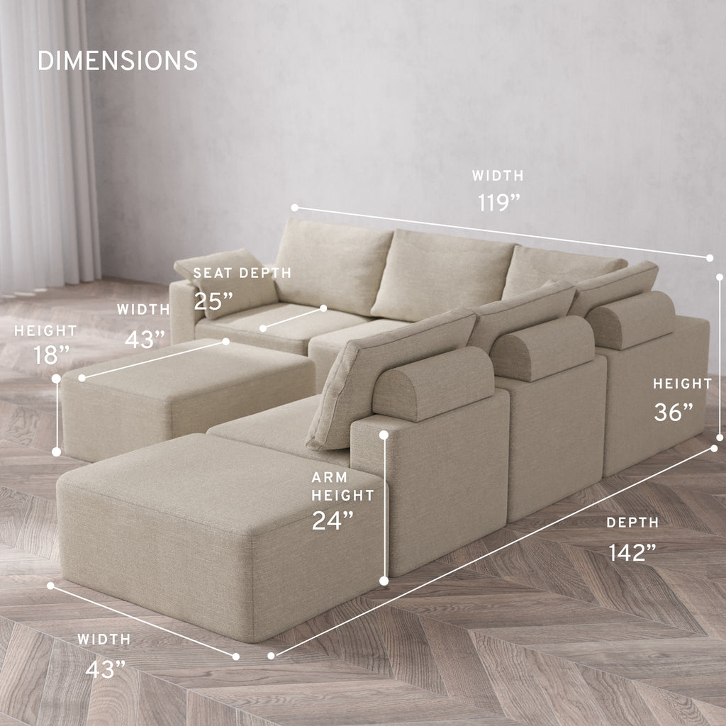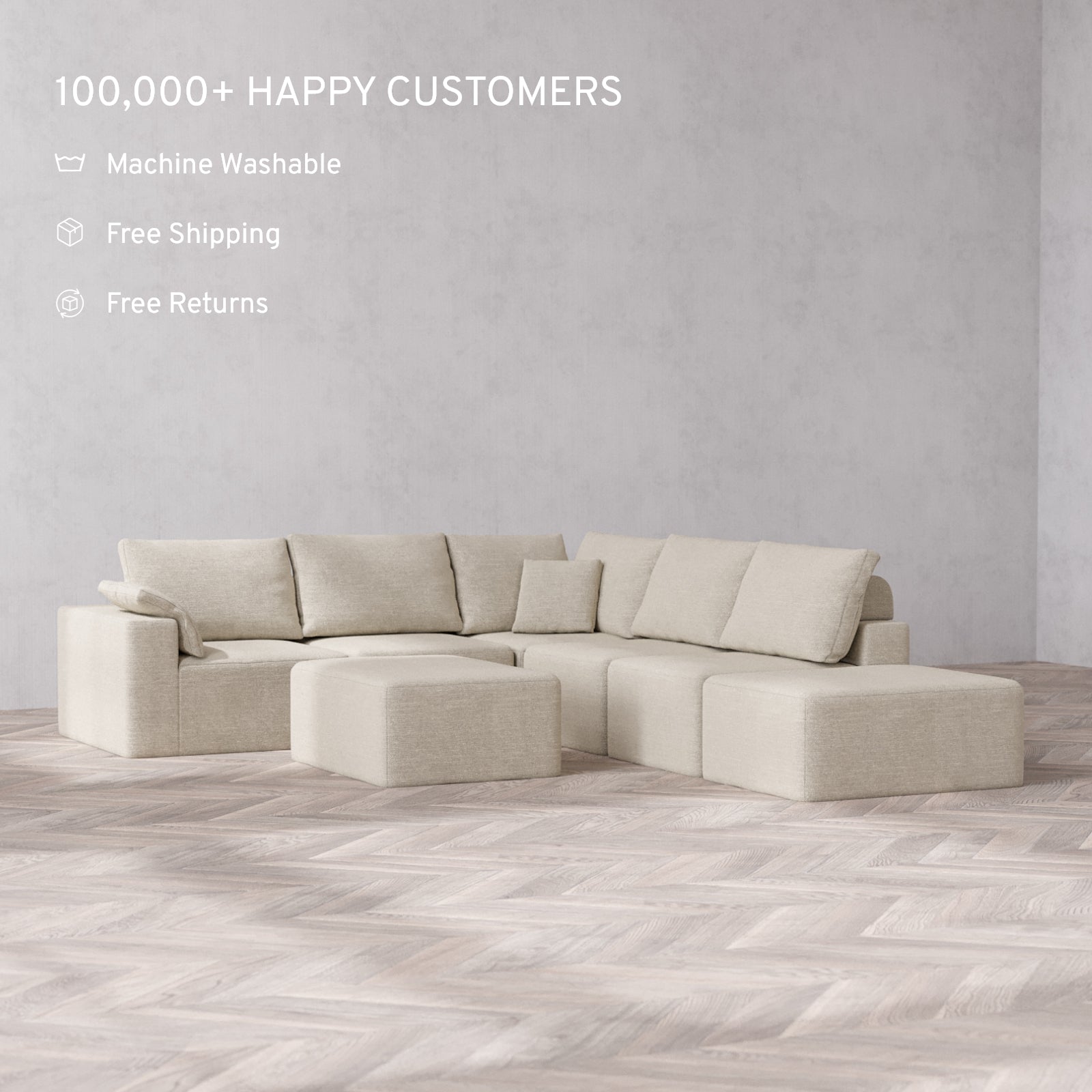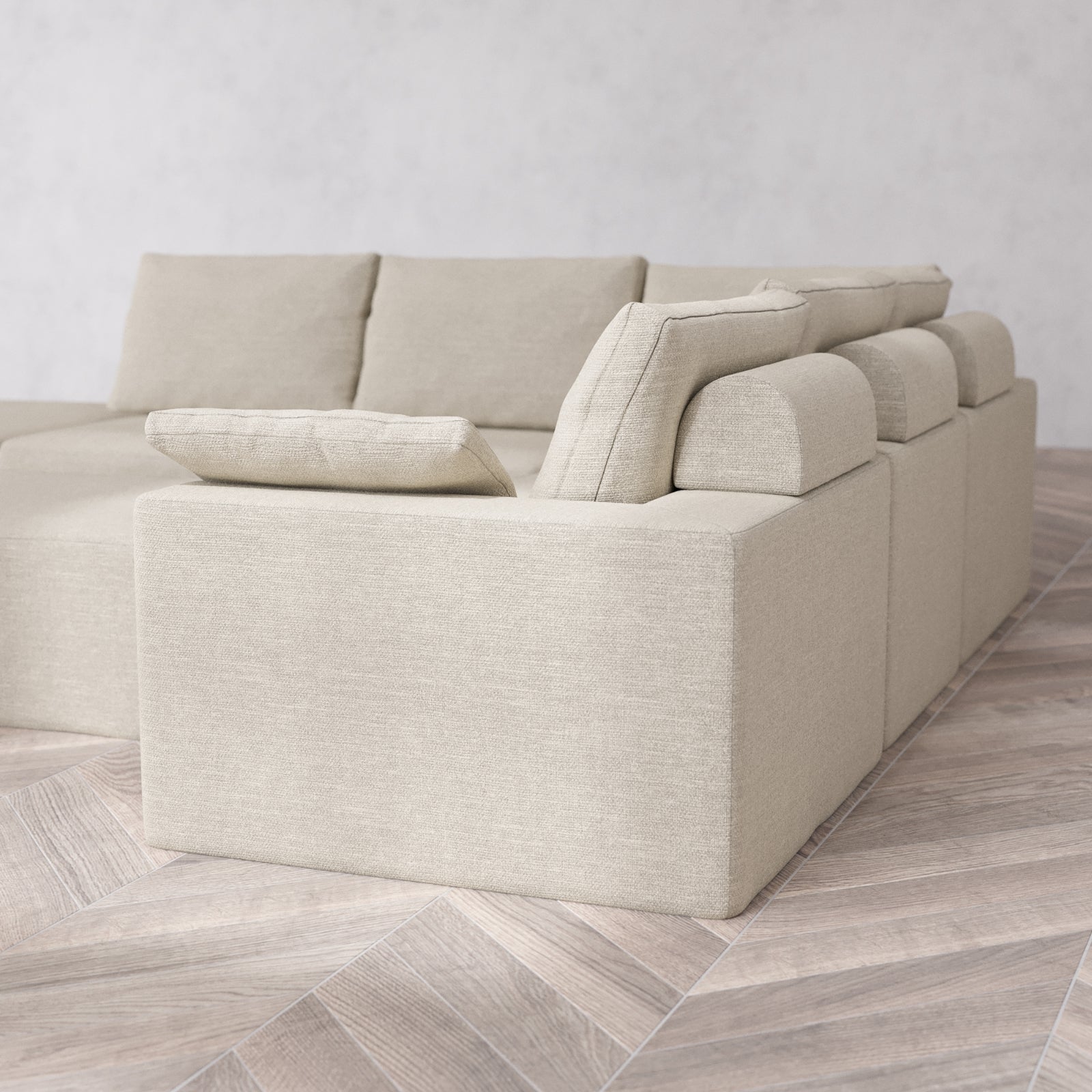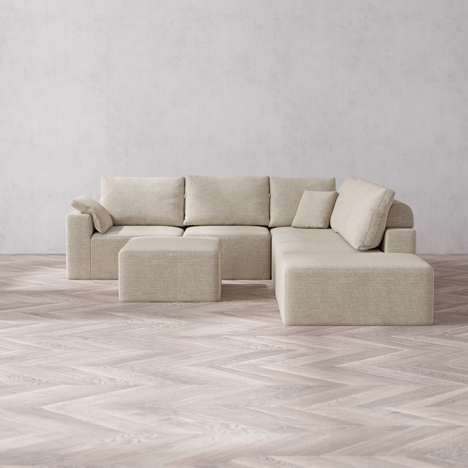 Modular Washable 6-Seater Open End Corner Sectional + Chaise Ottoman Cloud + Bolster Sofa | Left-Facing Arm | Plush Twill in Sandstone