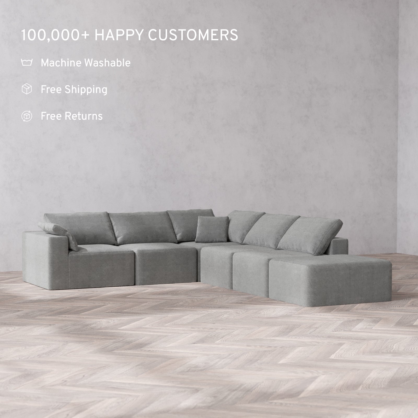 The Only Washable Cloud Sofa: With a waterproof frame and fabrics that resist pets, stains, and spills, this sofa is made to handle everyday messes. Our patent-pending covers are machine washable and fully interchangeable—buy extra sets to change up your look anytime.