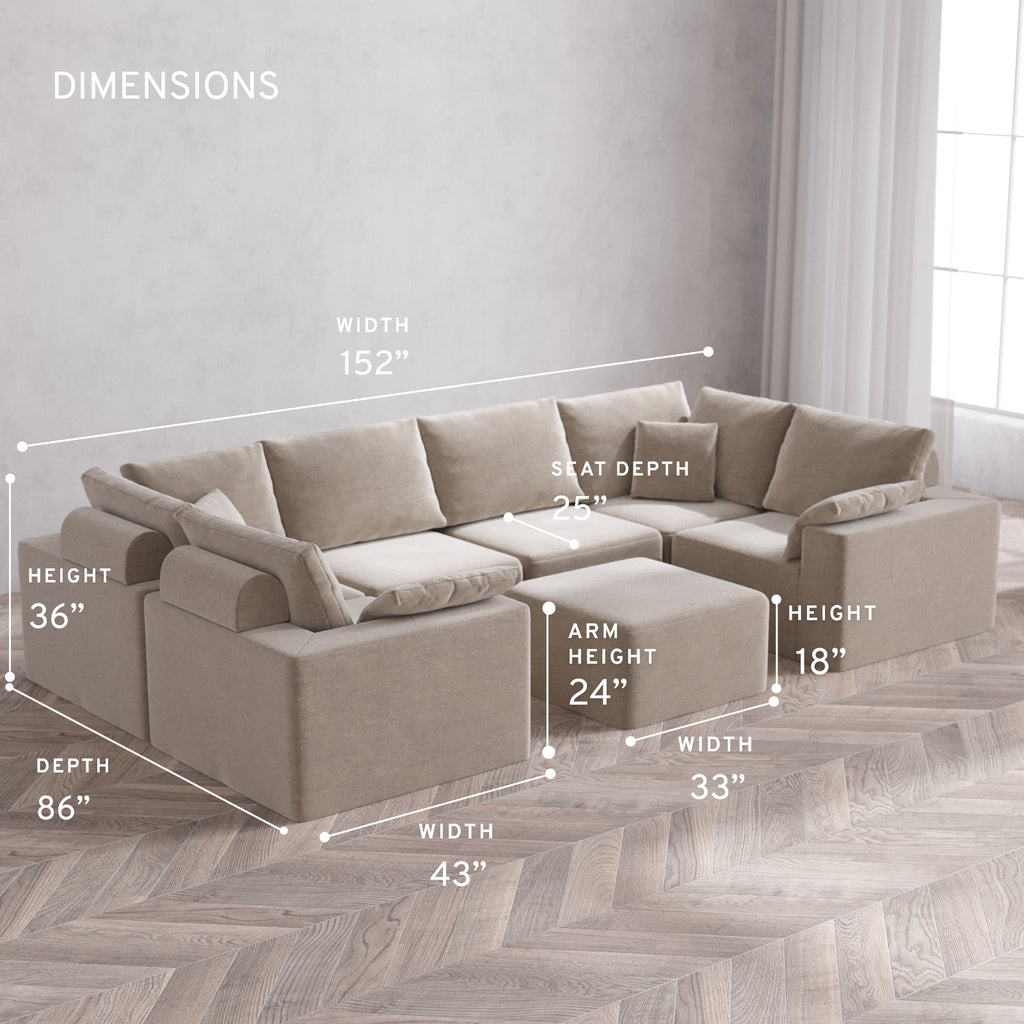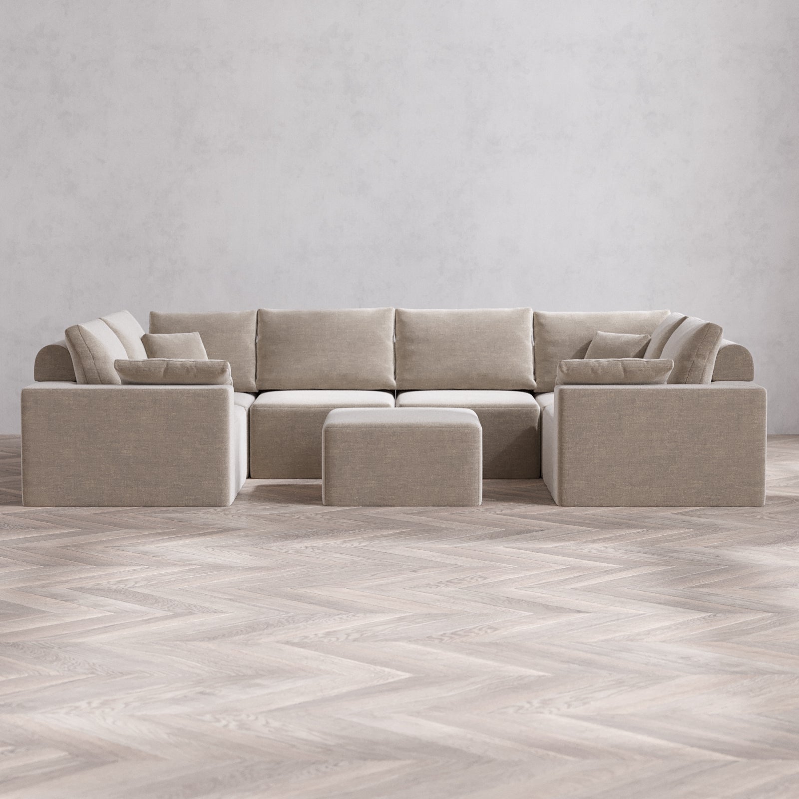 Modular Washable 6-Seater U Sectional + Ottoman Cloud + Bolster Sofa | Satin Velvet in Caraway