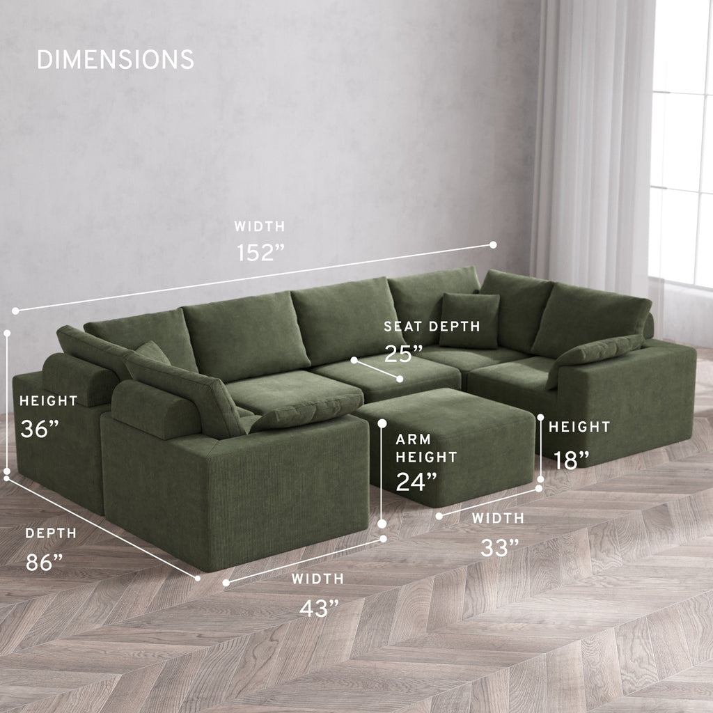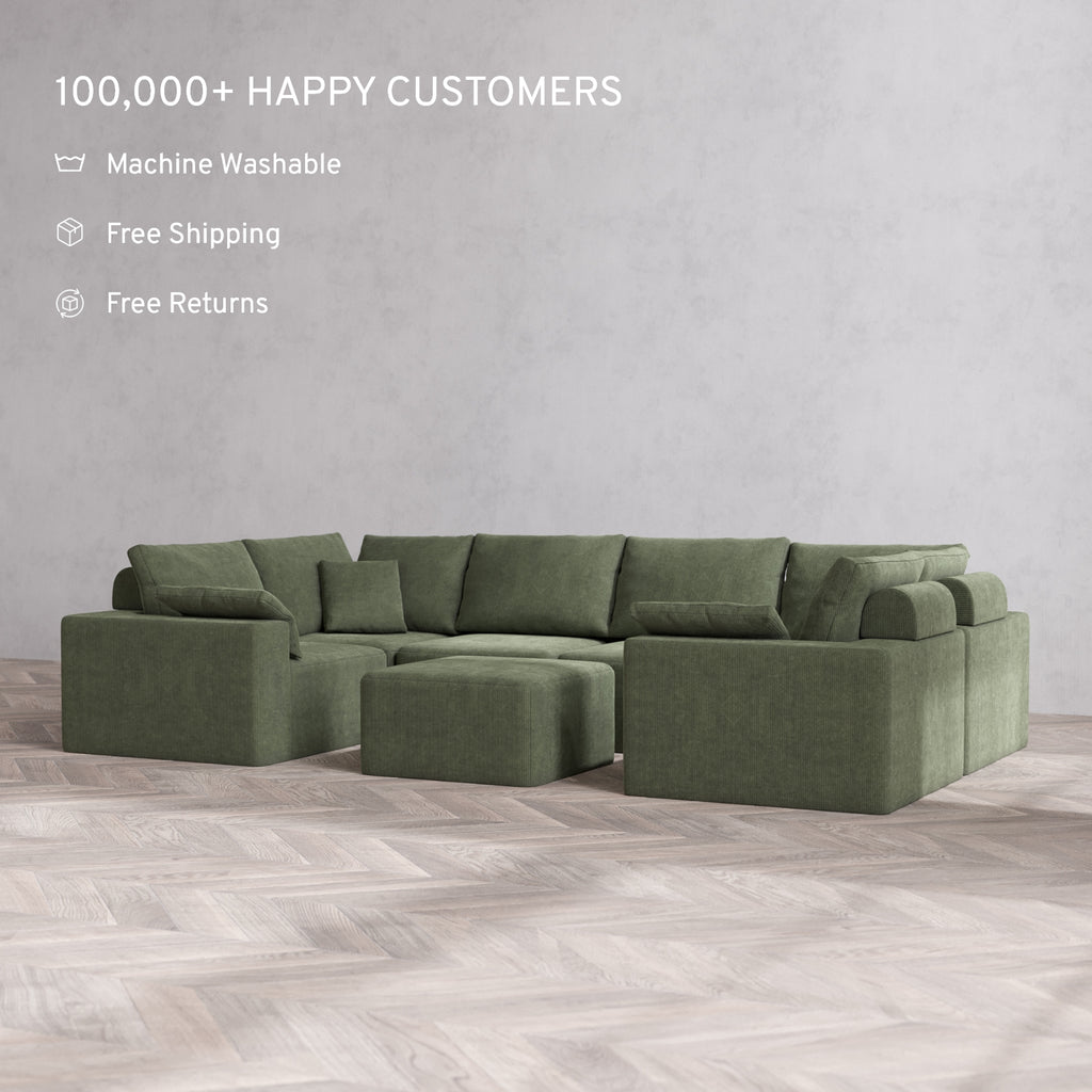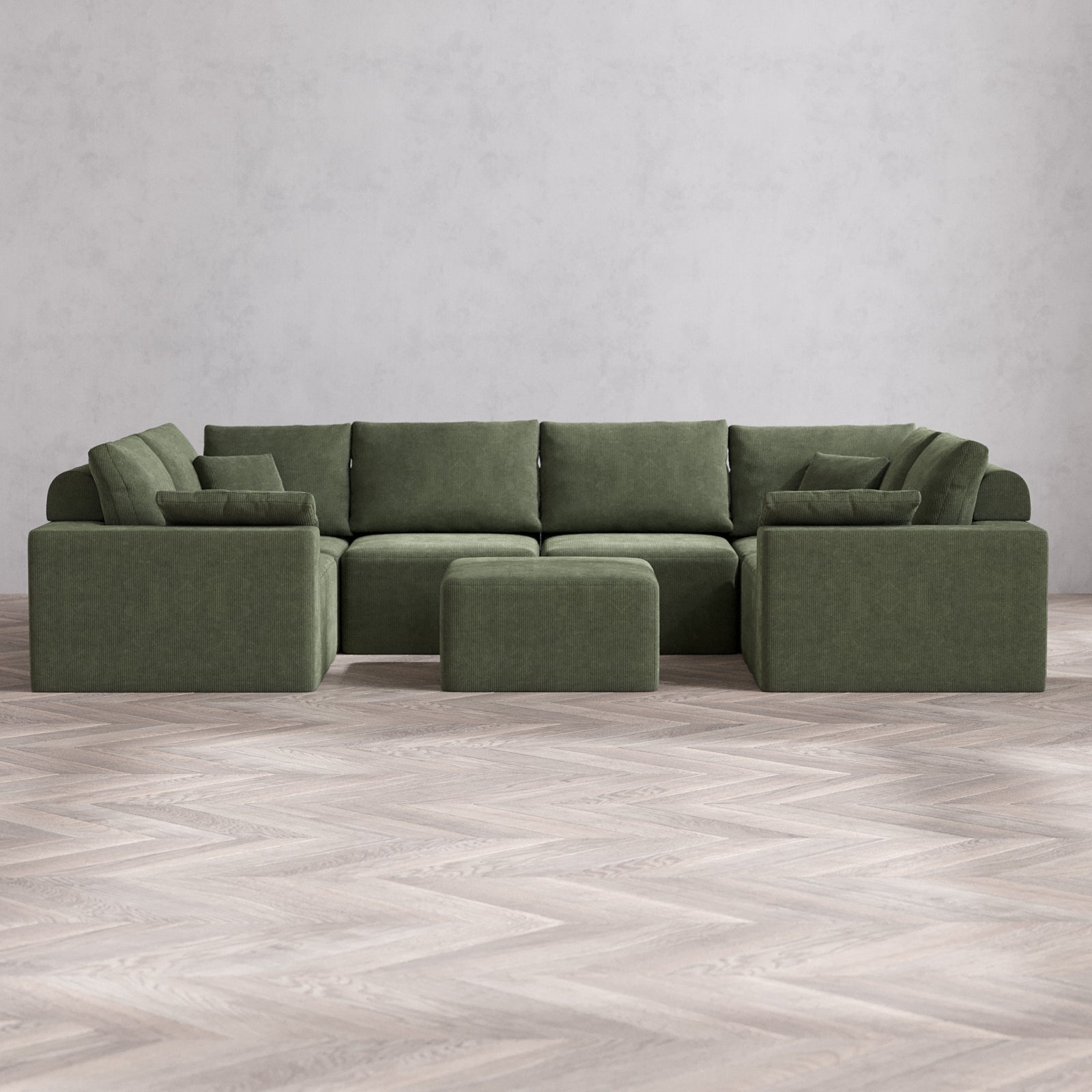 Modular Washable 6-Seater U Sectional + Ottoman Cloud + Bolster Sofa | Luxe Corduroy in Juniper