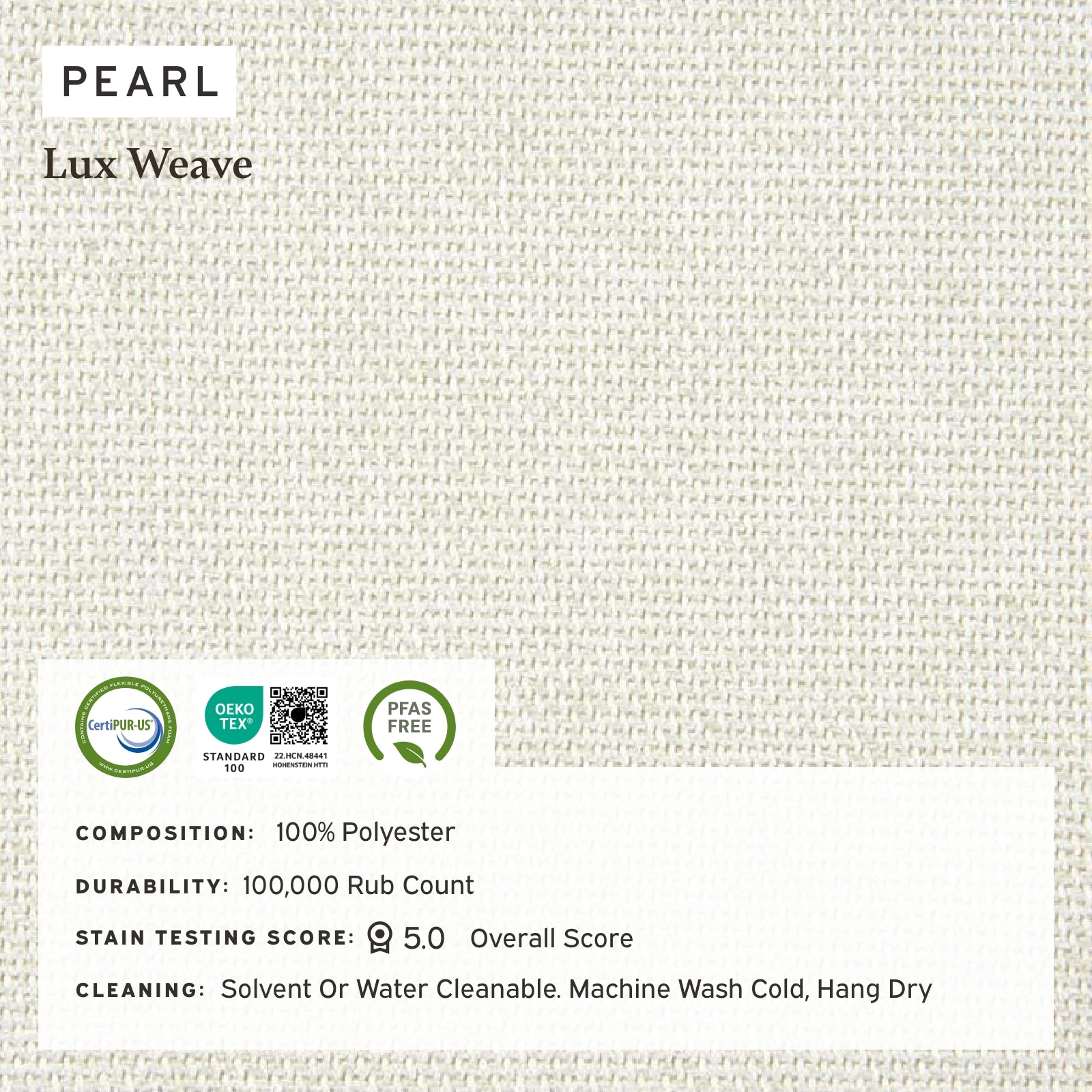 This performance Lux Weave is defined by heathered yarns, crossing diagonally over one another, creating a lovely tactile look that’s inviting and natural. The flat woven micro-denier features a subtle cross dye technique that’s engineered without the use of forever chemicals to resist liquids and everyday staining. This robust 100% Polyester boasts an abrasion resistance of over 75,000 double rubs. All covers are machine washable for your convenience (see care guide for details).