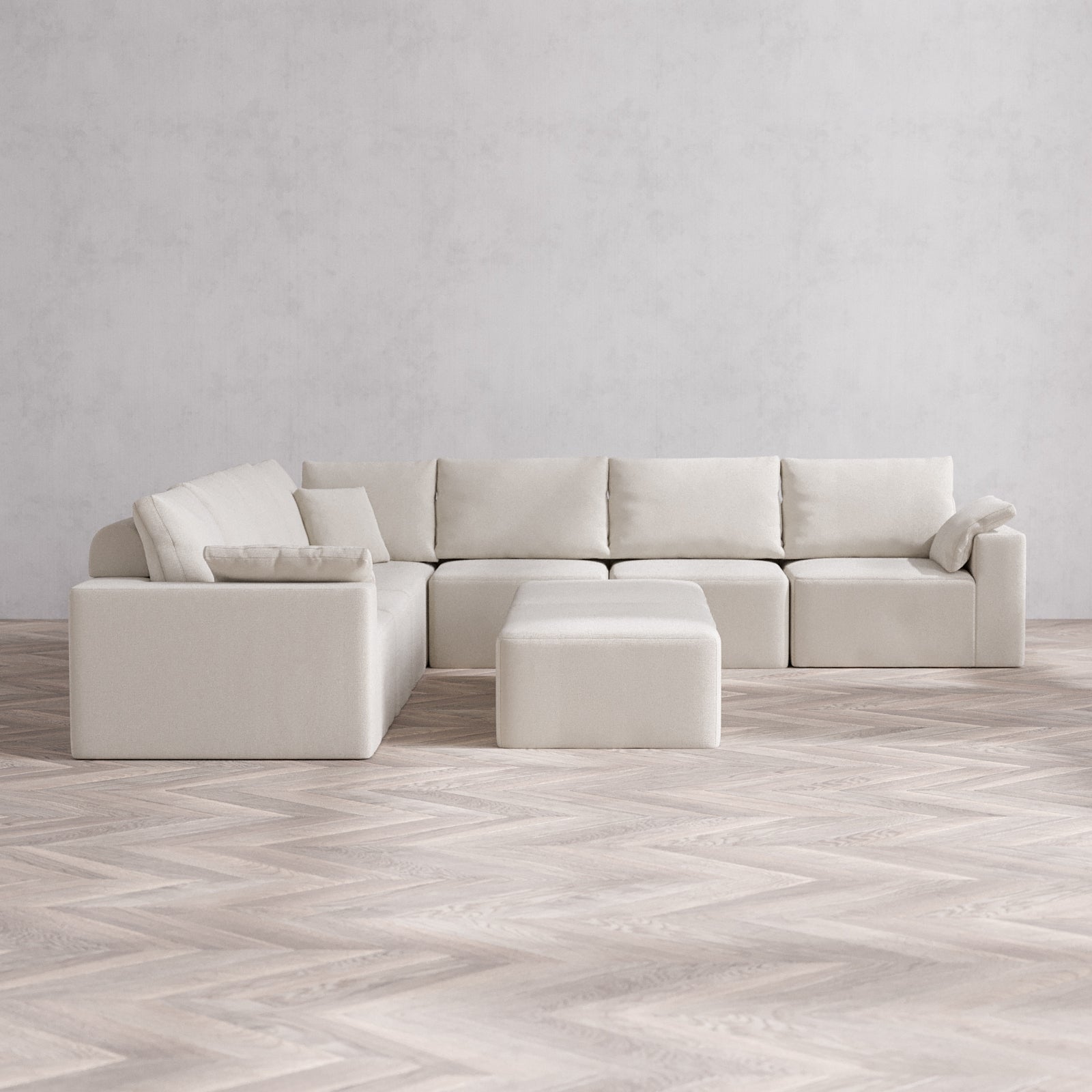 Modular Washable 7-Seater Corner Sectional + Chaise Ottoman Bench Cloud + Bolster Sofa | Lux Weave in Pearl