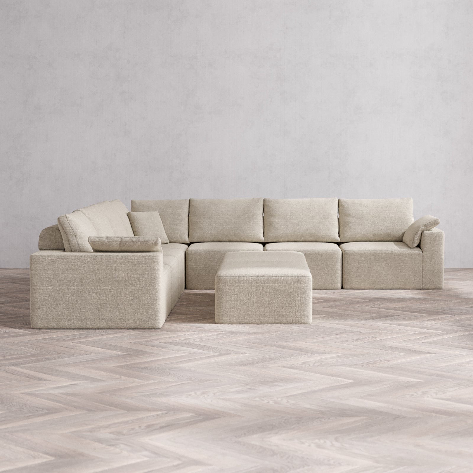 Modular Washable 7-Seater Corner Sectional + Chaise Ottoman Bench Cloud + Bolster Sofa | Plush Twill in Sandstone