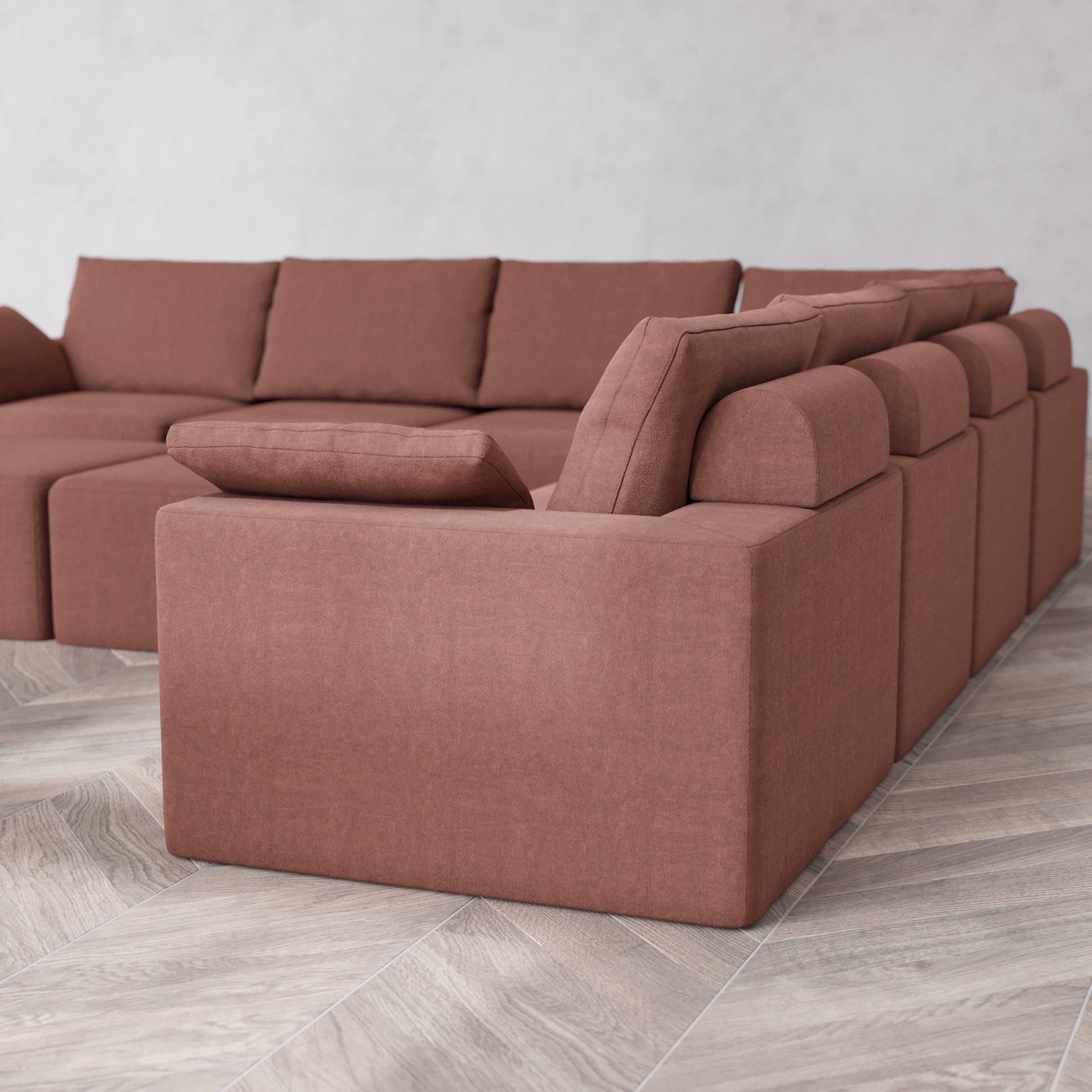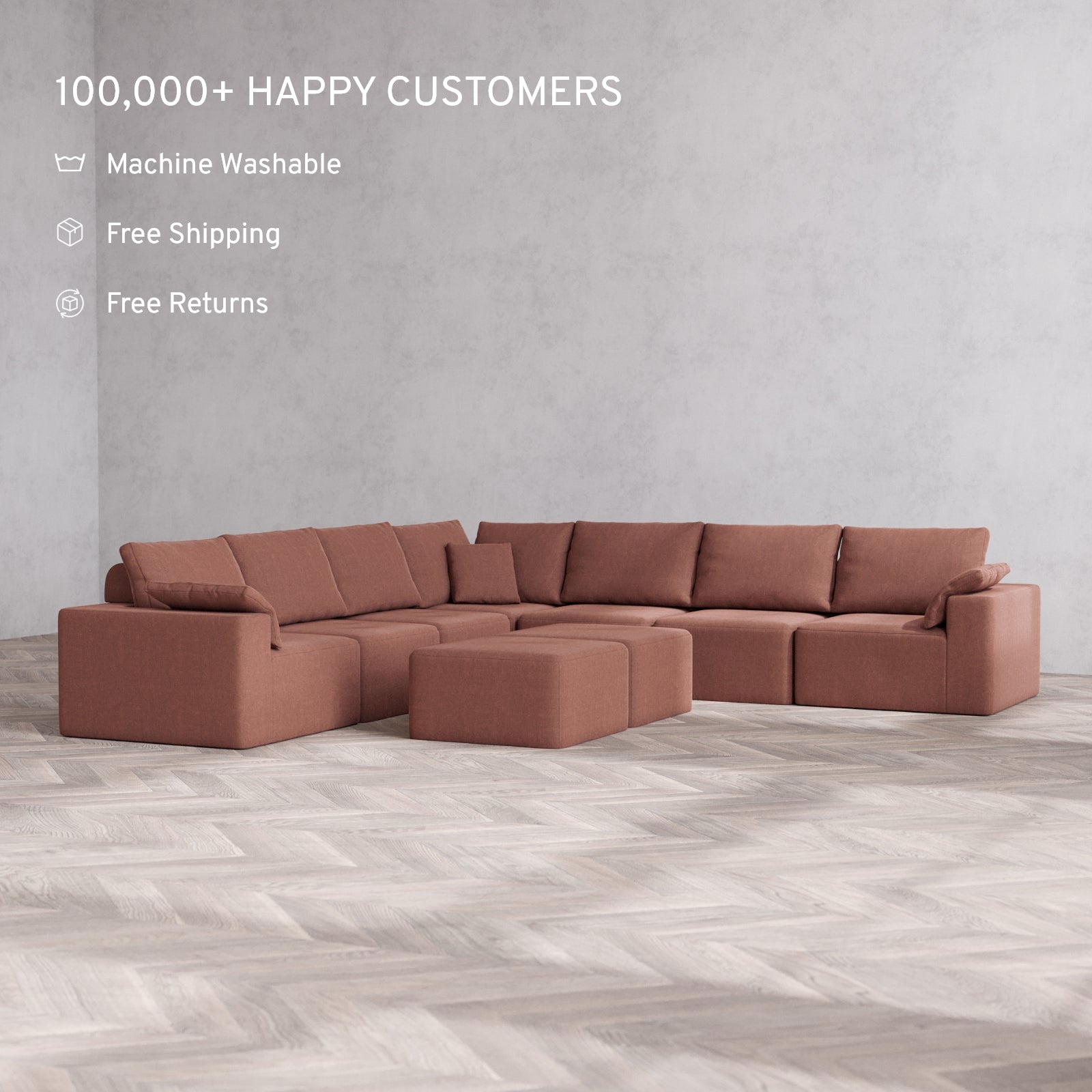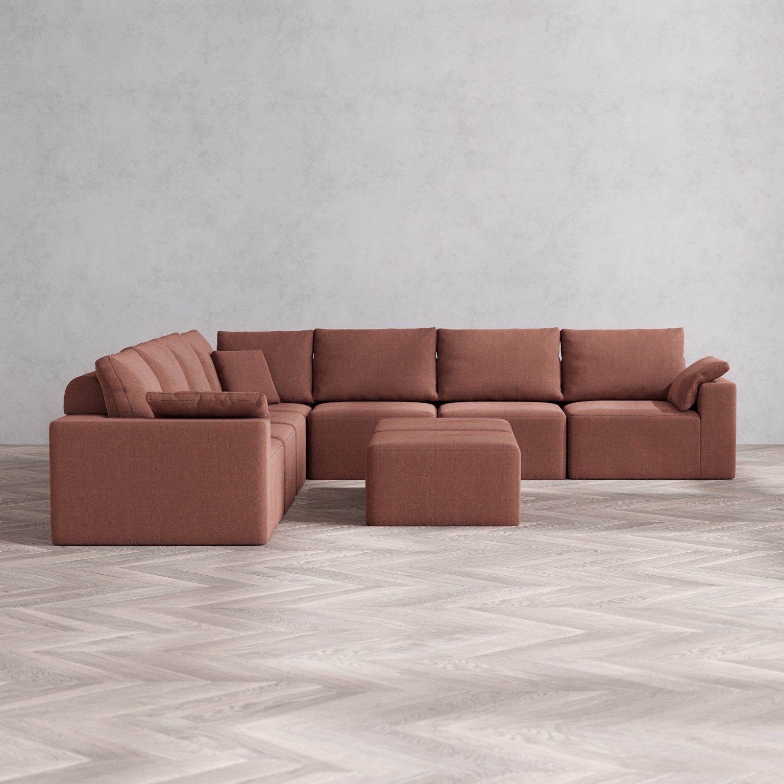 Modular Washable 7-Seater Corner Sectional + Ottoman Bench Cloud + Bolster Sofa | Heirloom Velvet in Sumac