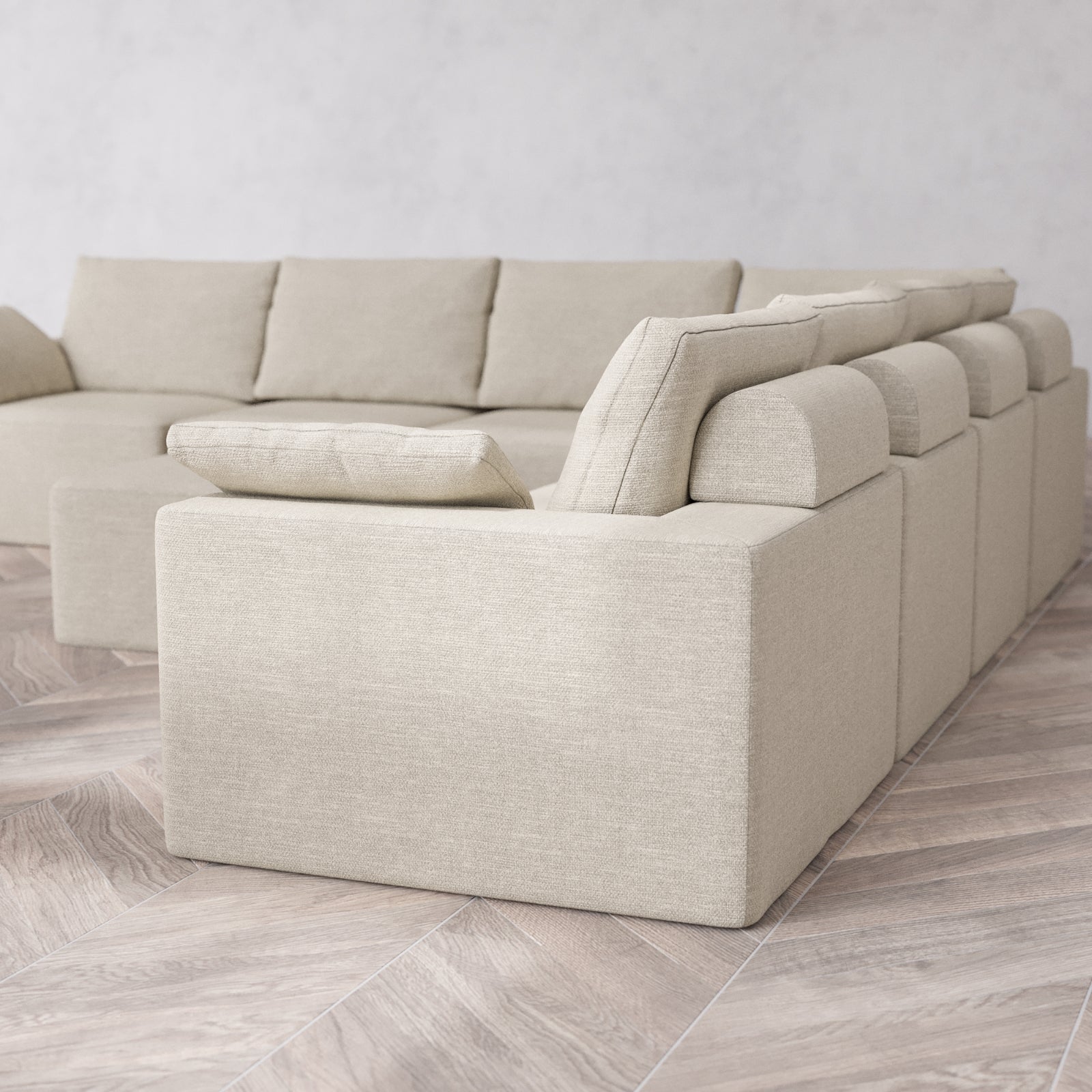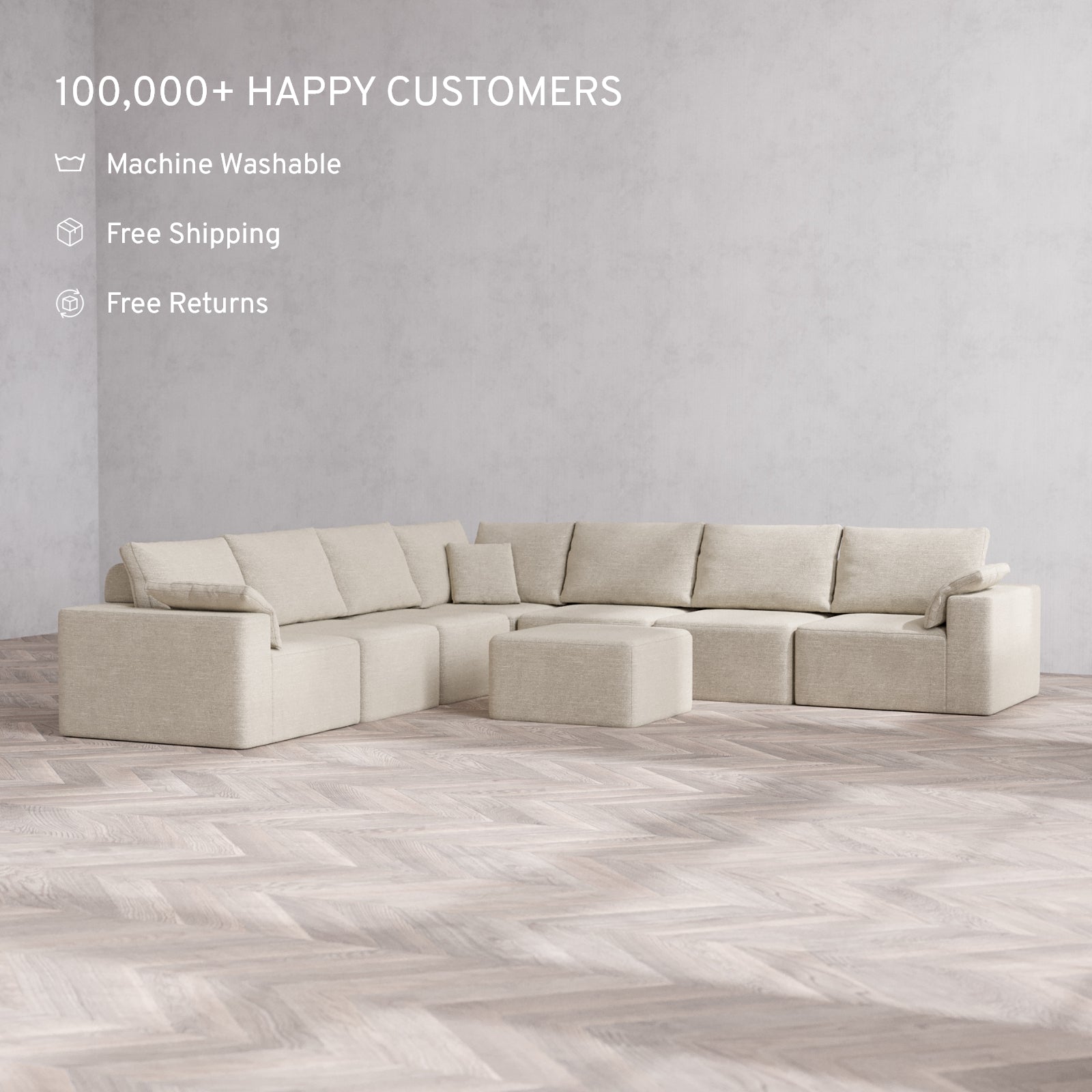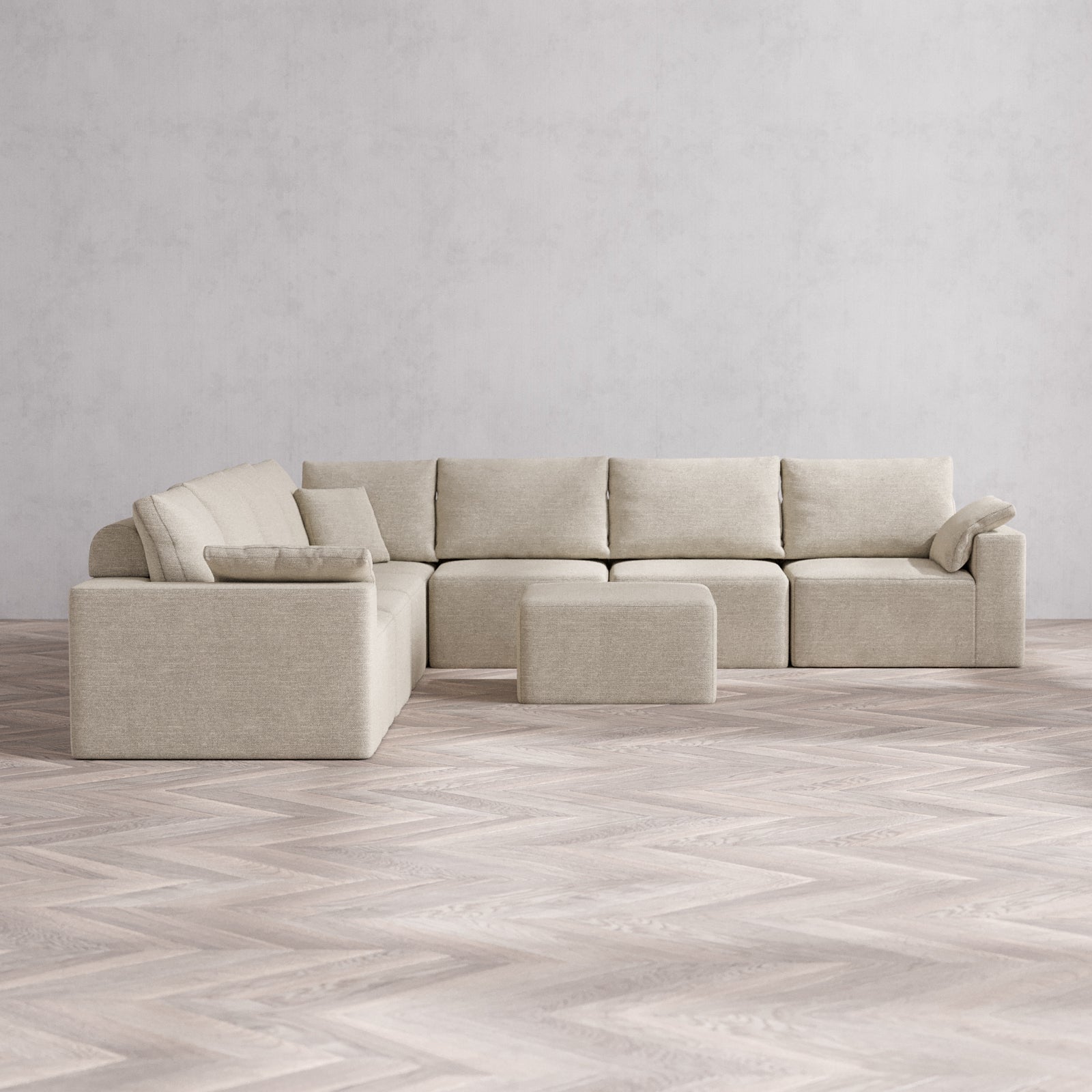 Modular Washable 7-Seater Corner Sectional + Ottoman Cloud + Bolster Sofa | Plush Twill in Sandstone