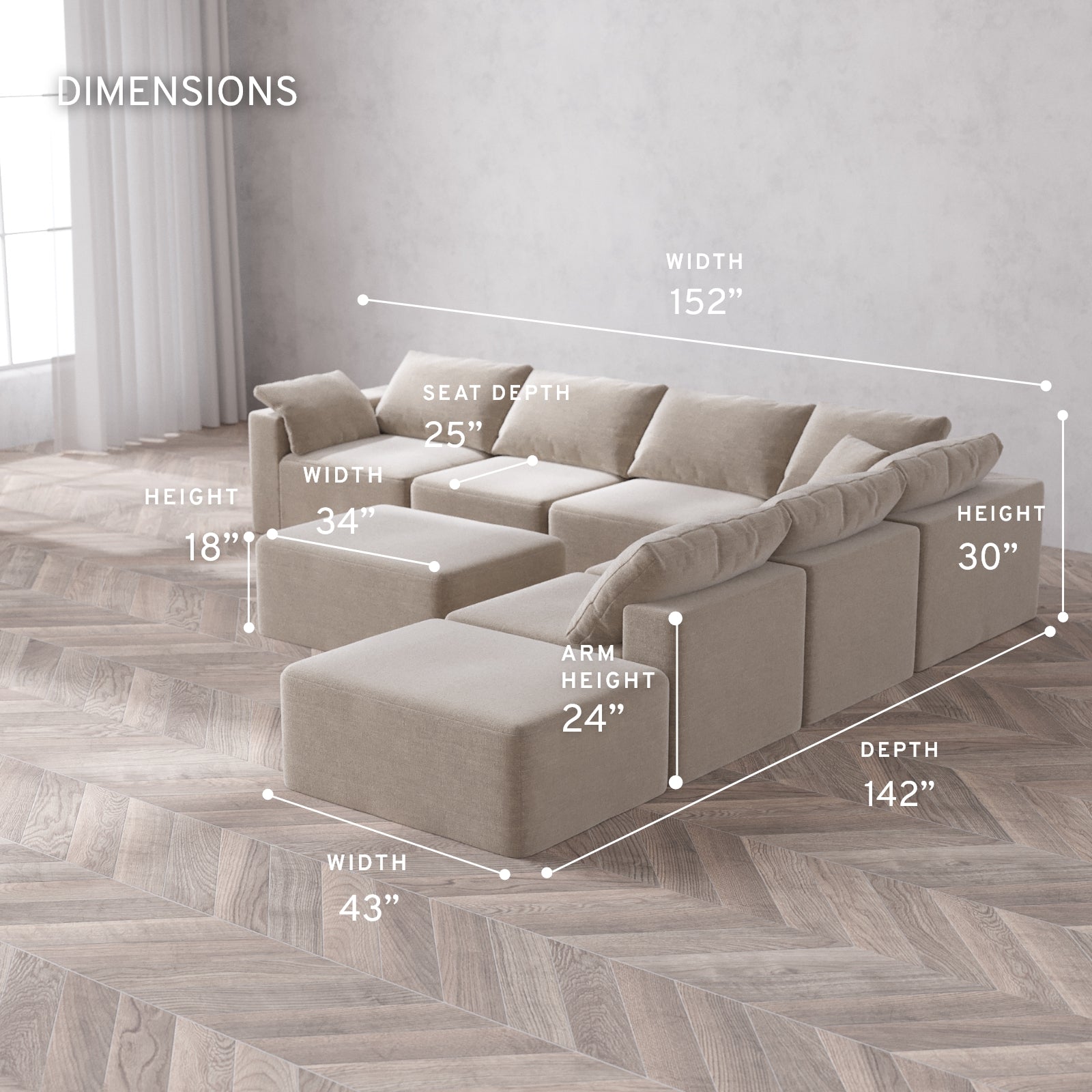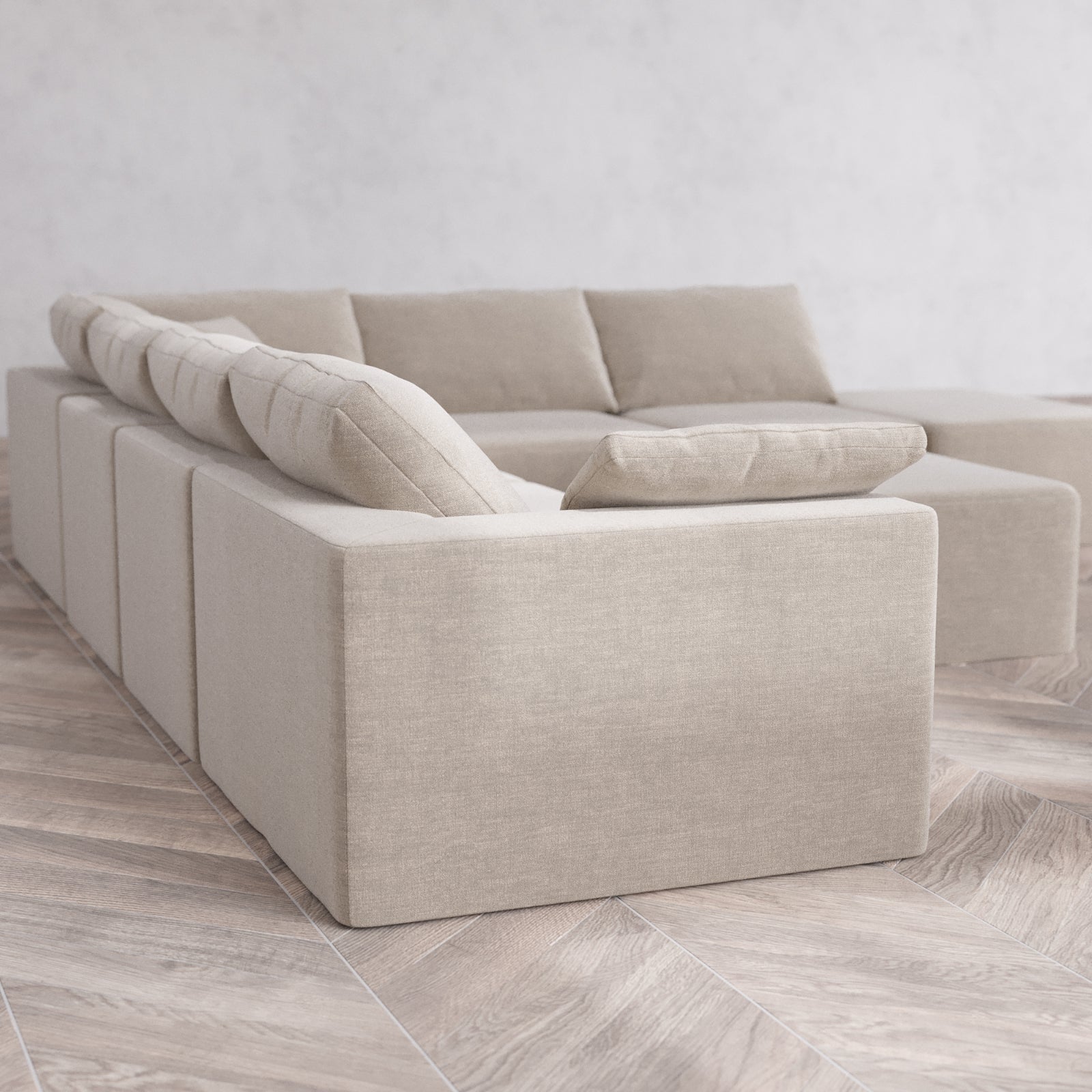 Modular Washable 7-Seater Open End Corner Sectional + Chaise Ottoman Cloud Sofa | Left-Facing Arm | Satin Velvet in Caraway