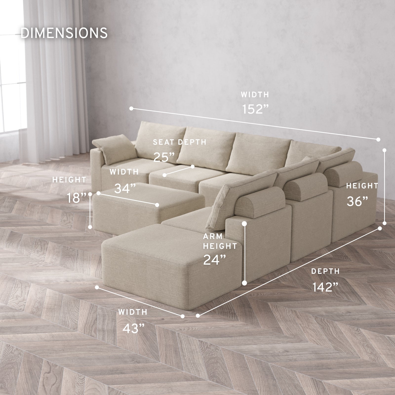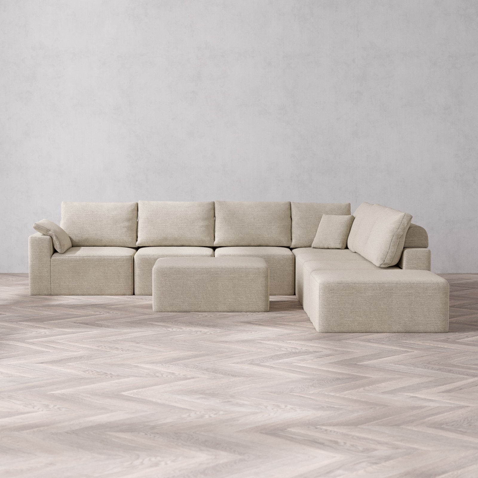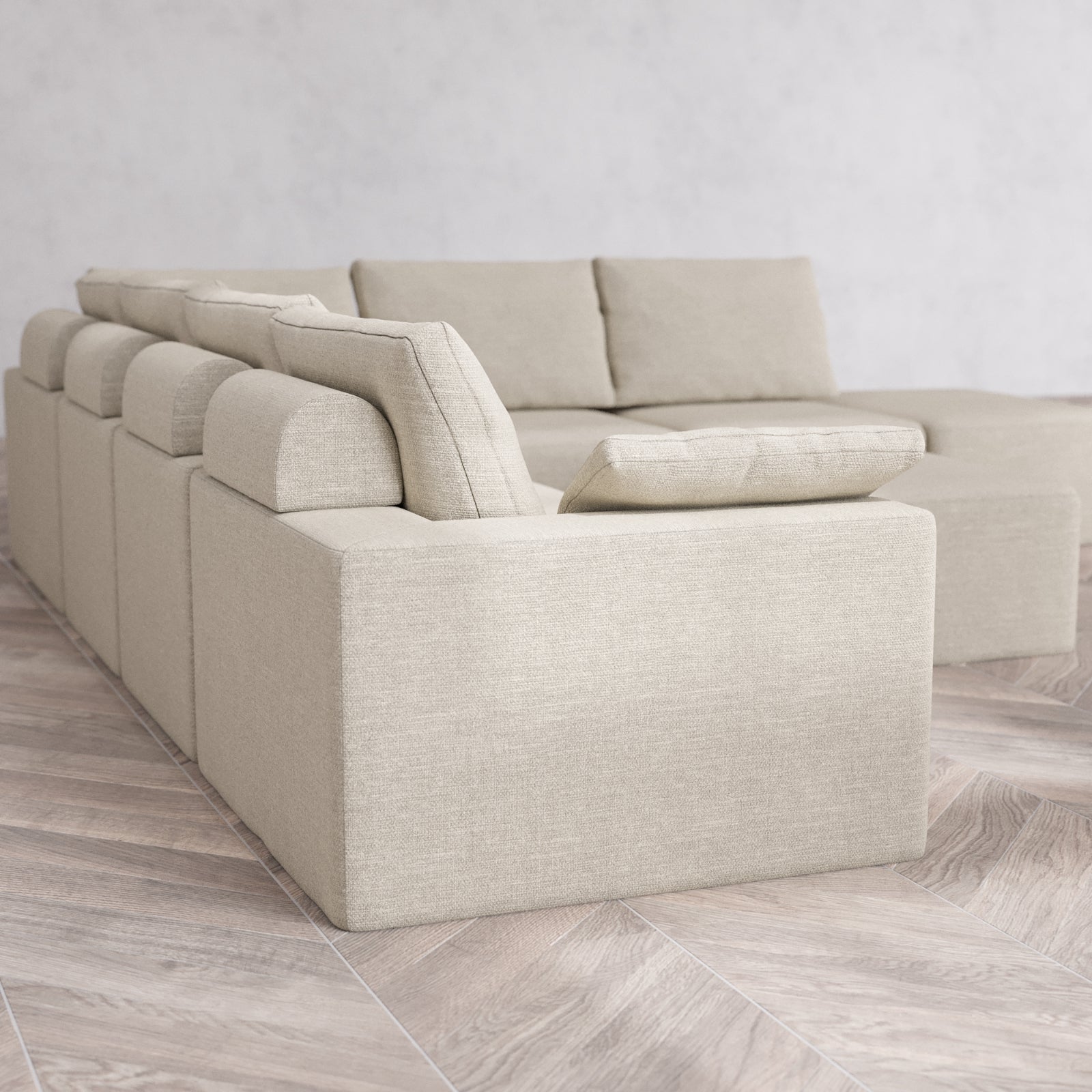 Modular Washable 7-Seater Open End Corner Sectional + Chaise Ottoman Cloud + Bolster Sofa | Left-Facing Arm | Plush Twill in Sandstone