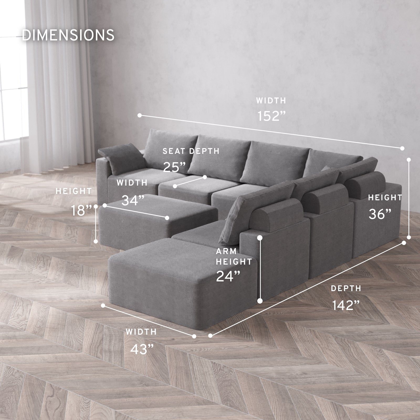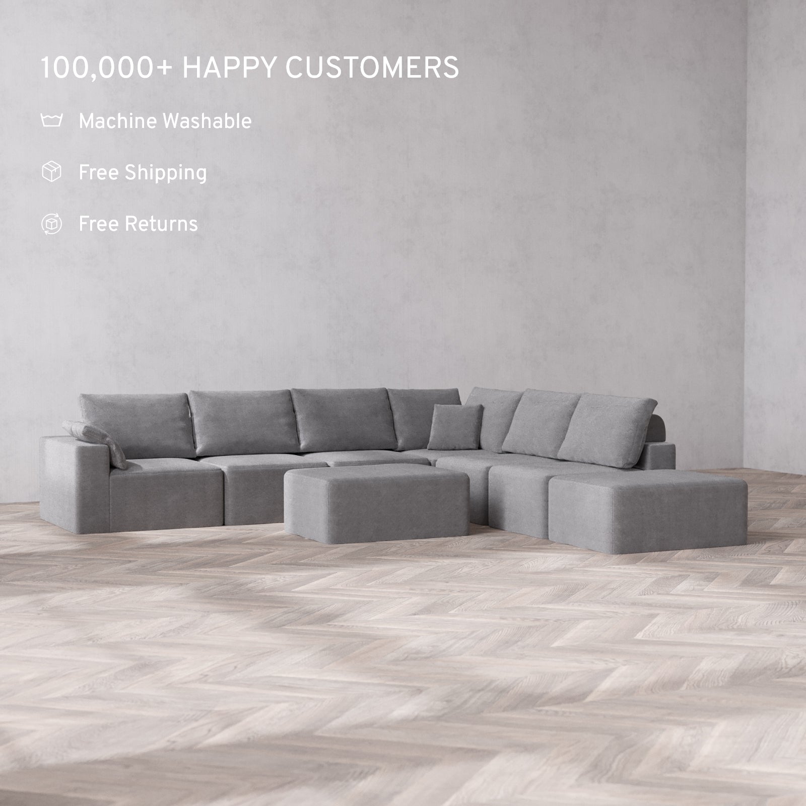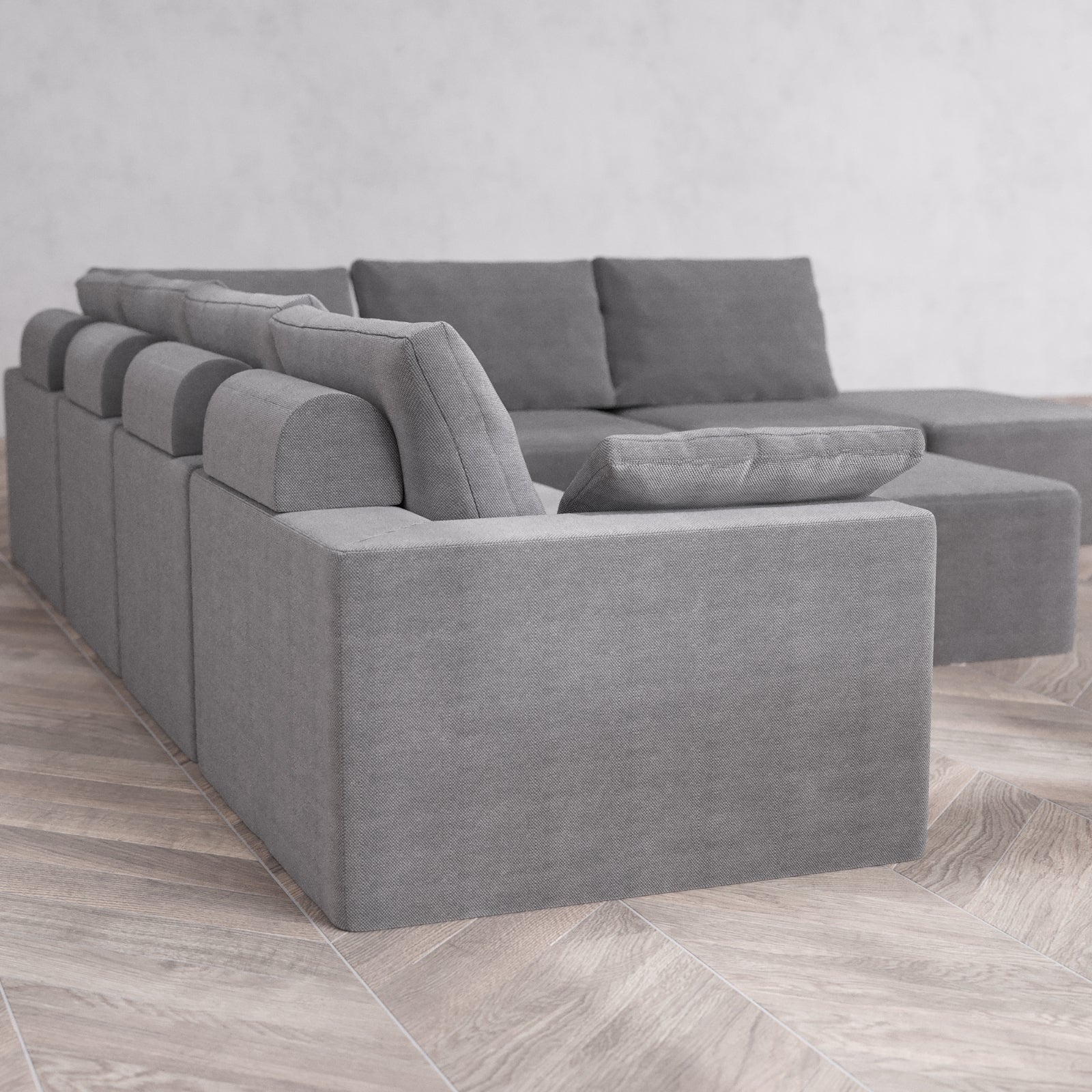 Modular Washable 7-Seater Open End Corner Sectional + Chaise Ottoman Cloud + Bolster Sofa | Left-Facing Arm | Lux Weave in Slate