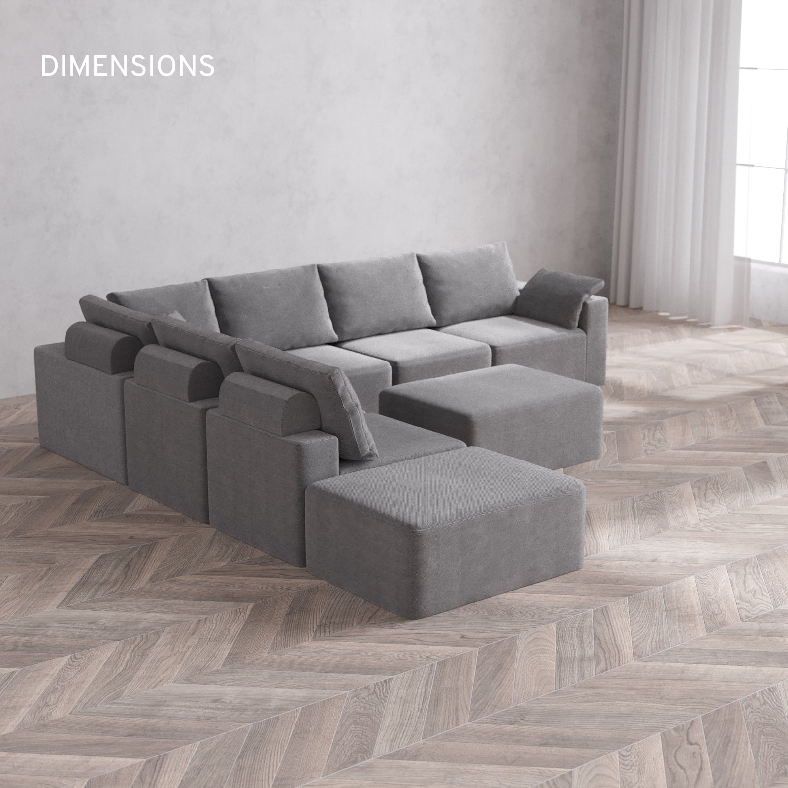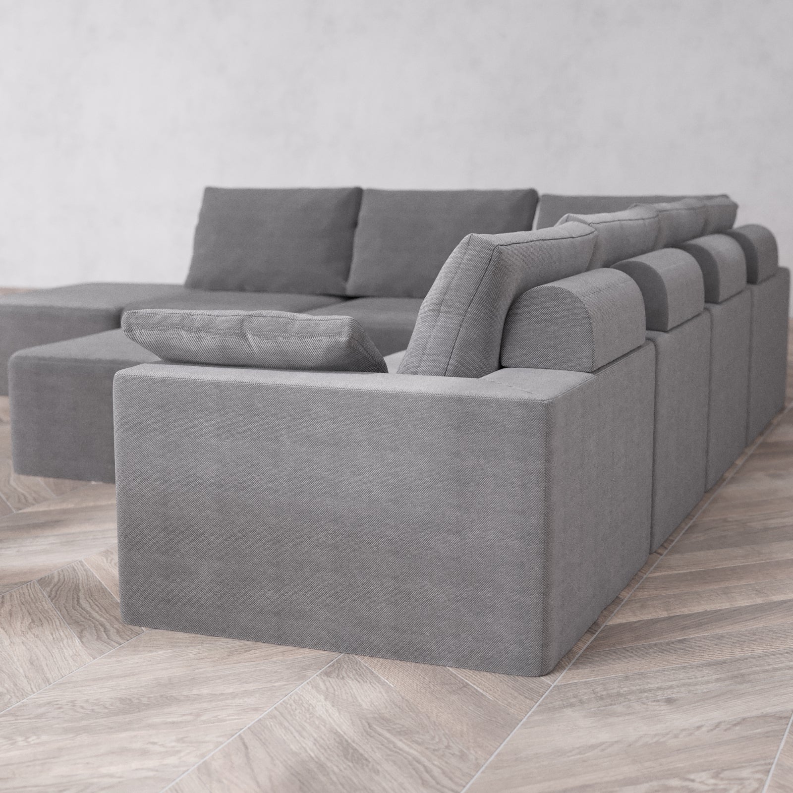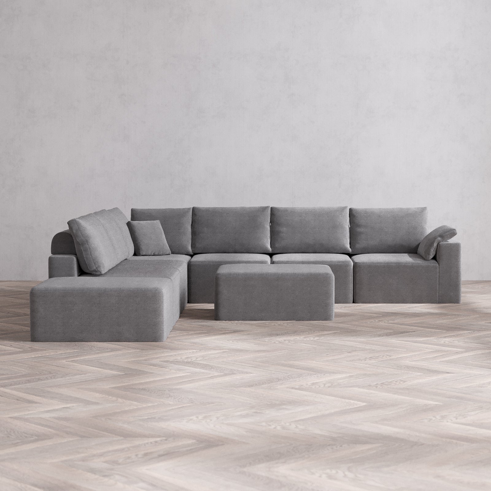 Modular Washable 7-Seater Open End Corner Sectional + Chaise Ottoman Cloud + Bolster Sofa | Right-Facing Arm | Lux Weave in Slate