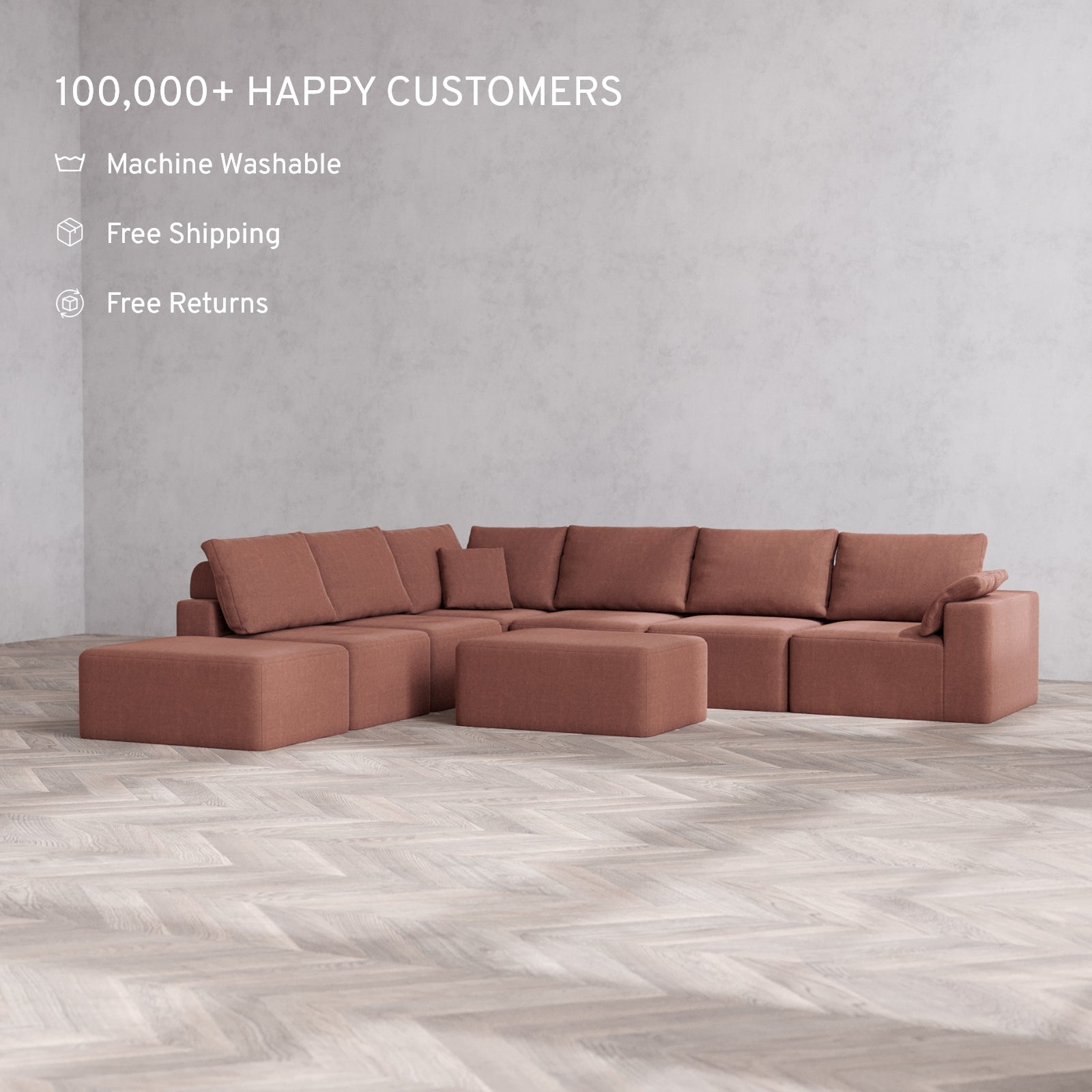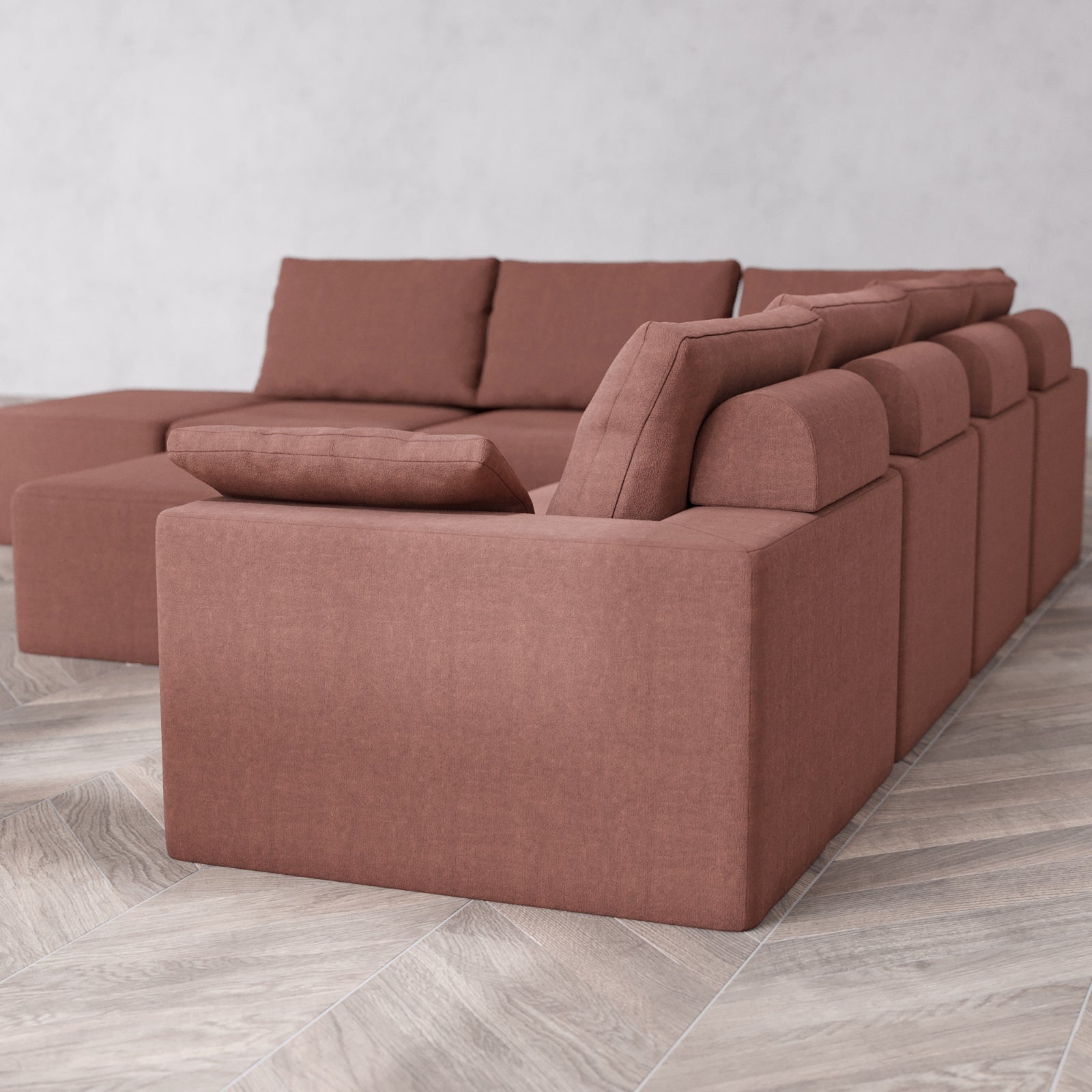Modular Washable 7-Seater Open End Corner Sectional + Chaise Ottoman Cloud + Bolster Sofa | Right-Facing Arm | Heirloom Velvet in Sumac