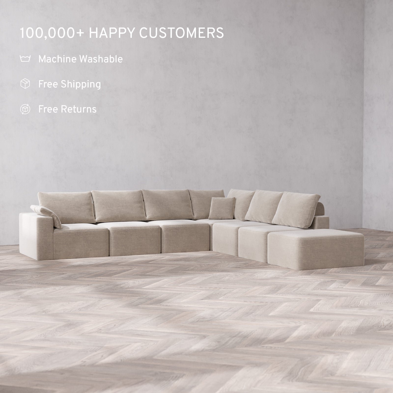 The Only Washable Cloud Sofa: With a waterproof frame and fabrics that resist pets, stains, and spills, this sofa is made to handle everyday messes. Our patent-pending covers are machine washable and fully interchangeable—buy extra sets to change up your look anytime.
