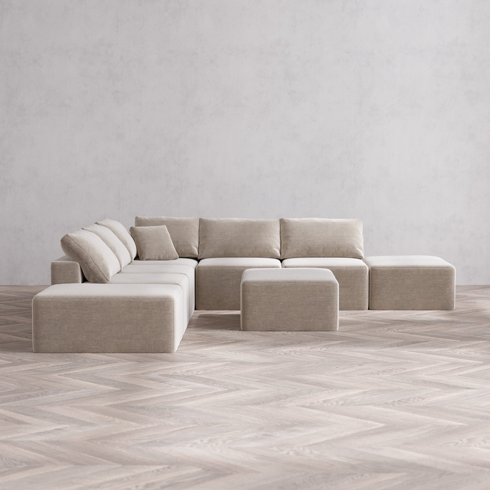 Modular Washable 7-Seater Open-Ends Corner Sectional + Chaise Ottoman Cloud Sofa | Satin Velvet in Caraway