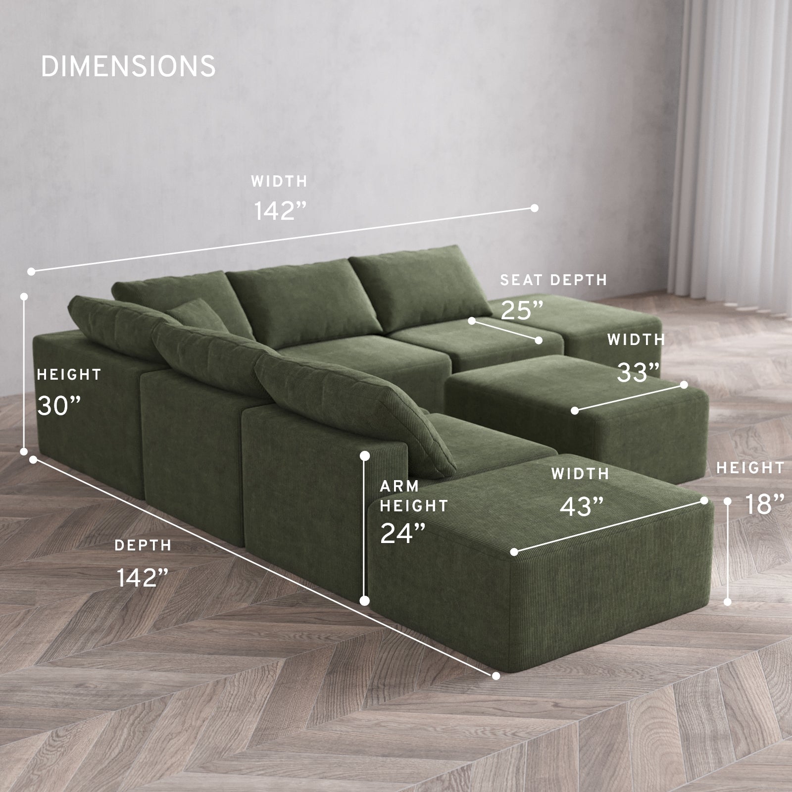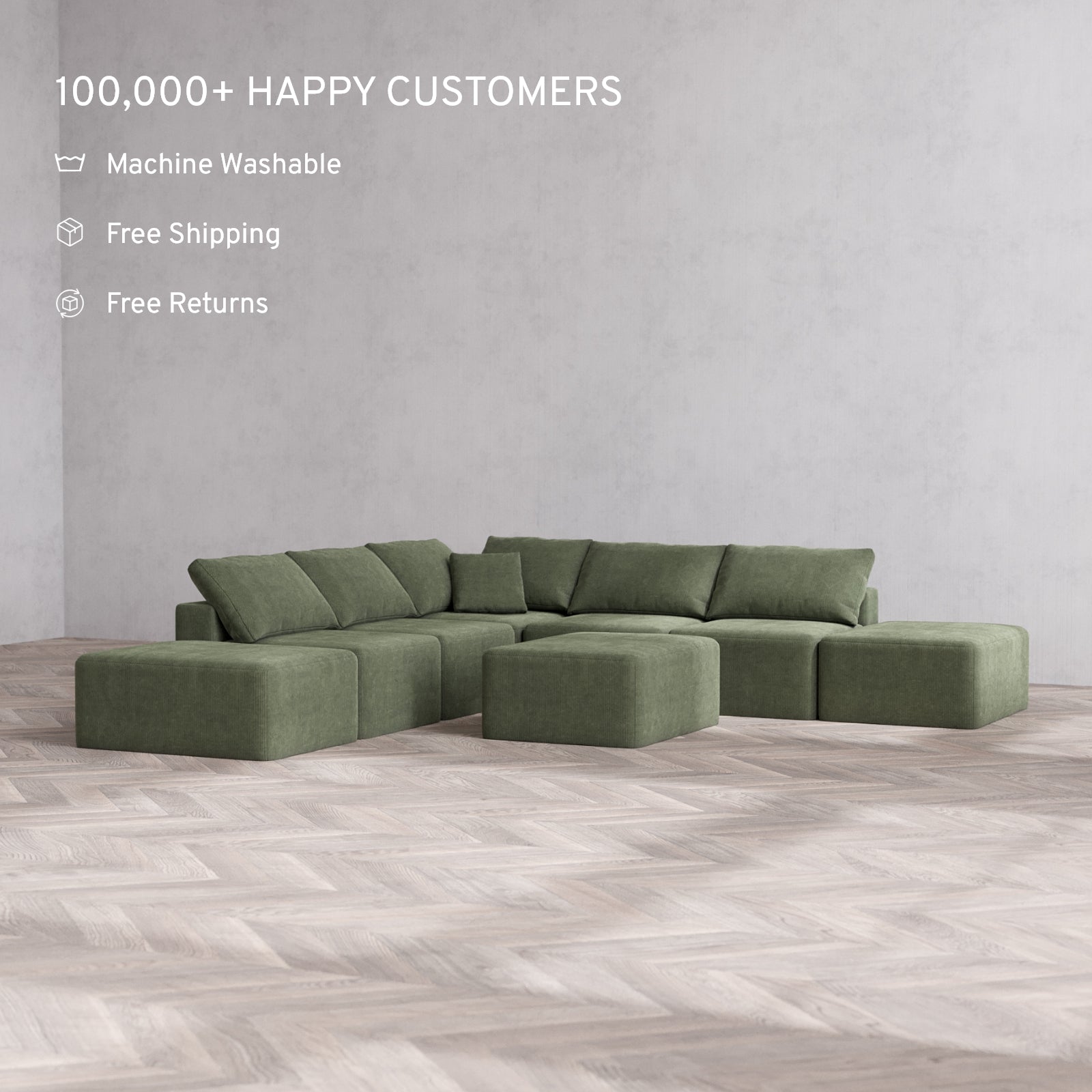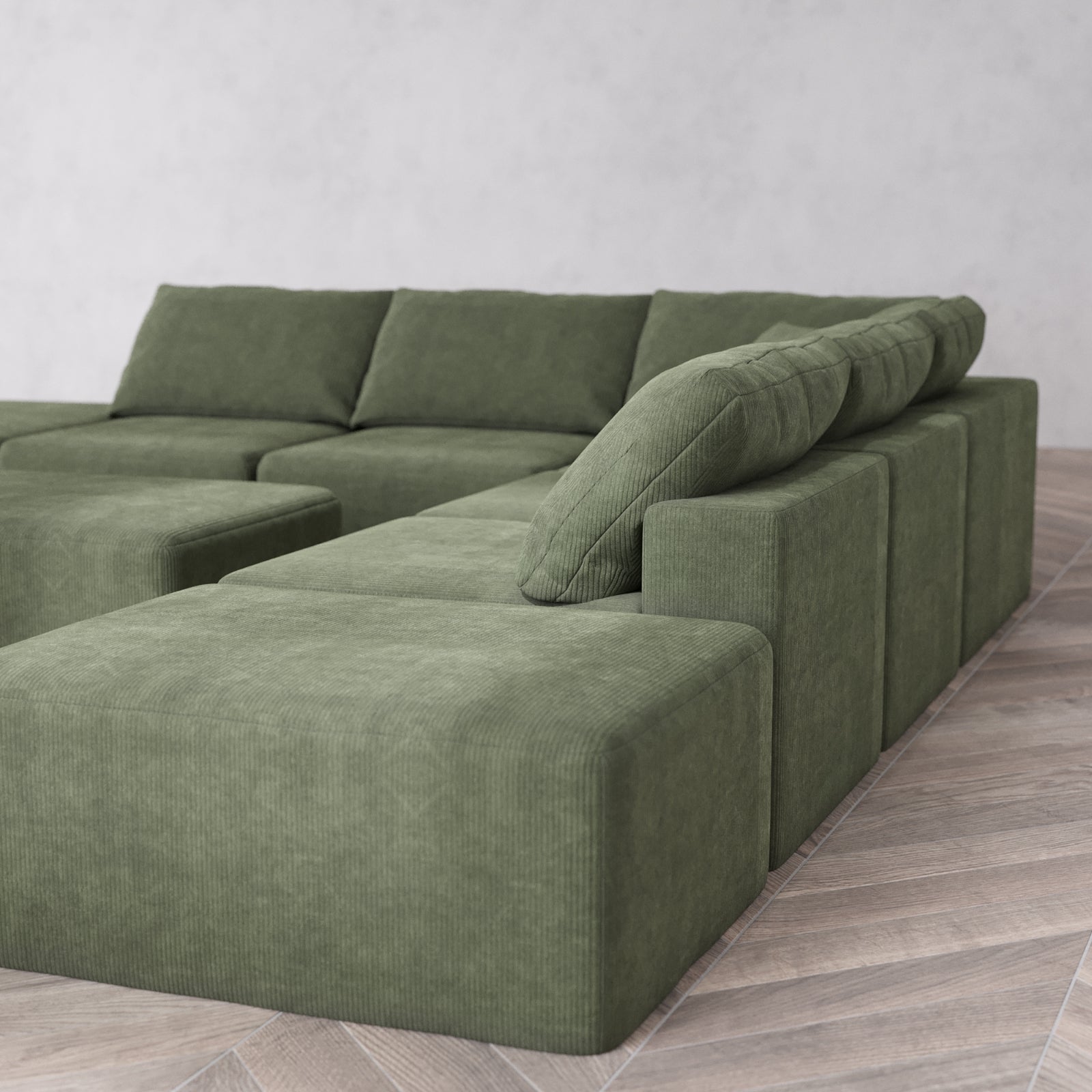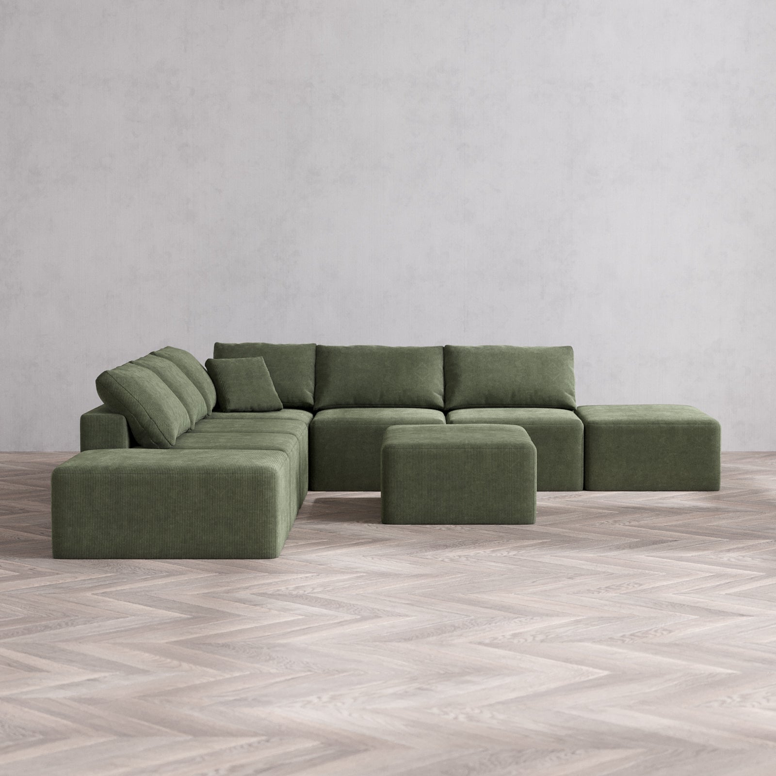 Modular Washable 7-Seater Open-Ends Corner Sectional + Chaise Ottoman Cloud Sofa | Luxe Corduroy in Juniper