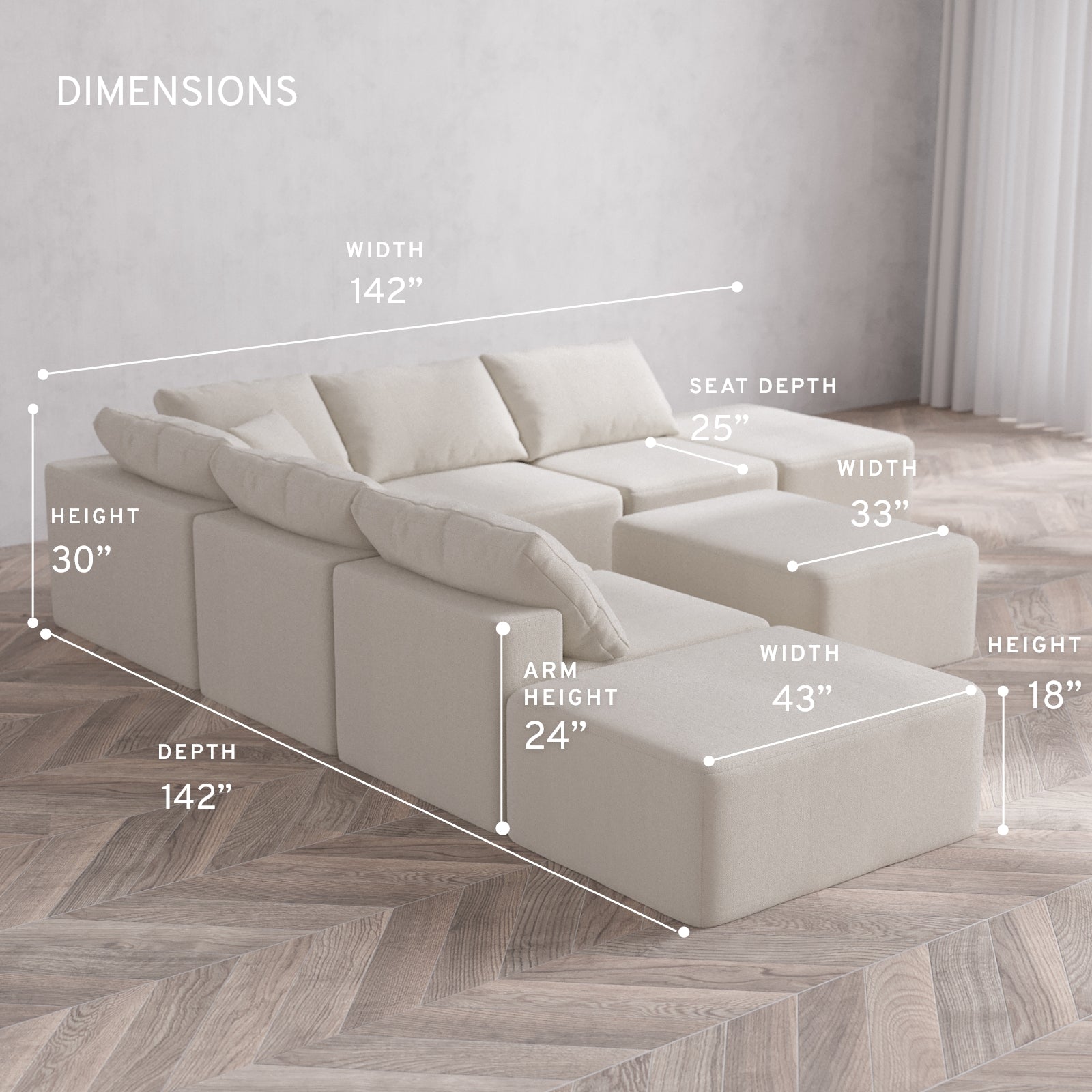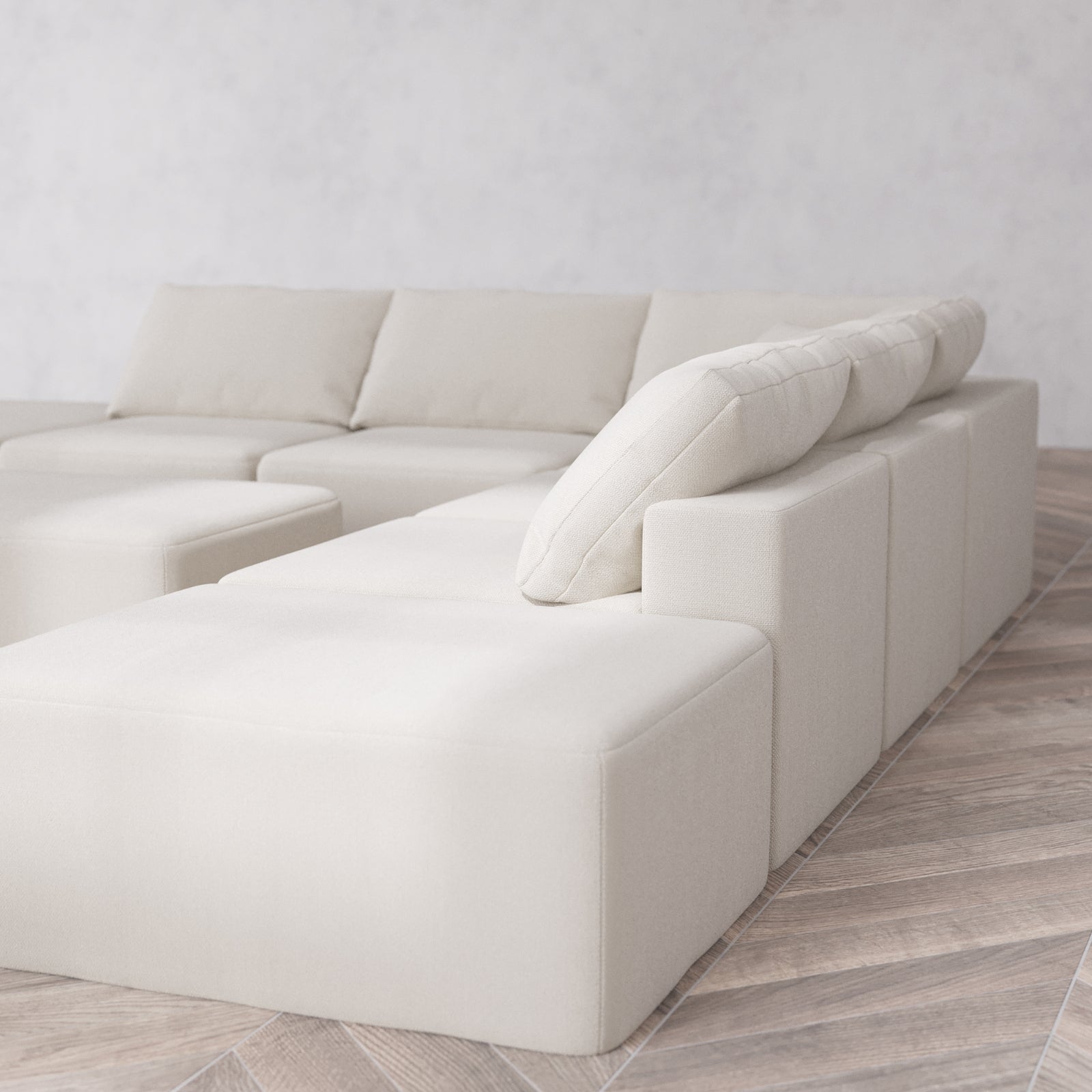 Modular Washable 7-Seater Open-Ends Corner Sectional + Chaise Ottoman Cloud Sofa | Lux Weave in Pearl