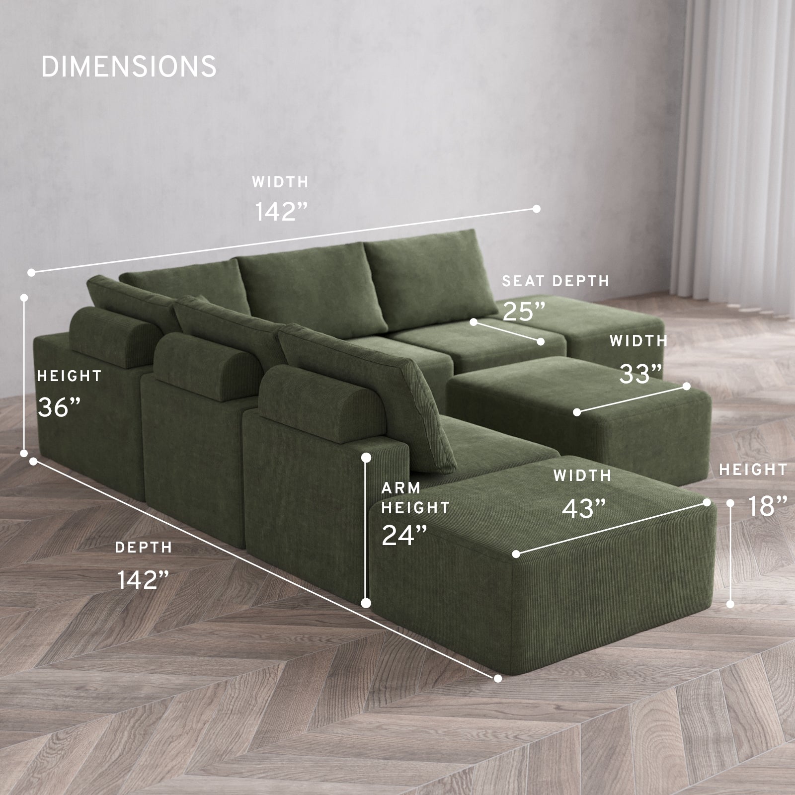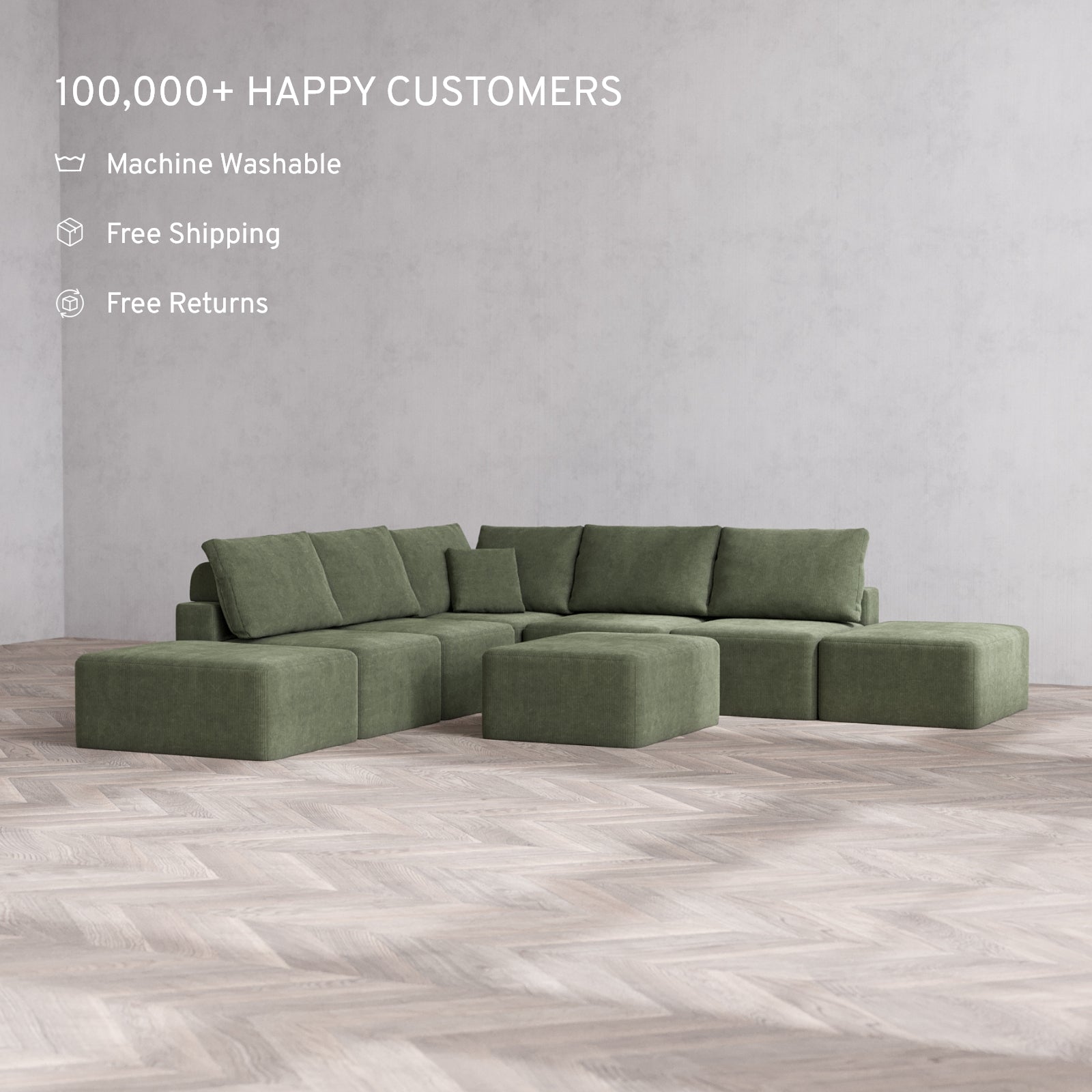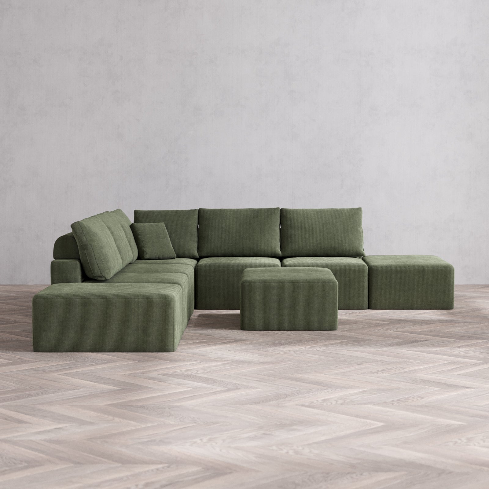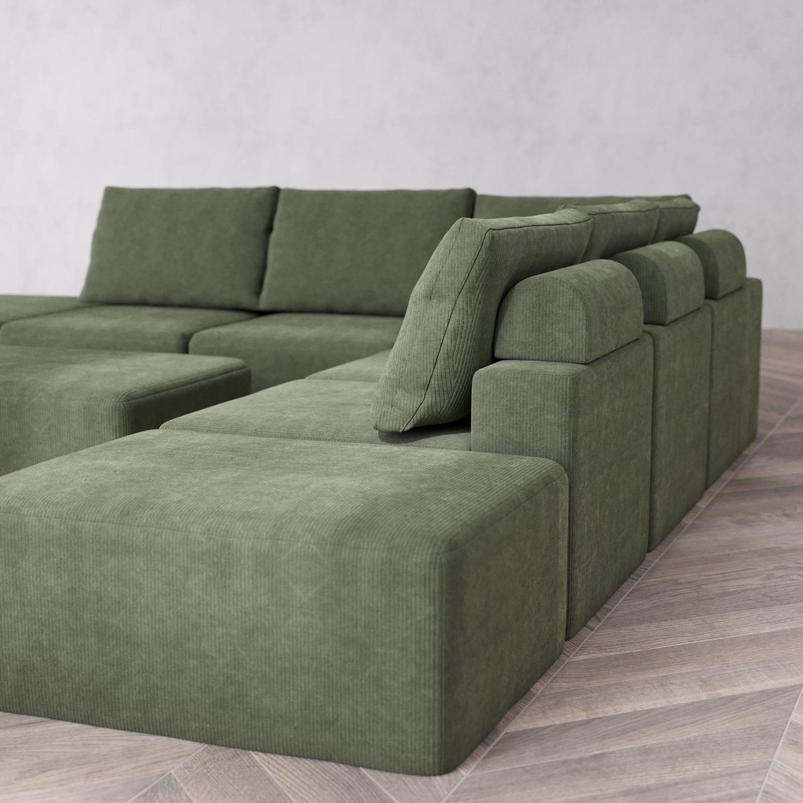 Modular Washable 7-Seater Open-Ends Corner Sectional + Chaise Ottoman Cloud + Bolster Sofa | Luxe Corduroy in Juniper