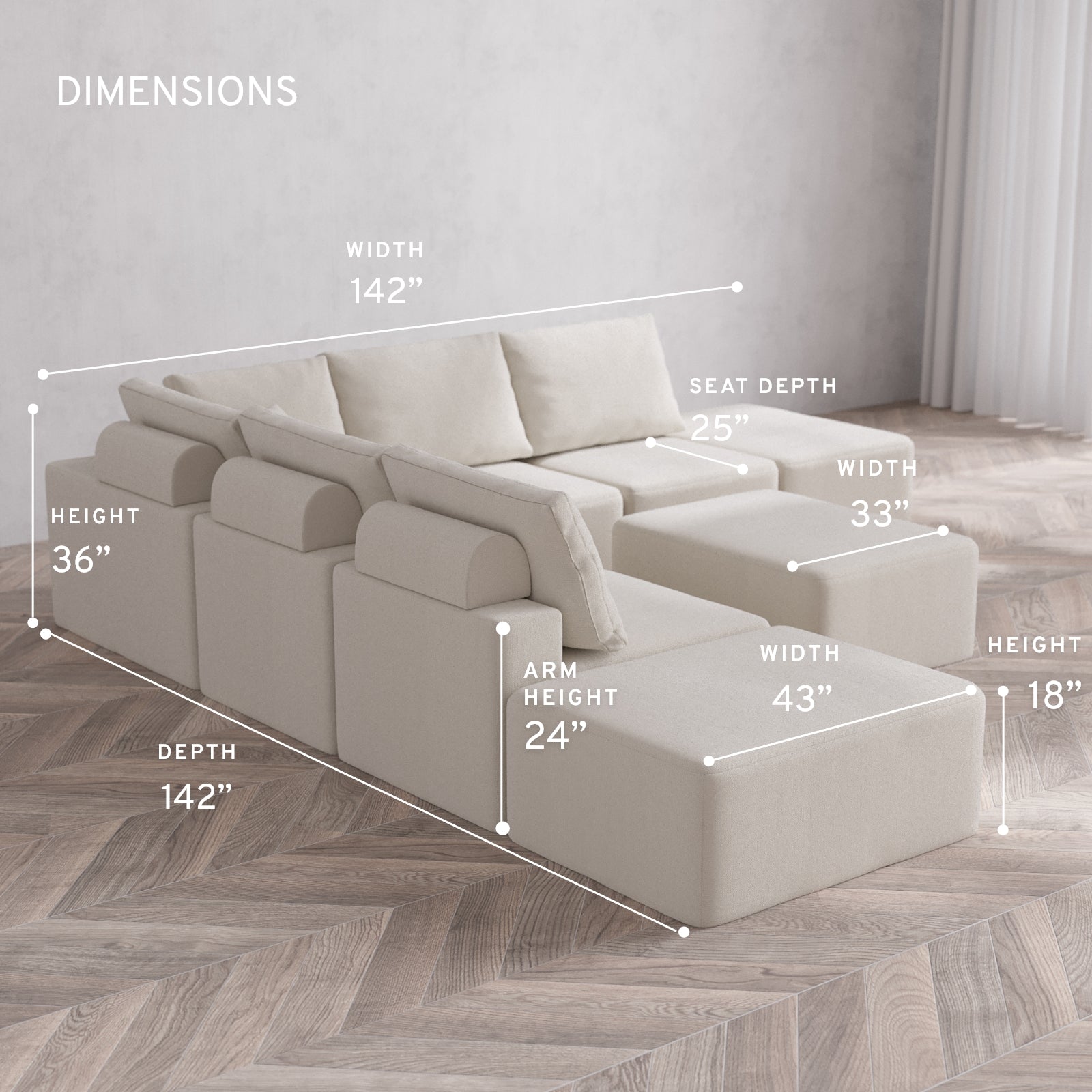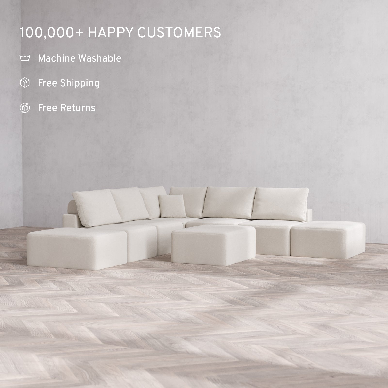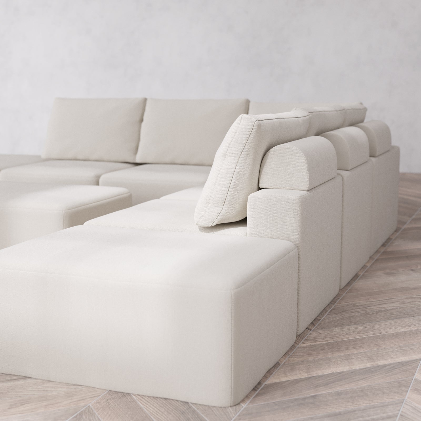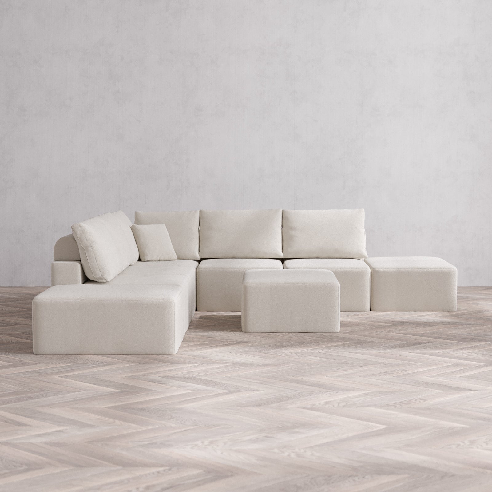 Modular Washable 7-Seater Open-Ends Corner Sectional + Chaise Ottoman Cloud + Bolster Sofa | Lux Weave in Pearl