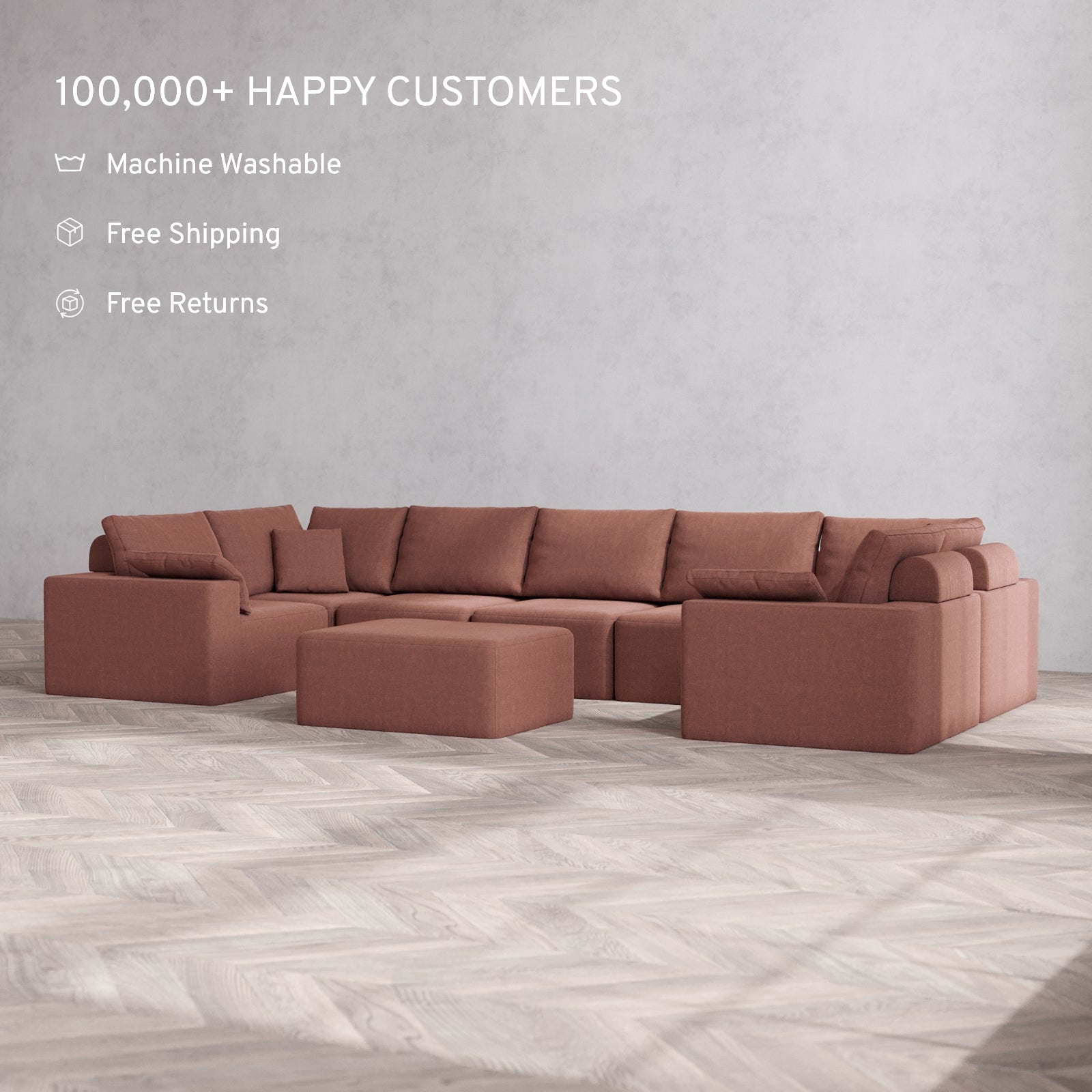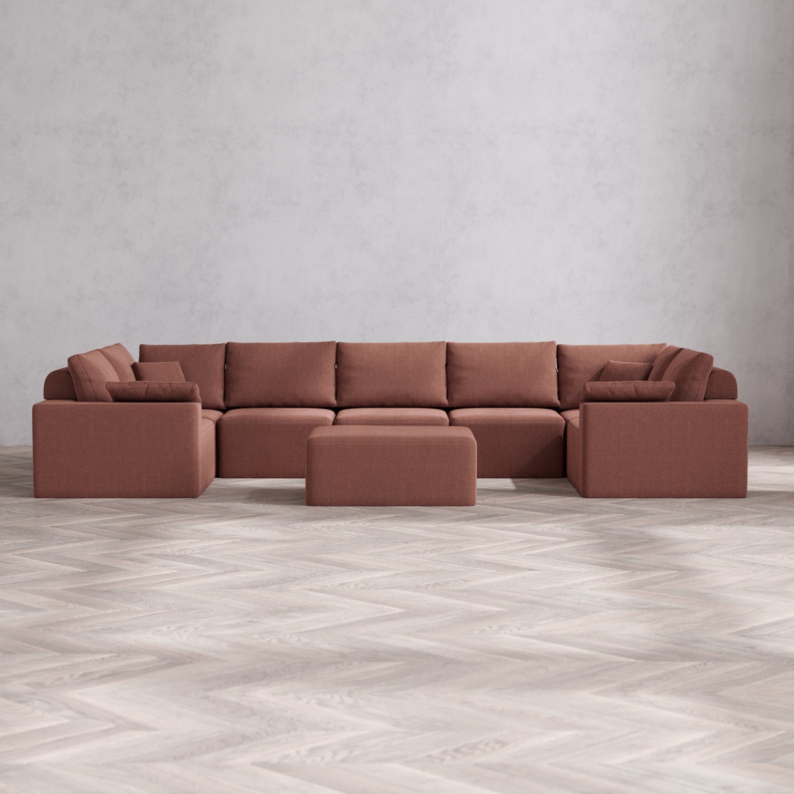 Modular Washable 7-Seater U Sectional + Chaise Ottoman Cloud + Bolster Sofa | Heirloom Velvet in Sumac
