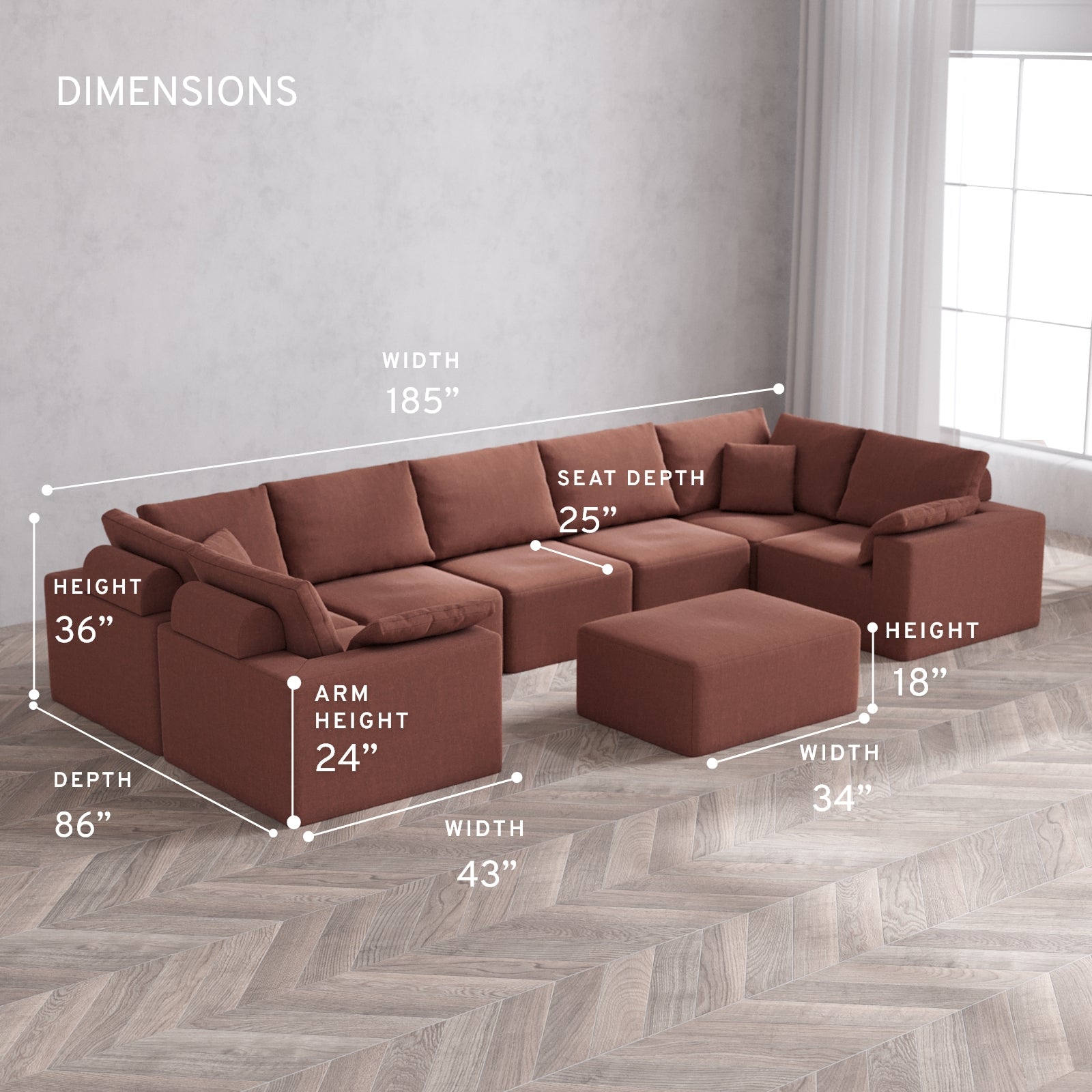 185” Wide, 86” Deep, 36” Tall