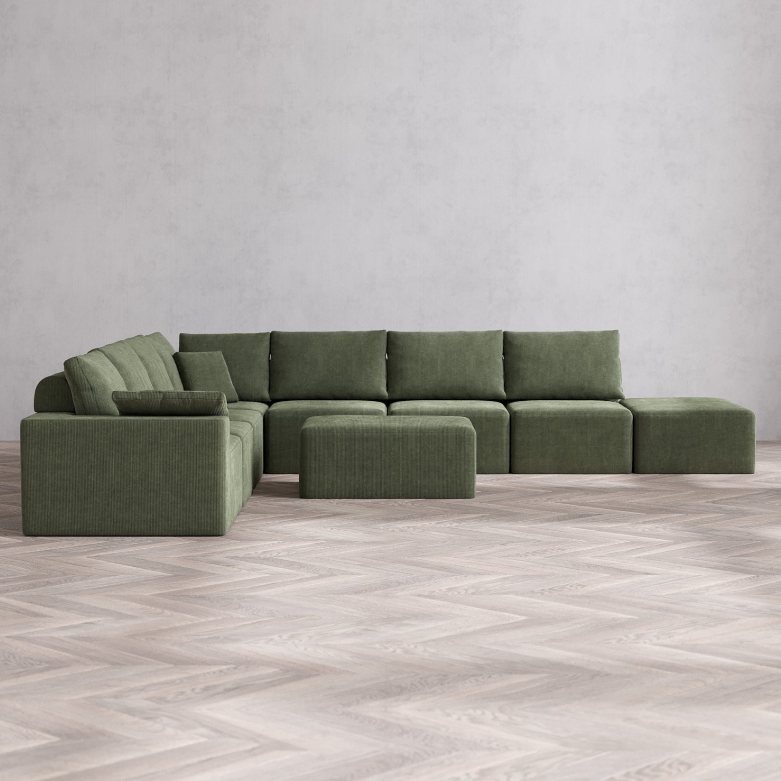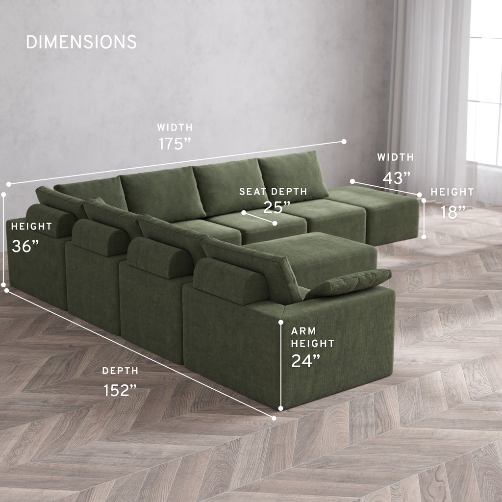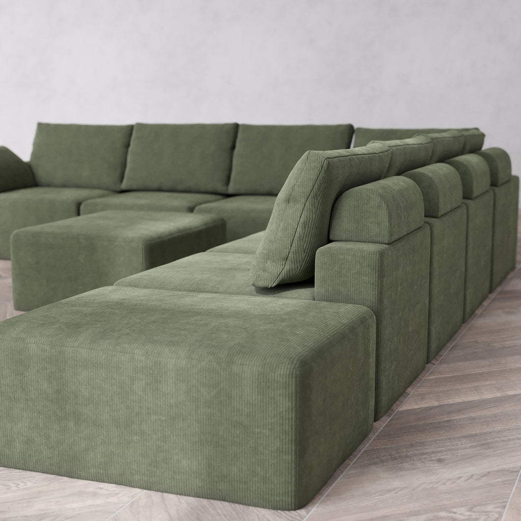 Modular Washable 8-Seater Open End Corner Sectional + Chaise Ottoman Cloud + Bolster Sofa | Left-Facing Arm | Luxe Corduroy in Juniper