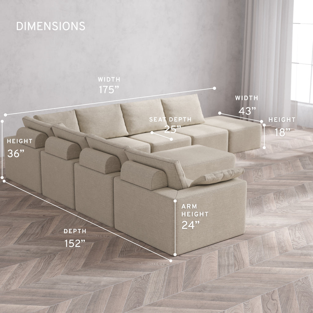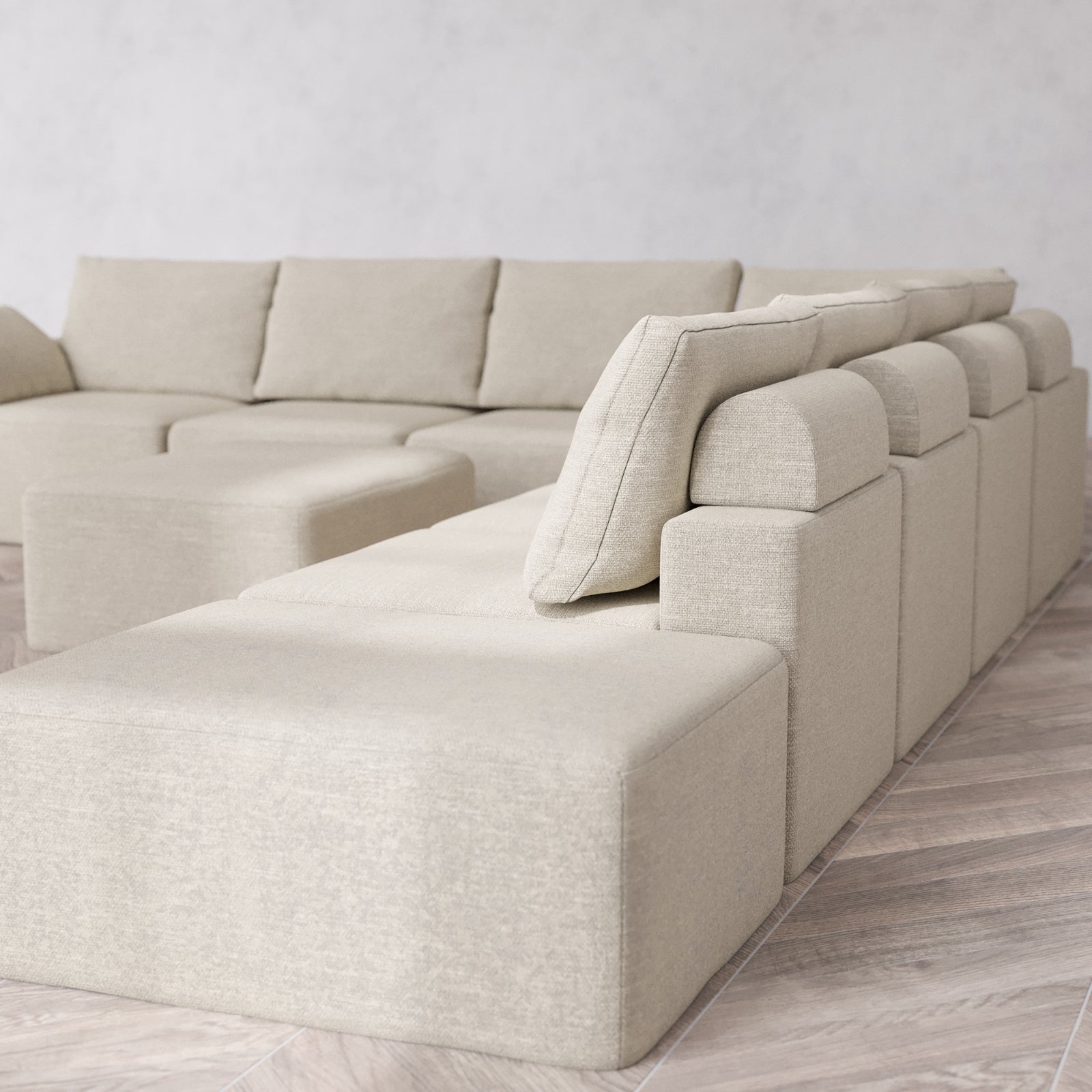 Modular Washable 8-Seater Open End Corner Sectional + Chaise Ottoman Cloud + Bolster Sofa | Left-Facing Arm | Plush Twill in Sandstone
