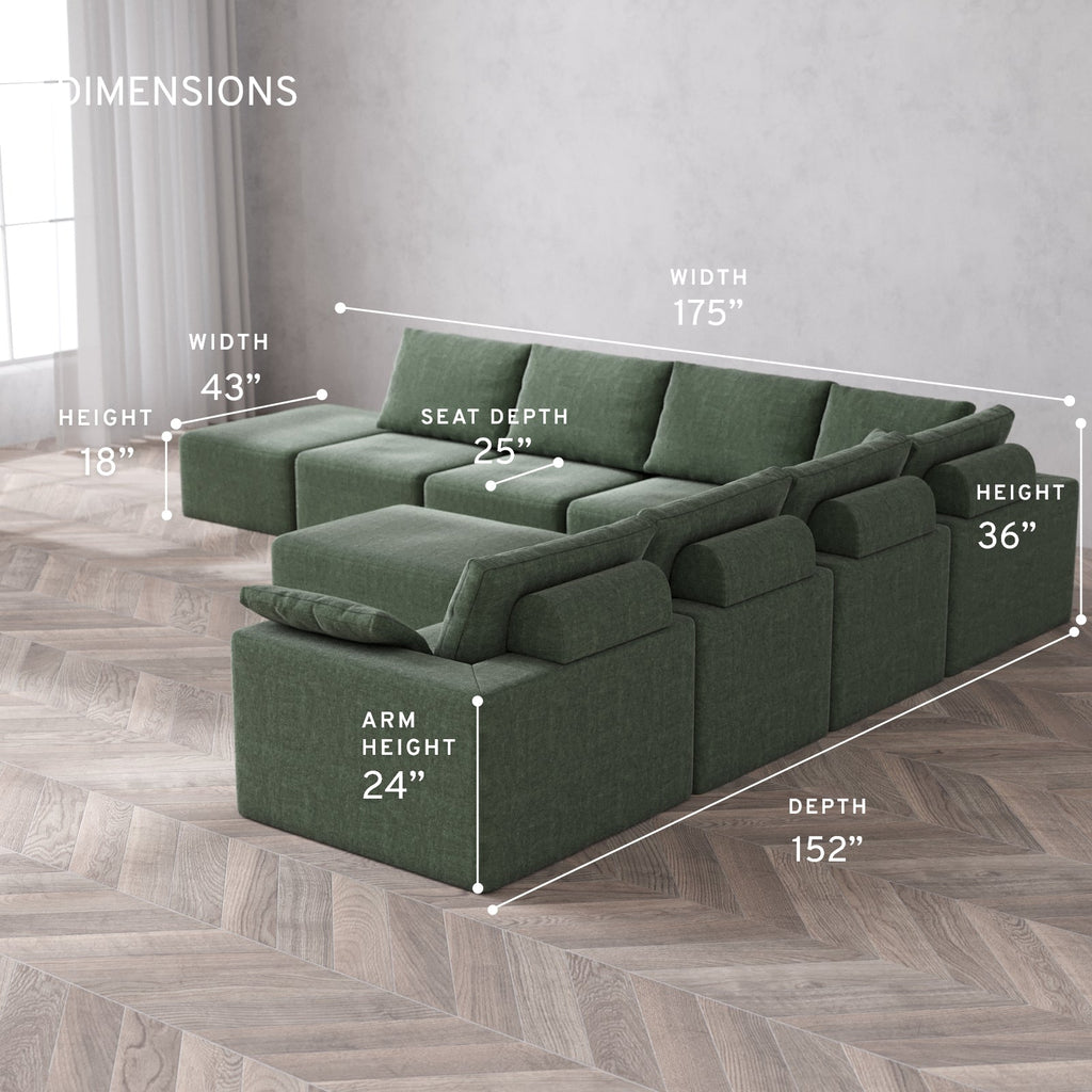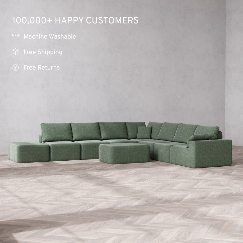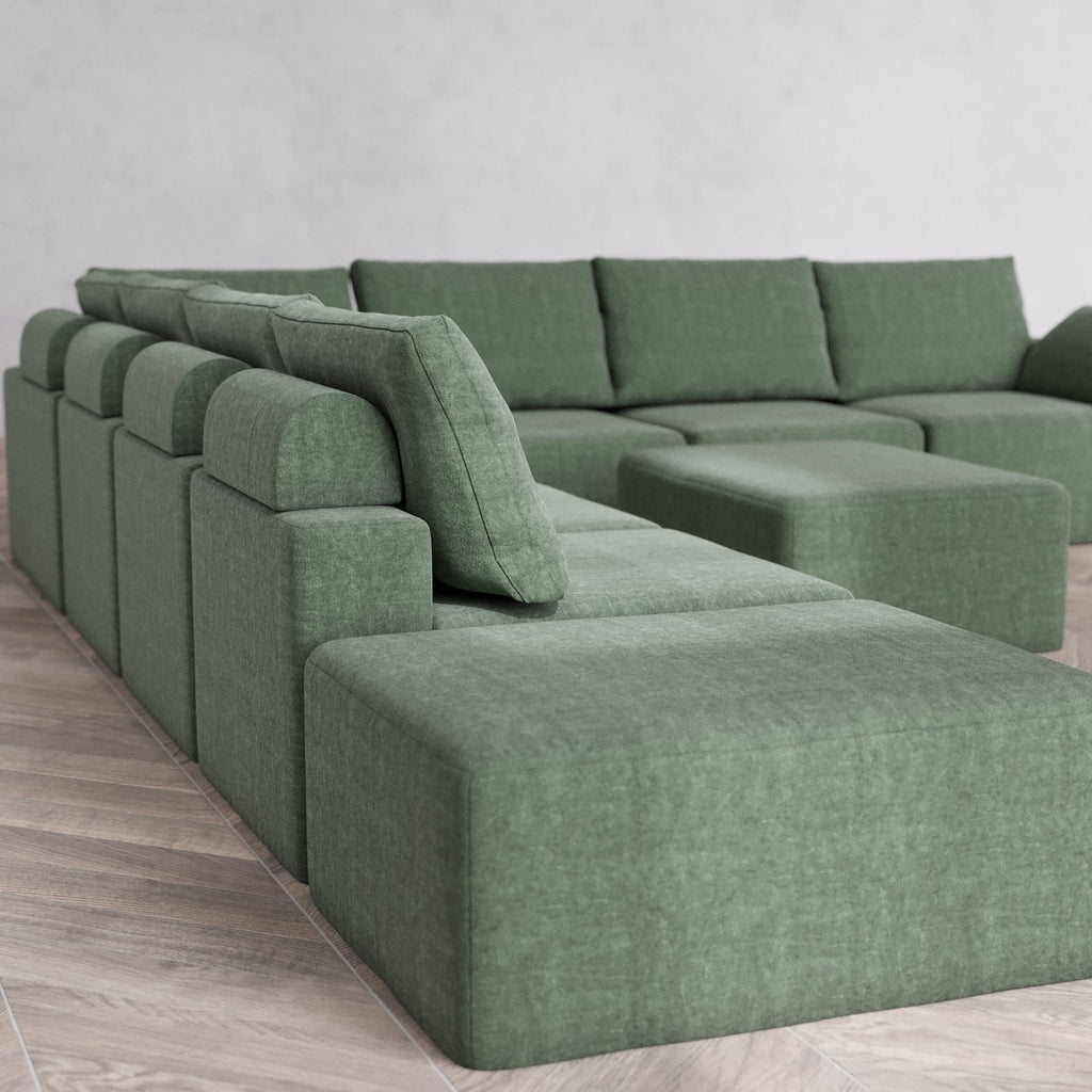 Modular Washable 8-Seater Open End Corner Sectional + Chaise Ottoman Cloud + Bolster Sofa | Right-Facing Arm | Heirloom Velvet in Sage