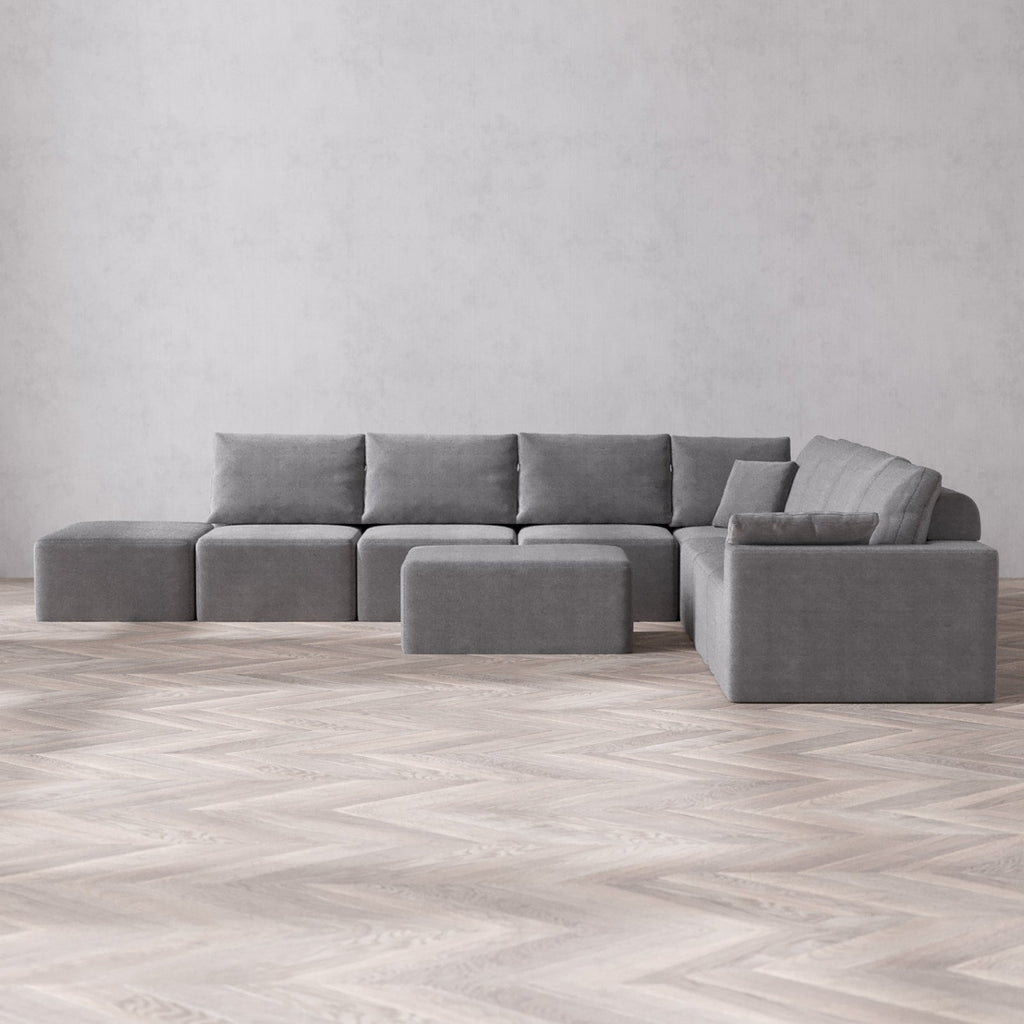 Modular Washable 8-Seater Open End Corner Sectional + Chaise Ottoman Cloud + Bolster Sofa | Right-Facing Arm | Lux Weave in Slate
