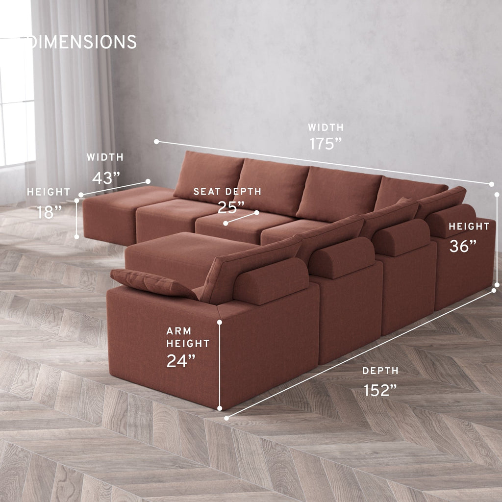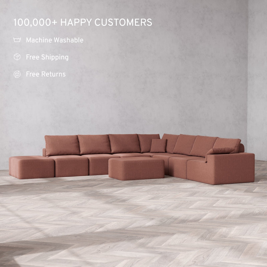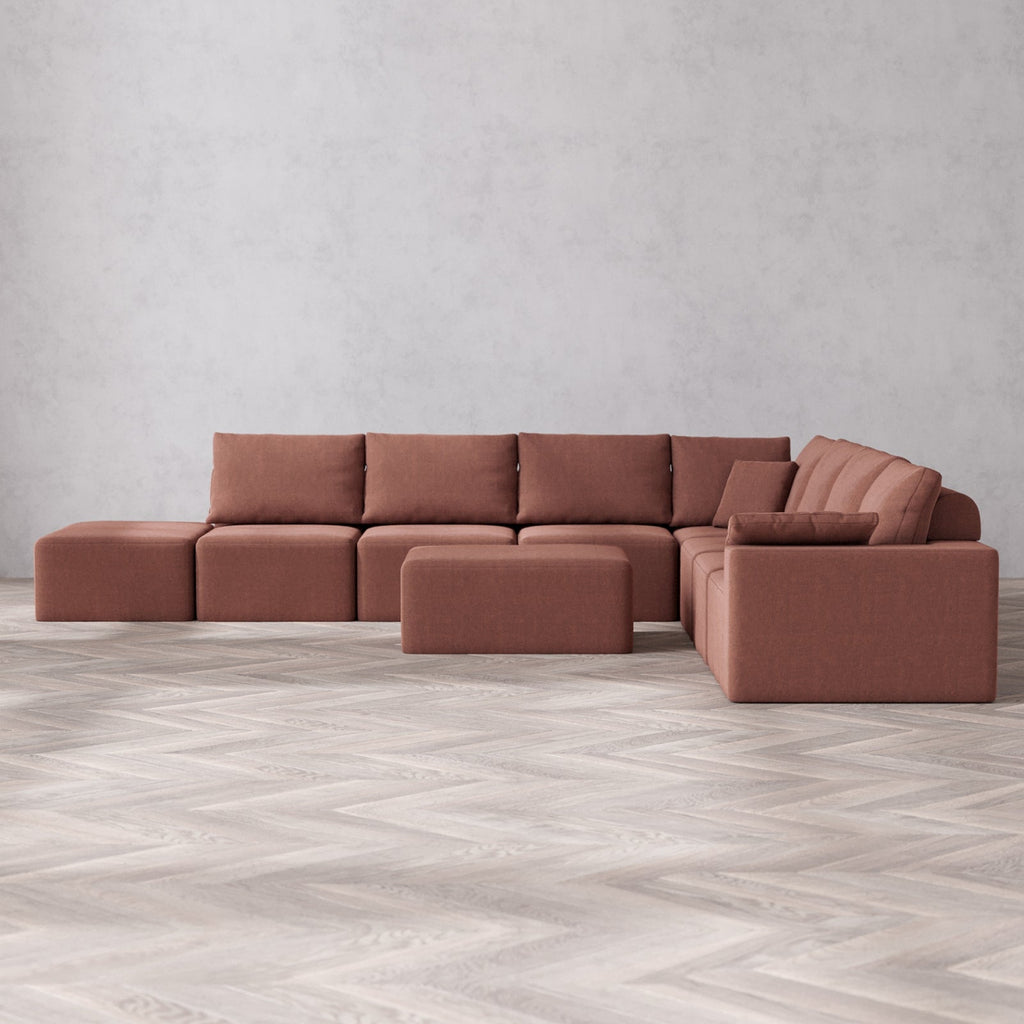 Modular Washable 8-Seater Open End Corner Sectional + Chaise Ottoman Cloud + Bolster Sofa | Right-Facing Arm | Heirloom Velvet in Sumac