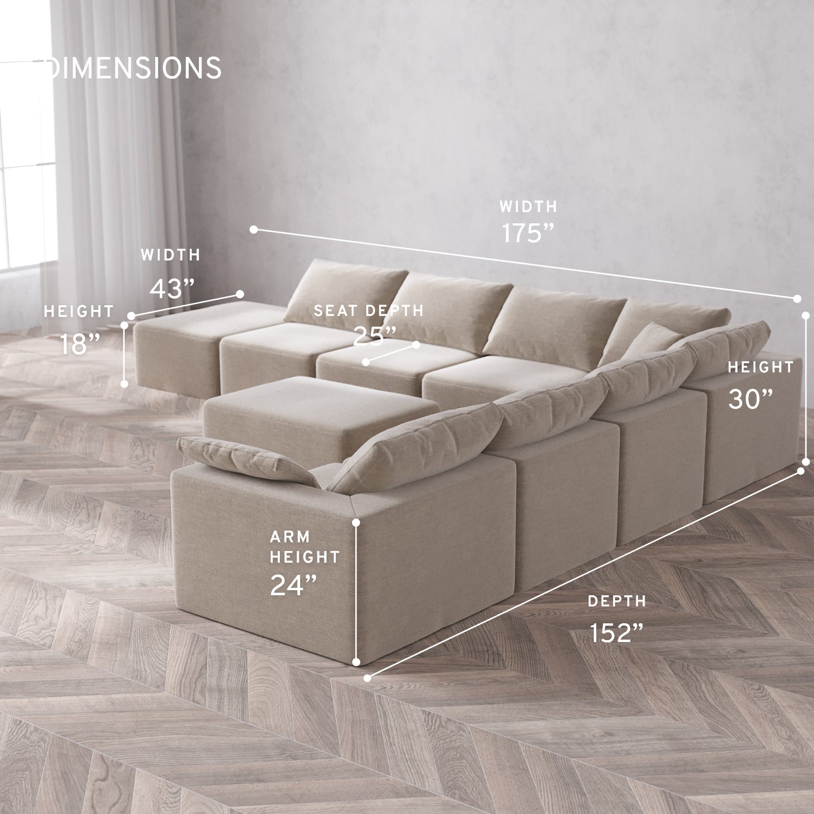 Modular Washable 8-Seater Open End Corner Sectional + Chaise Ottoman Cloud Sofa | Right-Facing Arm | Satin Velvet in Caraway