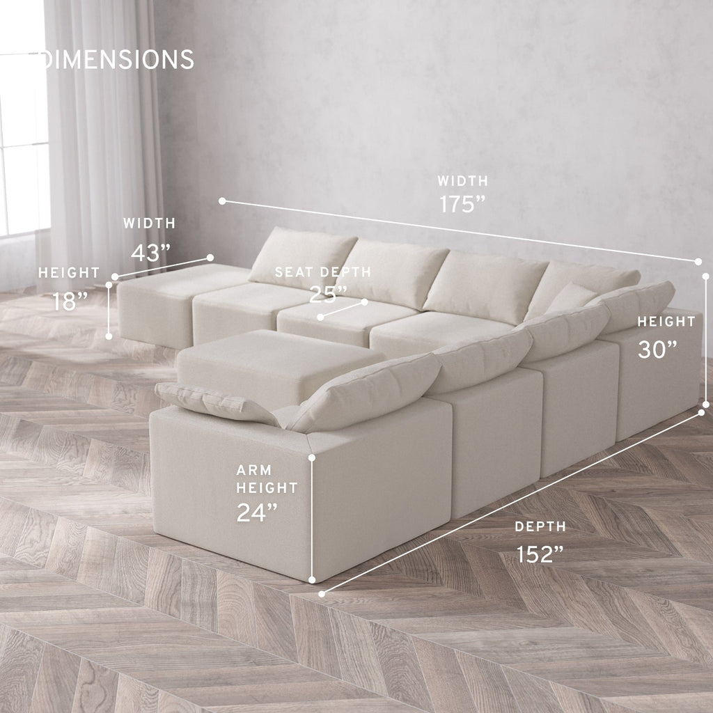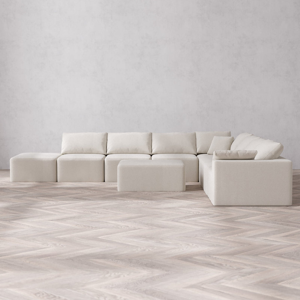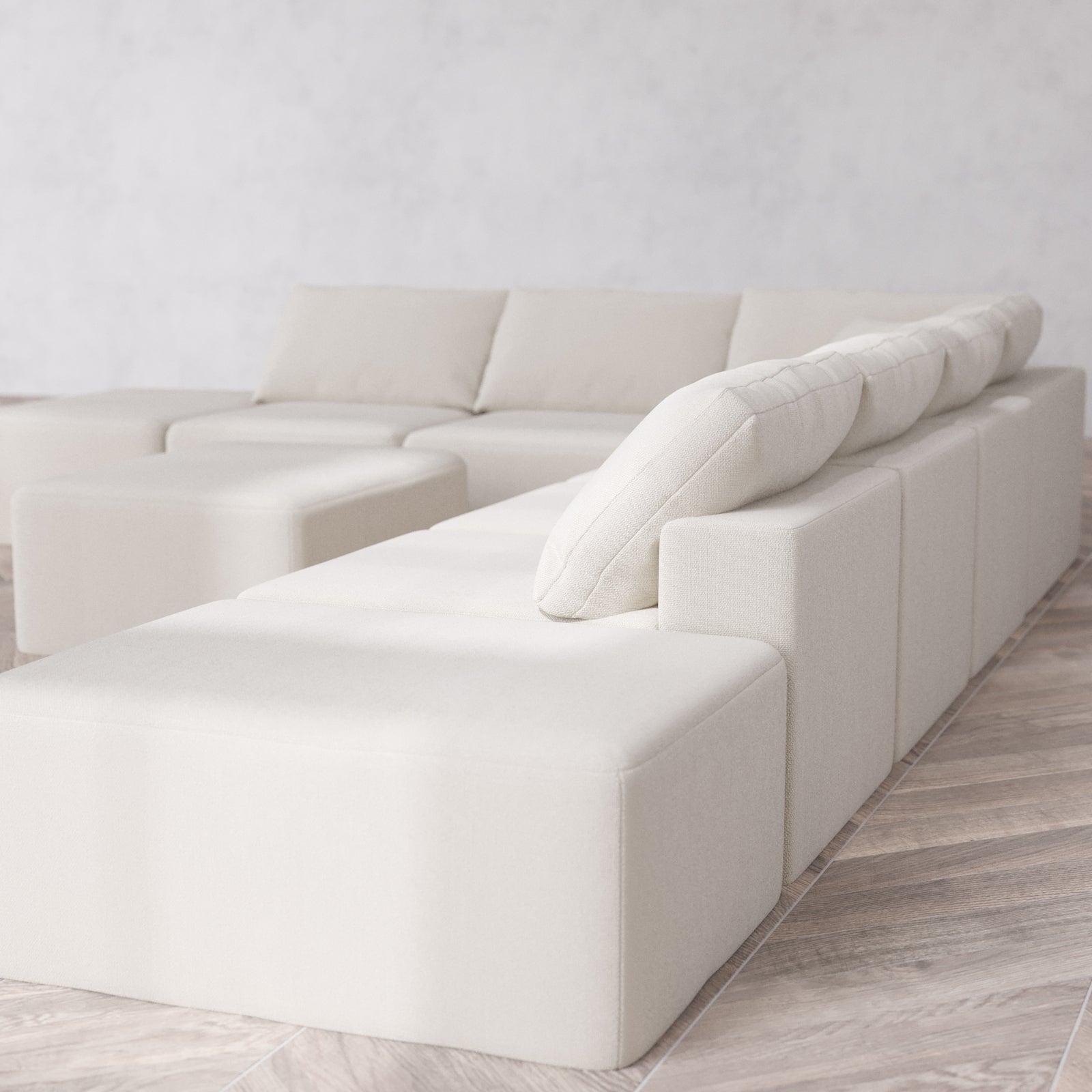 Modular Washable 8-Seater Open End Corner Sectional + Chaise Ottoman Cloud Sofa | Right-Facing Arm | Lux Weave in Pearl