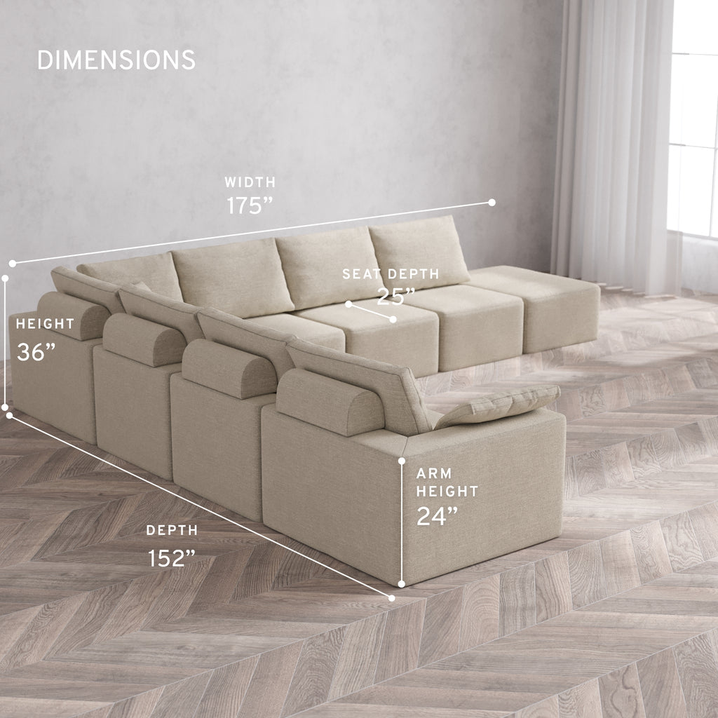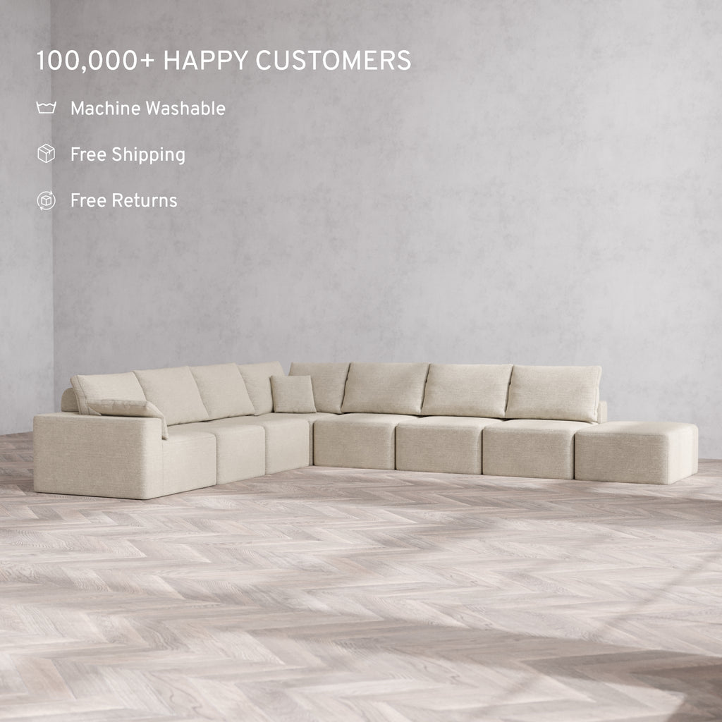 Modular Washable 8-Seater Open End Corner Sectional Cloud + Bolster Sofa | Left-Facing Arm | Plush Twill in Sandstone