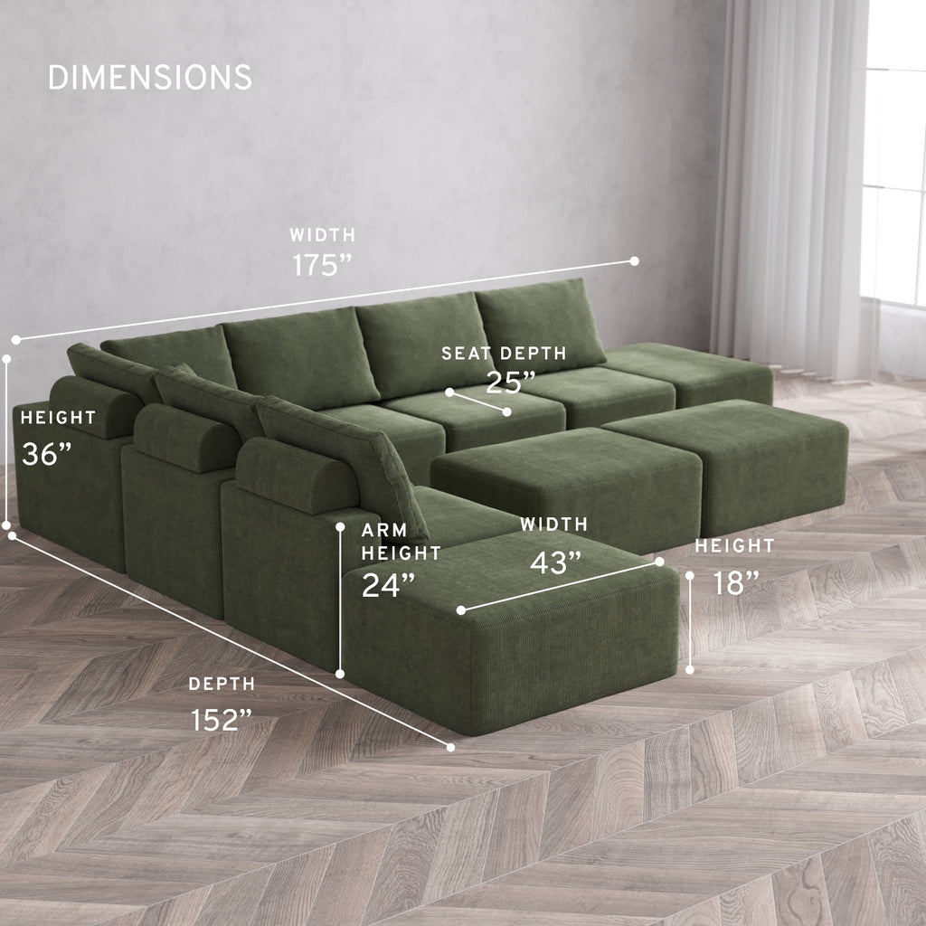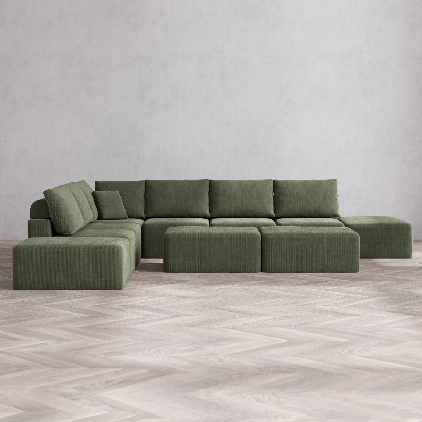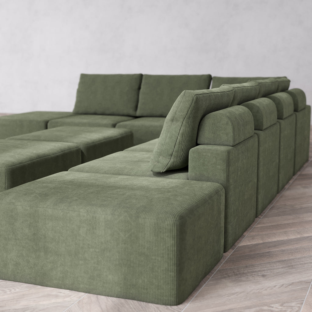 Modular Washable 8-Seater Open-Ends Corner Sectional + Chaise Ottoman Bench Cloud + Bolster Sofa | Luxe Corduroy in Juniper