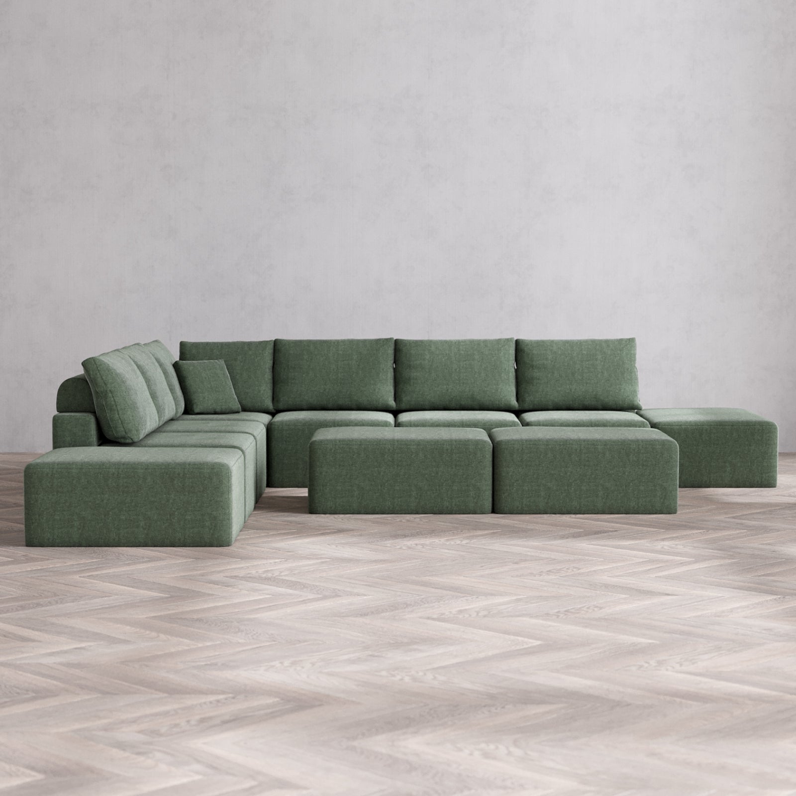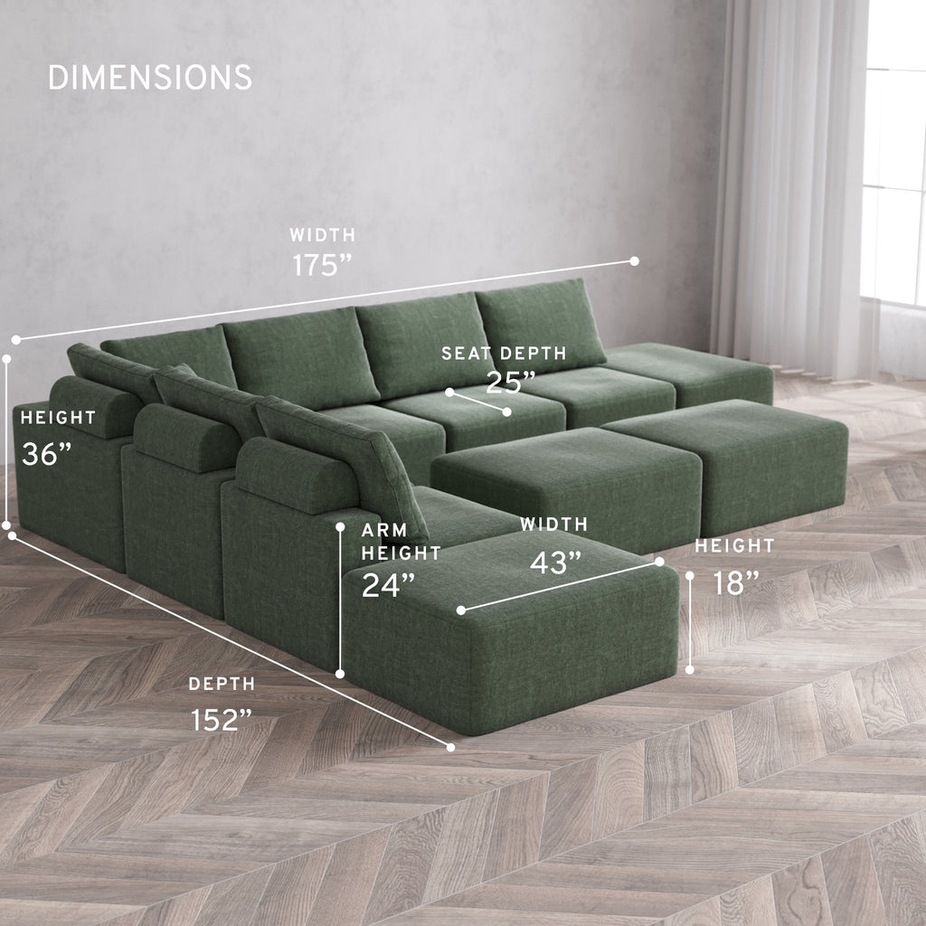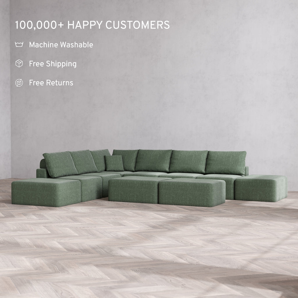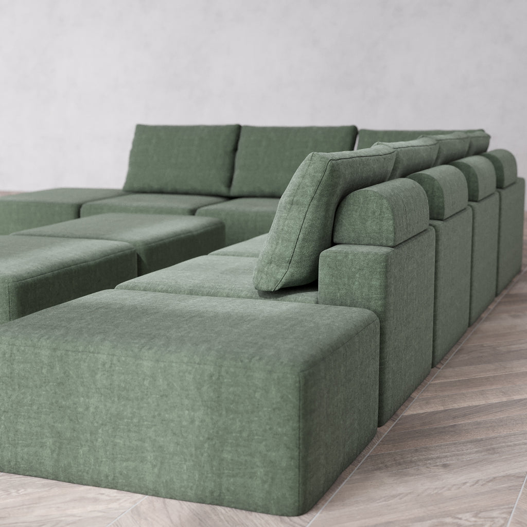 Modular Washable 8-Seater Open-Ends Corner Sectional + Chaise Ottoman Bench Cloud + Bolster Sofa | Heirloom Velvet in Sage