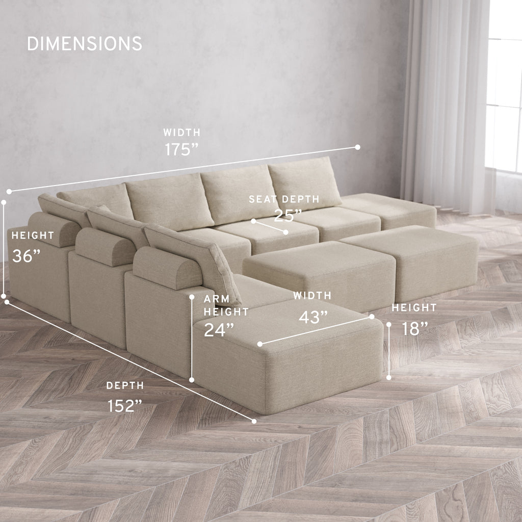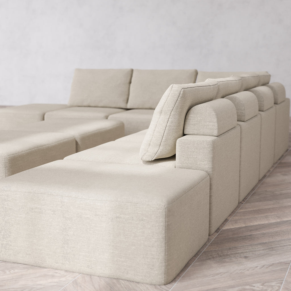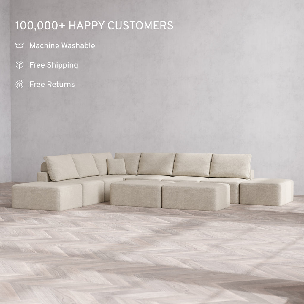 Modular Washable 8-Seater Open-Ends Corner Sectional + Chaise Ottoman Bench Cloud + Bolster Sofa | Plush Twill in Sandstone