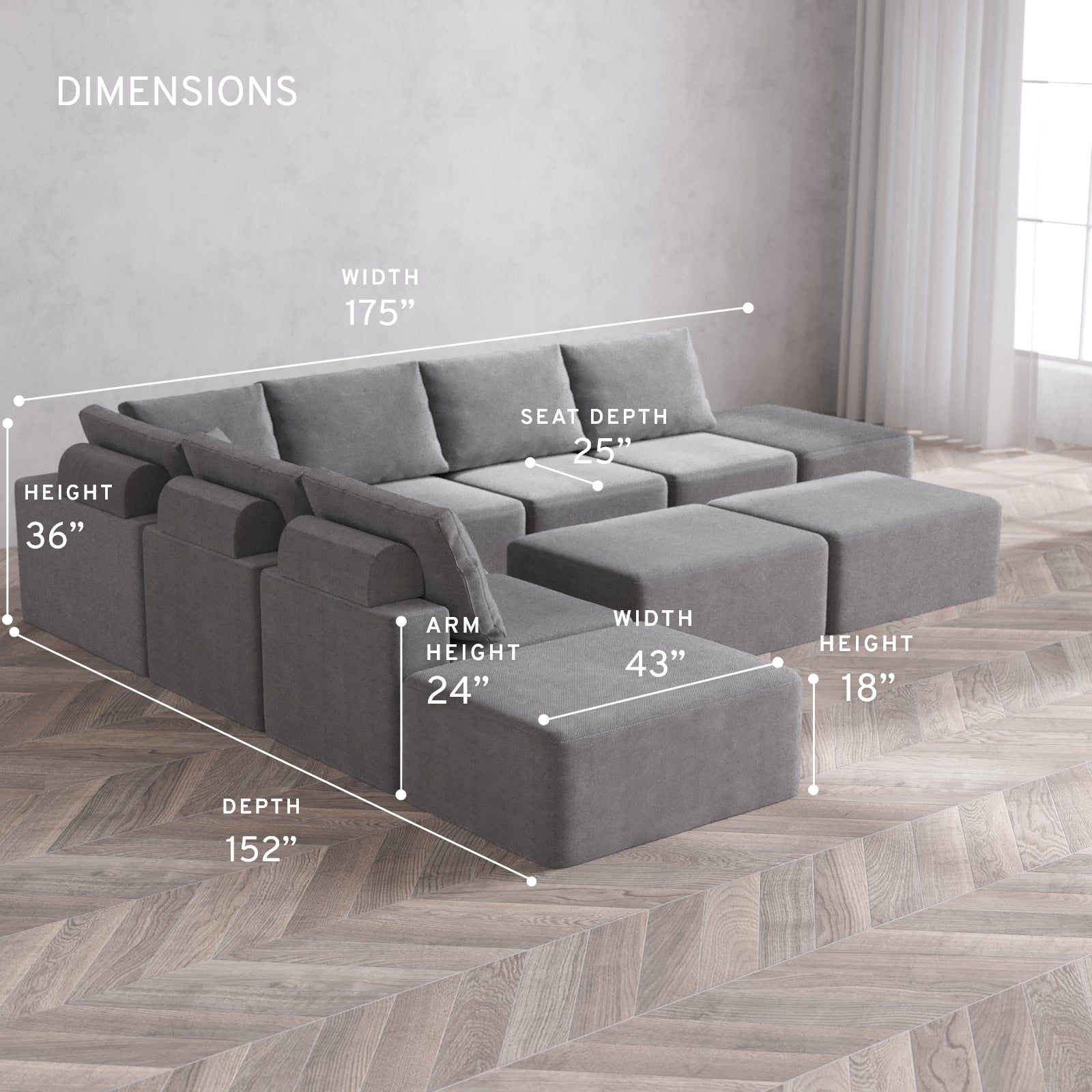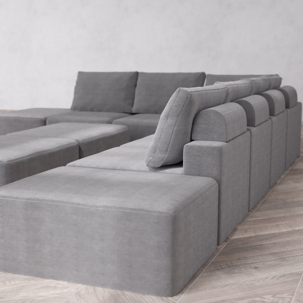 Modular Washable 8-Seater Open-Ends Corner Sectional + Chaise Ottoman Bench Cloud + Bolster Sofa | Lux Weave in Slate