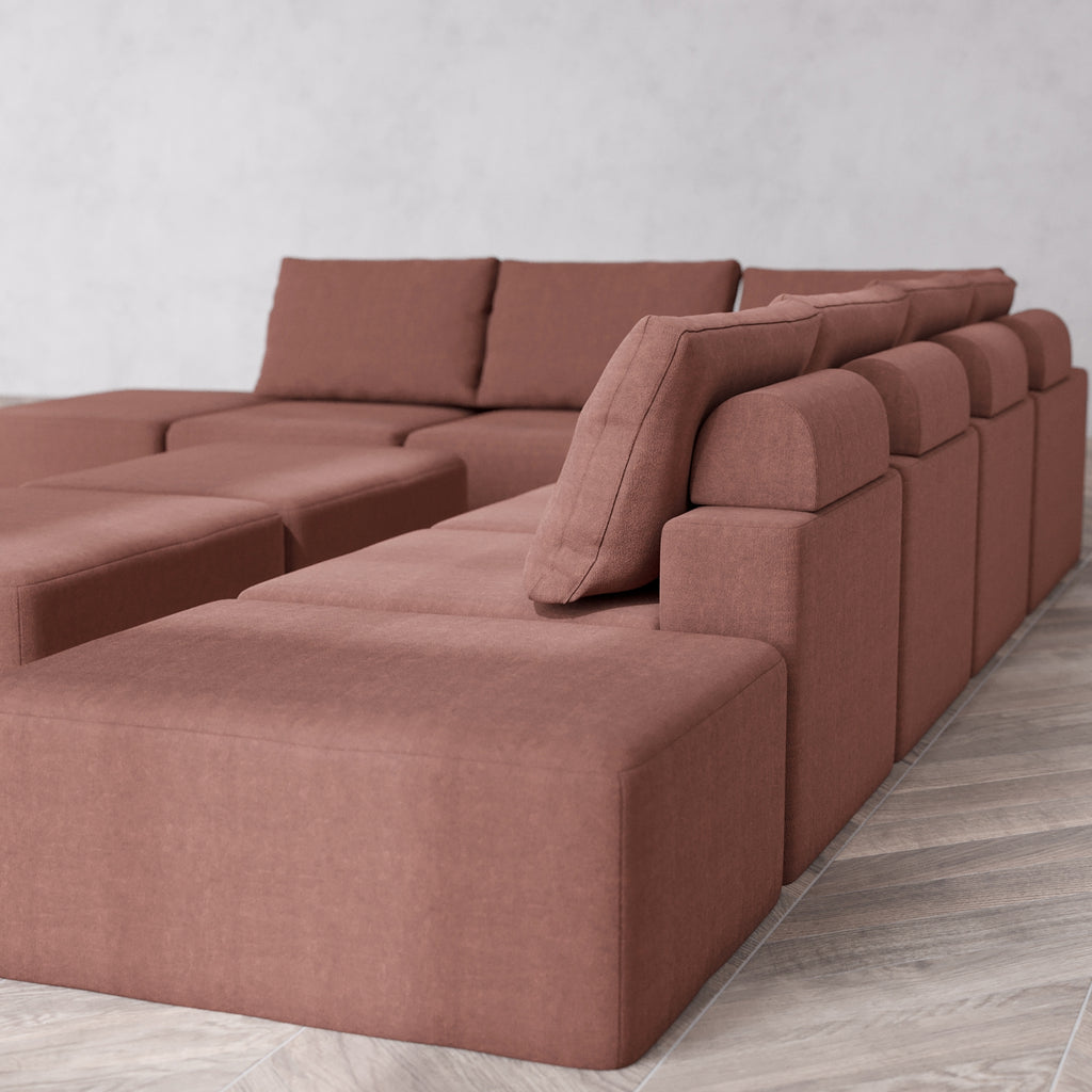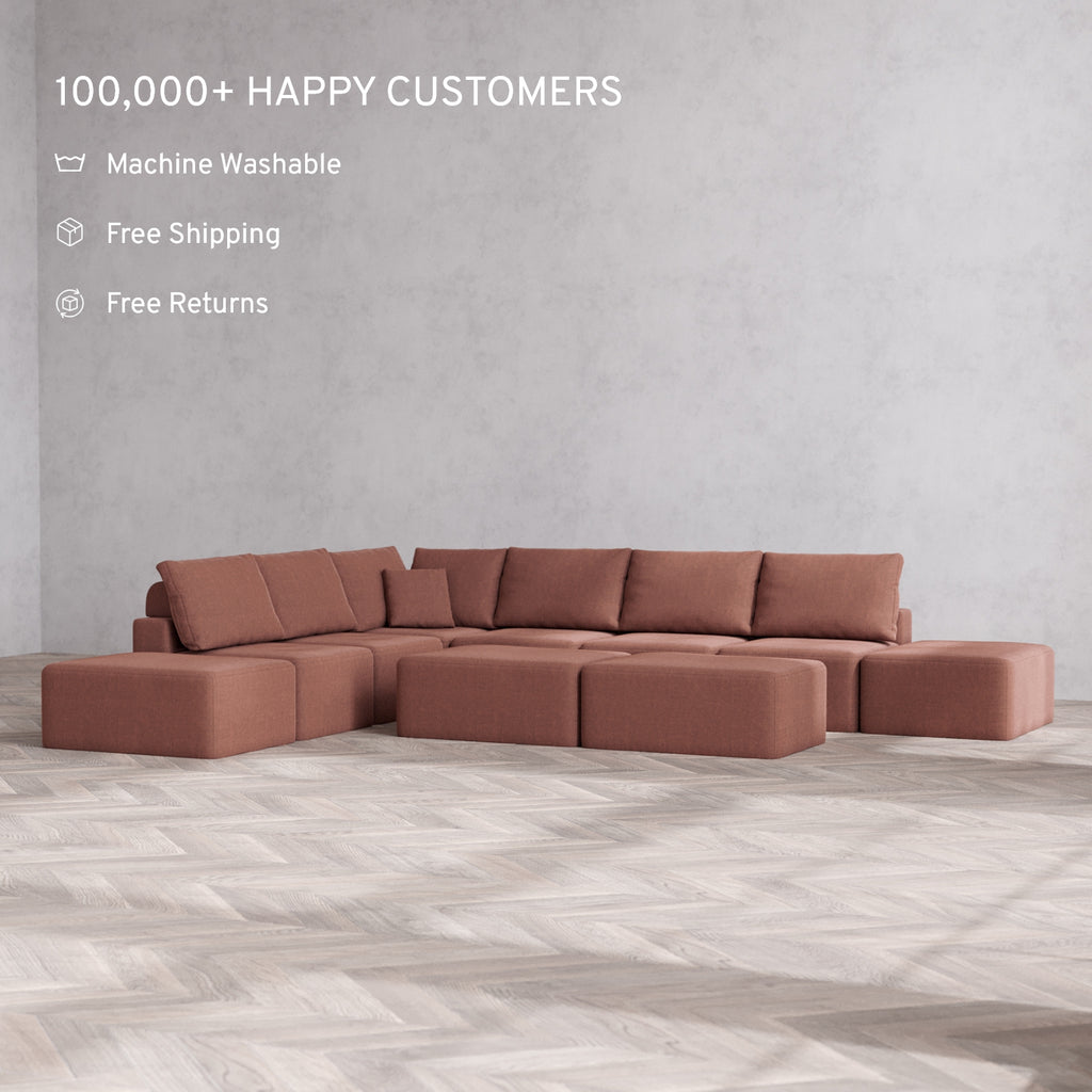 Modular Washable 8-Seater Open-Ends Corner Sectional + Chaise Ottoman Bench Cloud + Bolster Sofa | Heirloom Velvet in Sumac