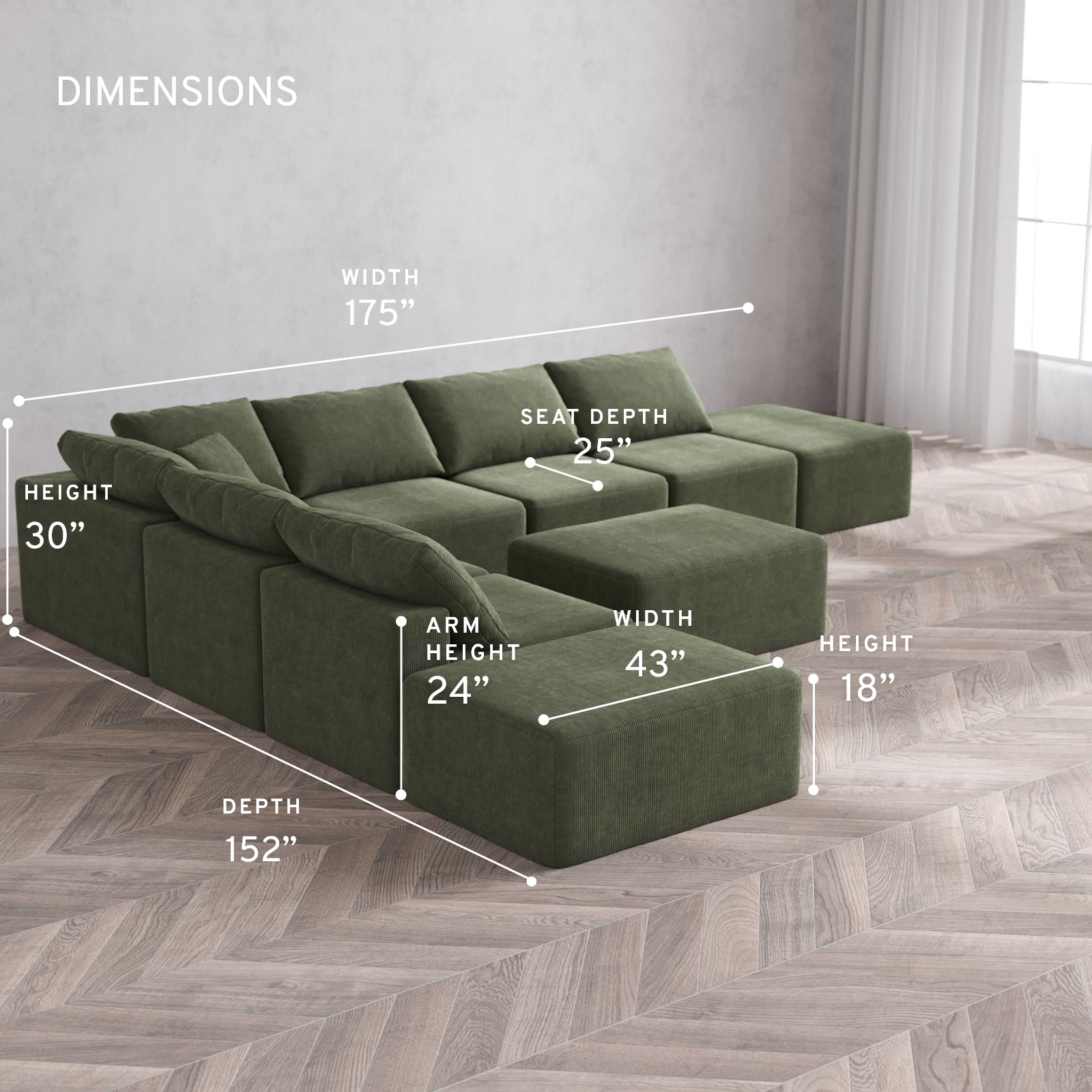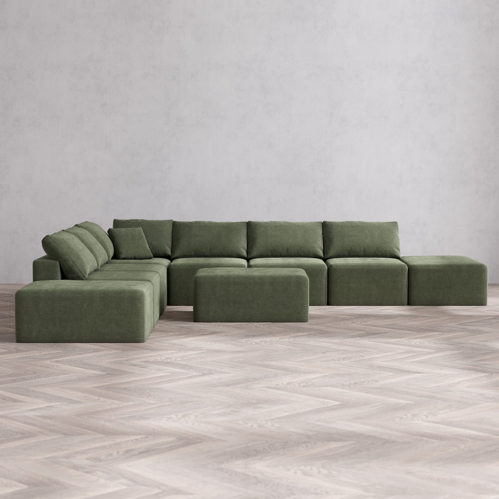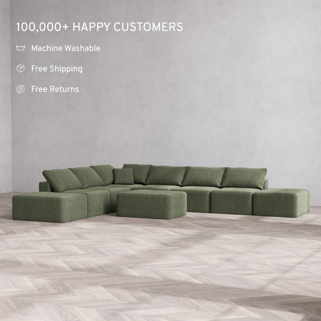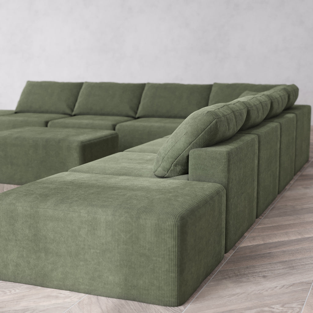 Modular Washable 8-Seater Open-Ends Corner Sectional + Chaise Ottoman Cloud Sofa | Luxe Corduroy in Juniper