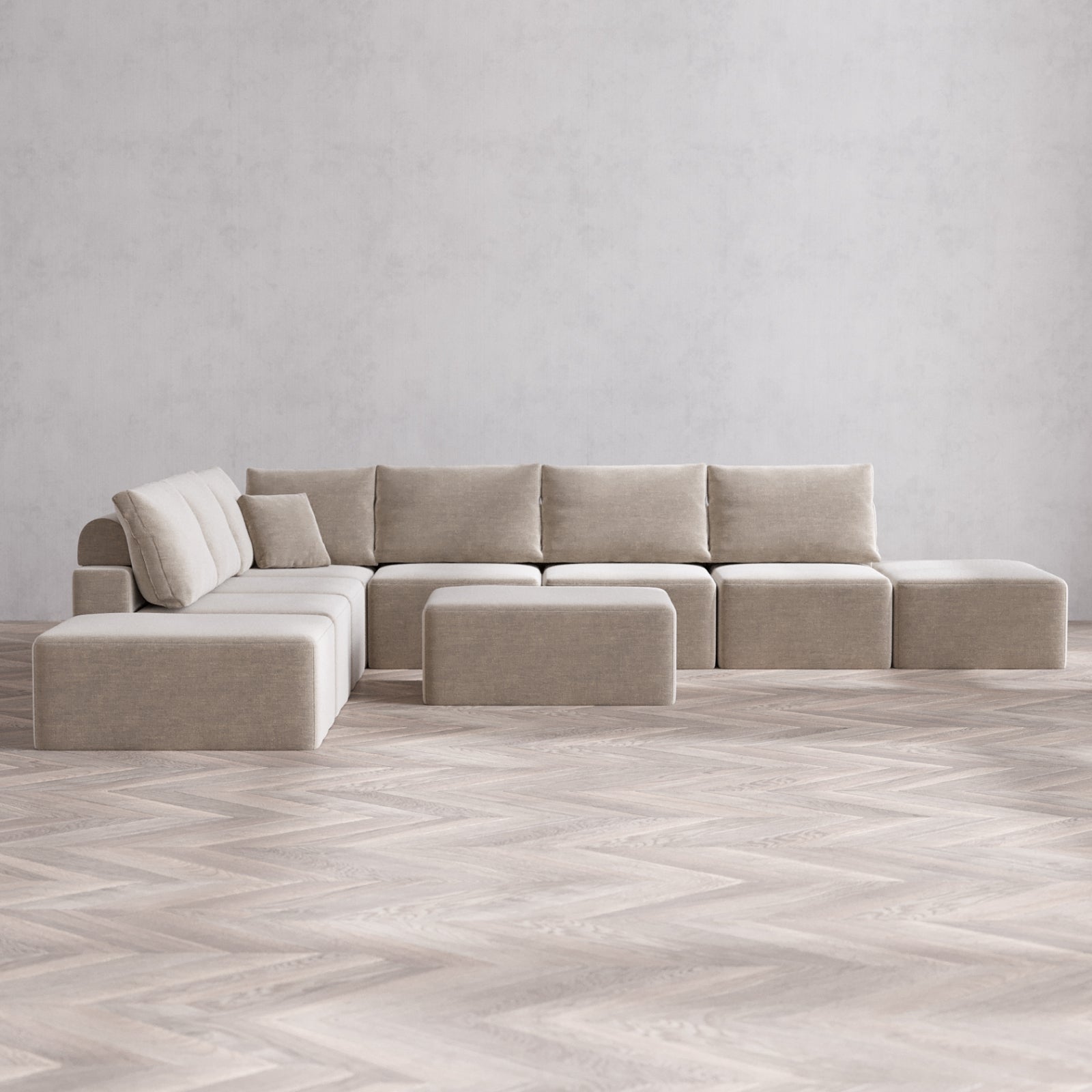 Modular Washable 8-Seater Open-Ends Corner Sectional + Chaise Ottoman Cloud + Bolster Sofa | Satin Velvet in Caraway